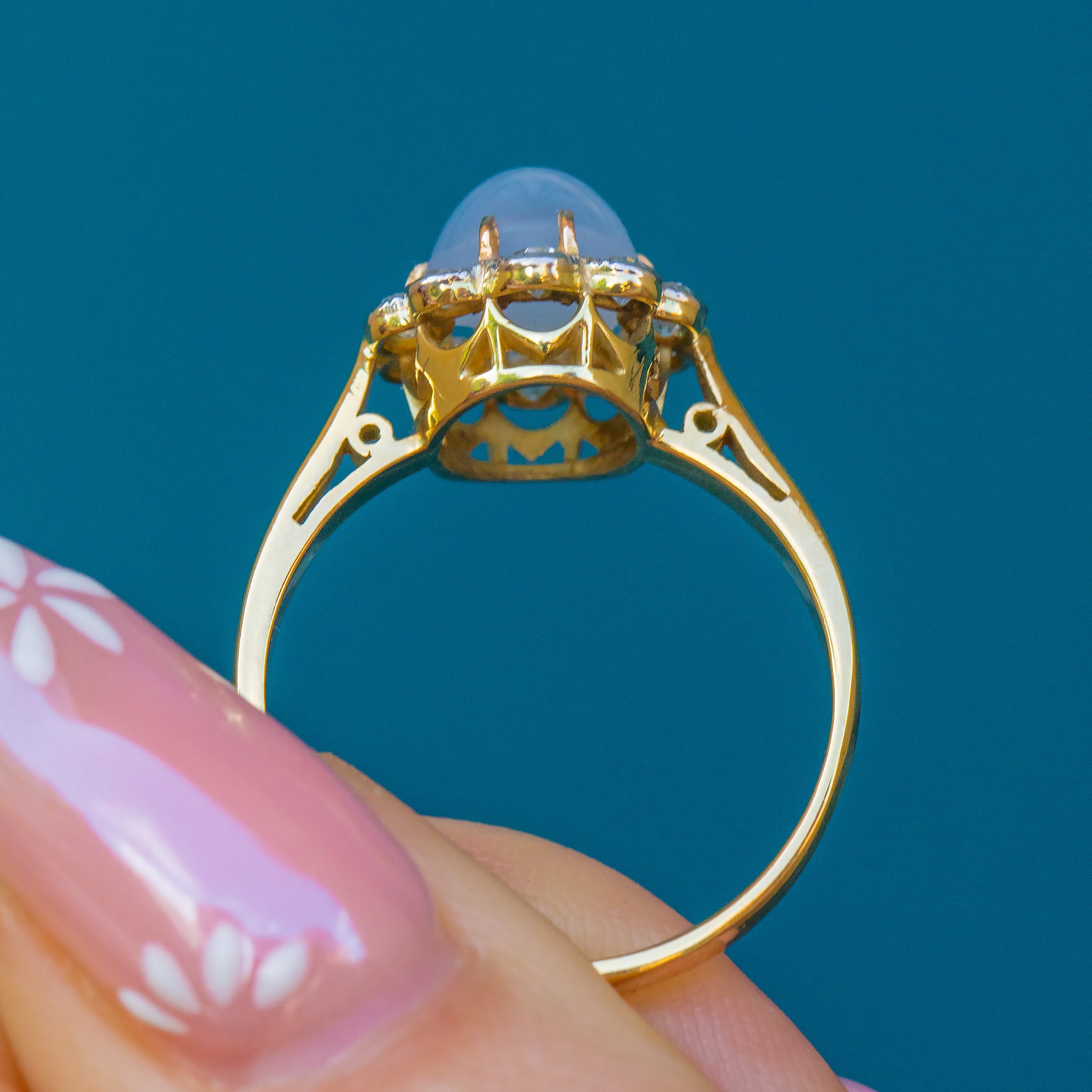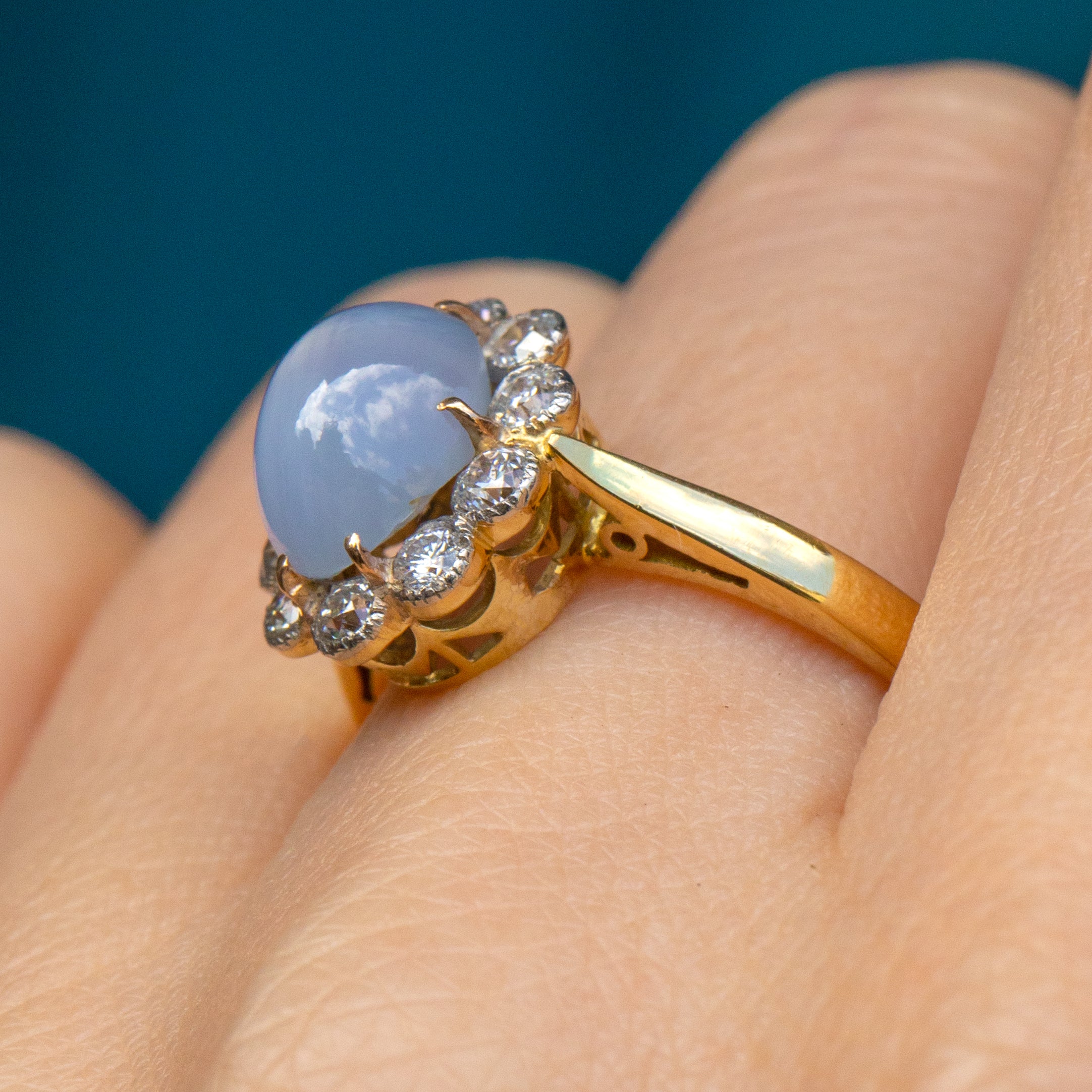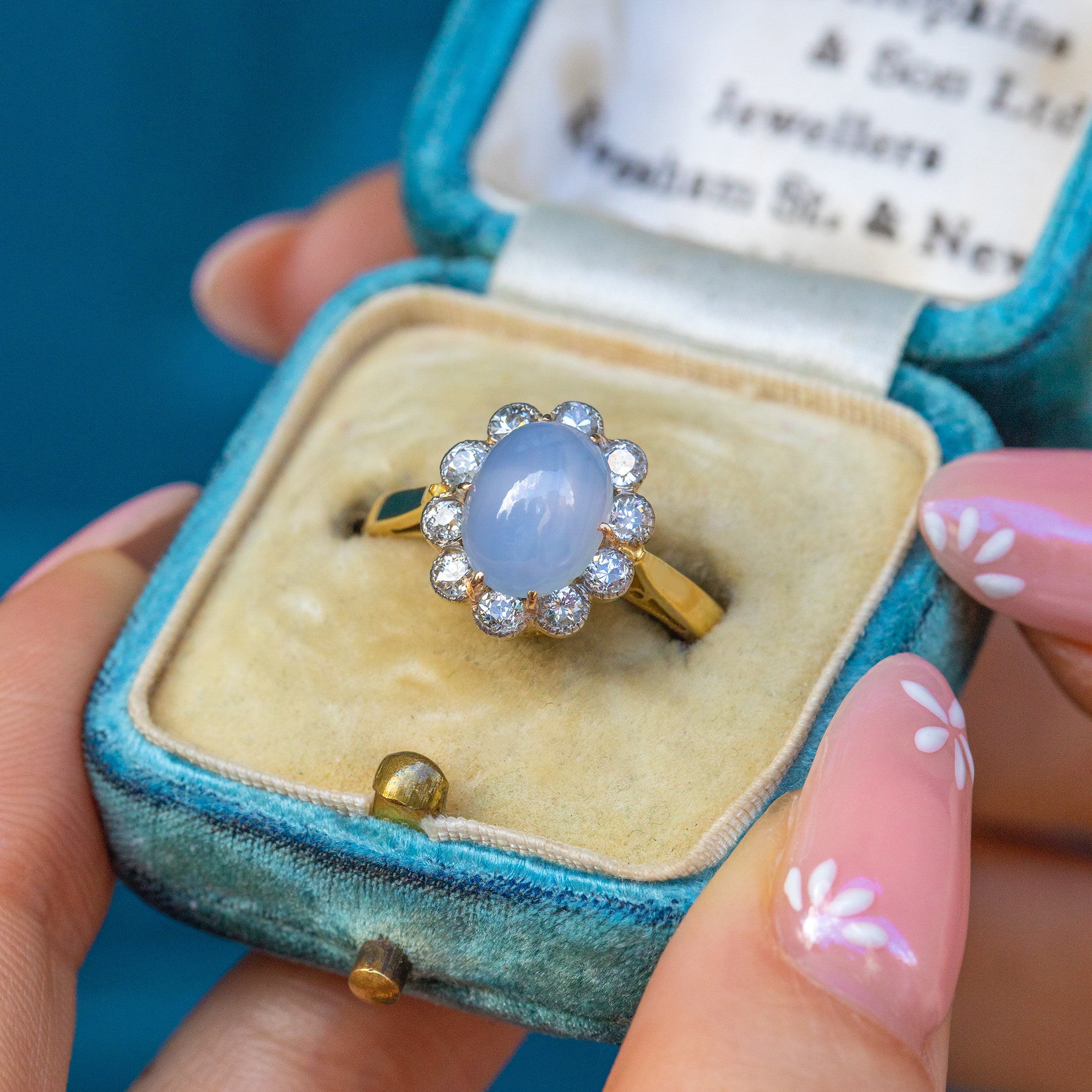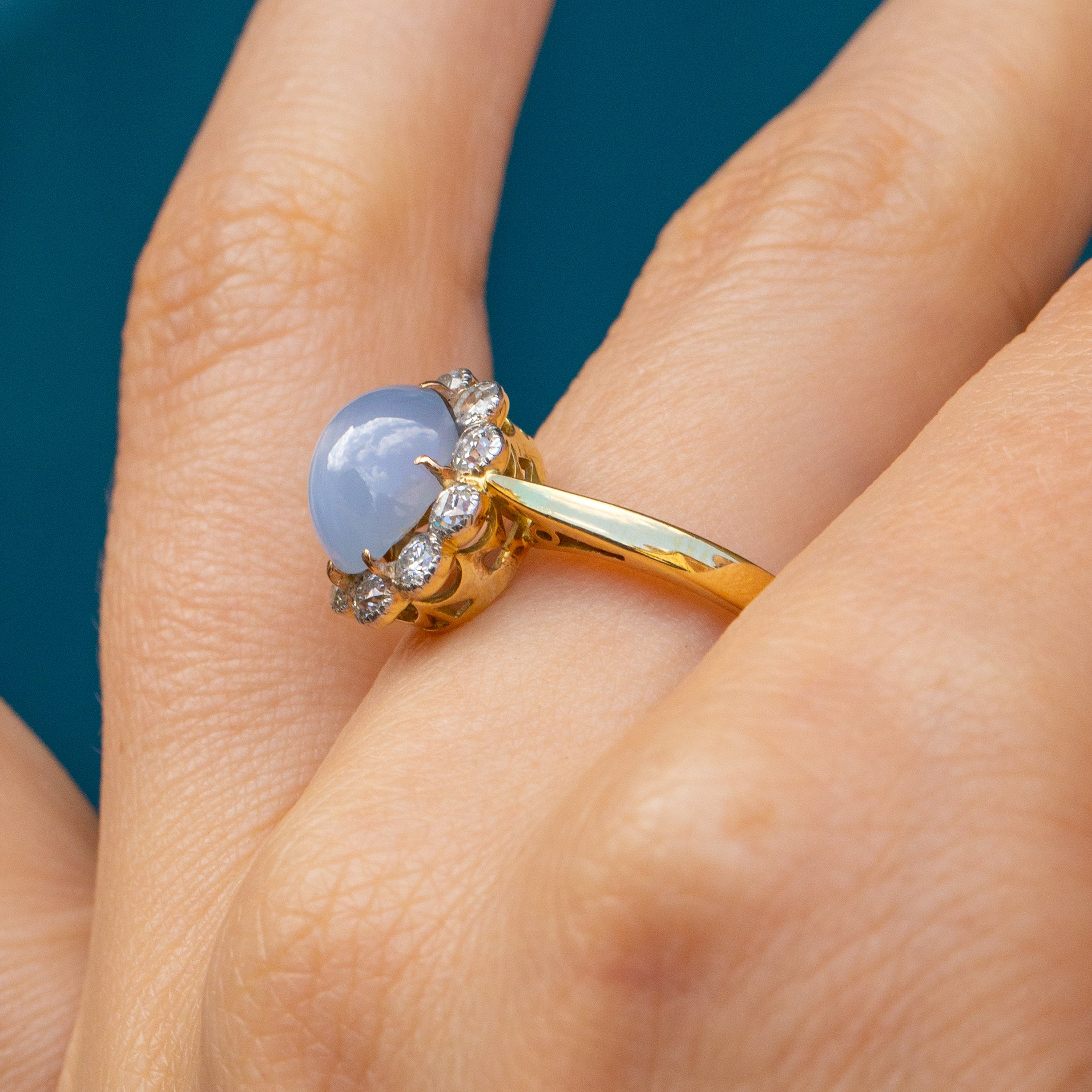 The 'star' effect visible in this gem, also known as asterism, is caused by light refracting off rutile silk inclusions, creating the star-like reflection that celestial lovers dream of. A sea of scintillating Diamonds halo the show-stopping Sapphire, creating a soft scallop edge that emanates floral femininity.
