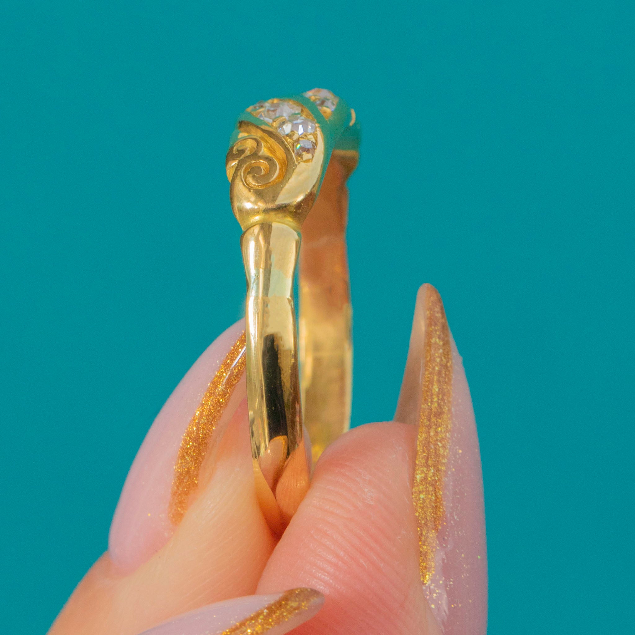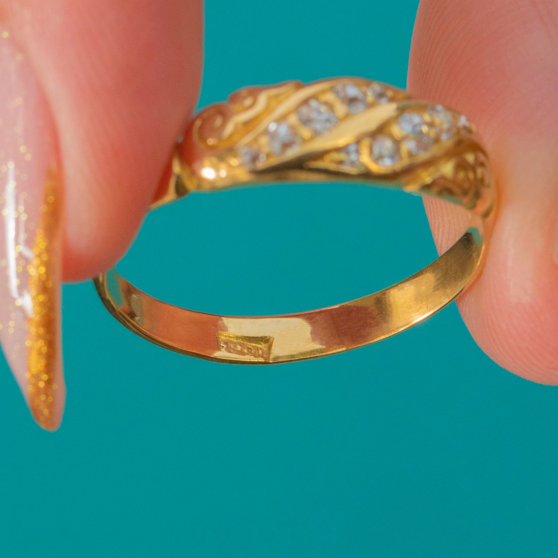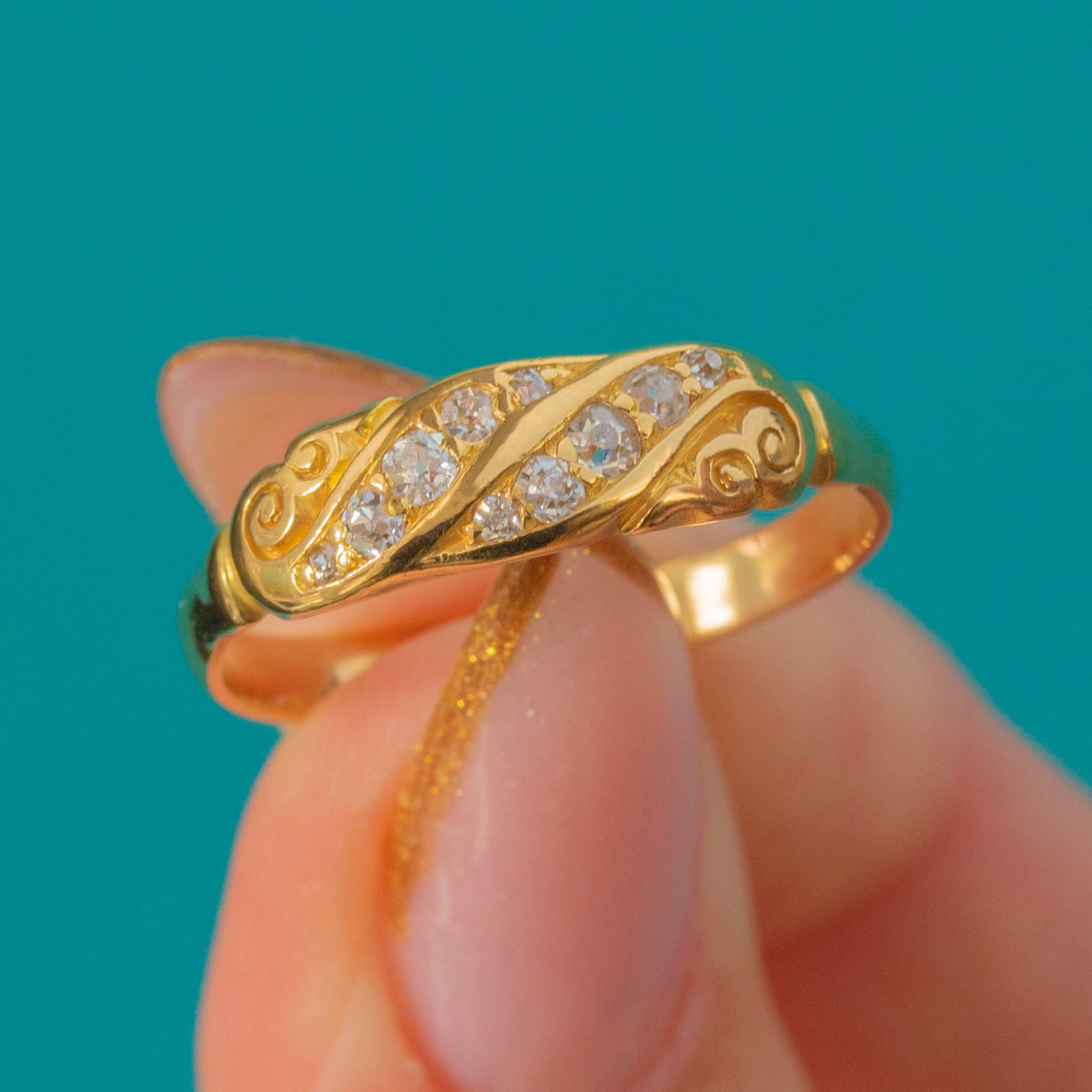 This elegant Victorian crossover ring is crafted in rich 18ct Gold and features a sensuous band set with a sparkling line of old-cut Diamonds. The scrolling shoulders and gently twisted form create a romantic sense of movement typical of late 19th-century design.