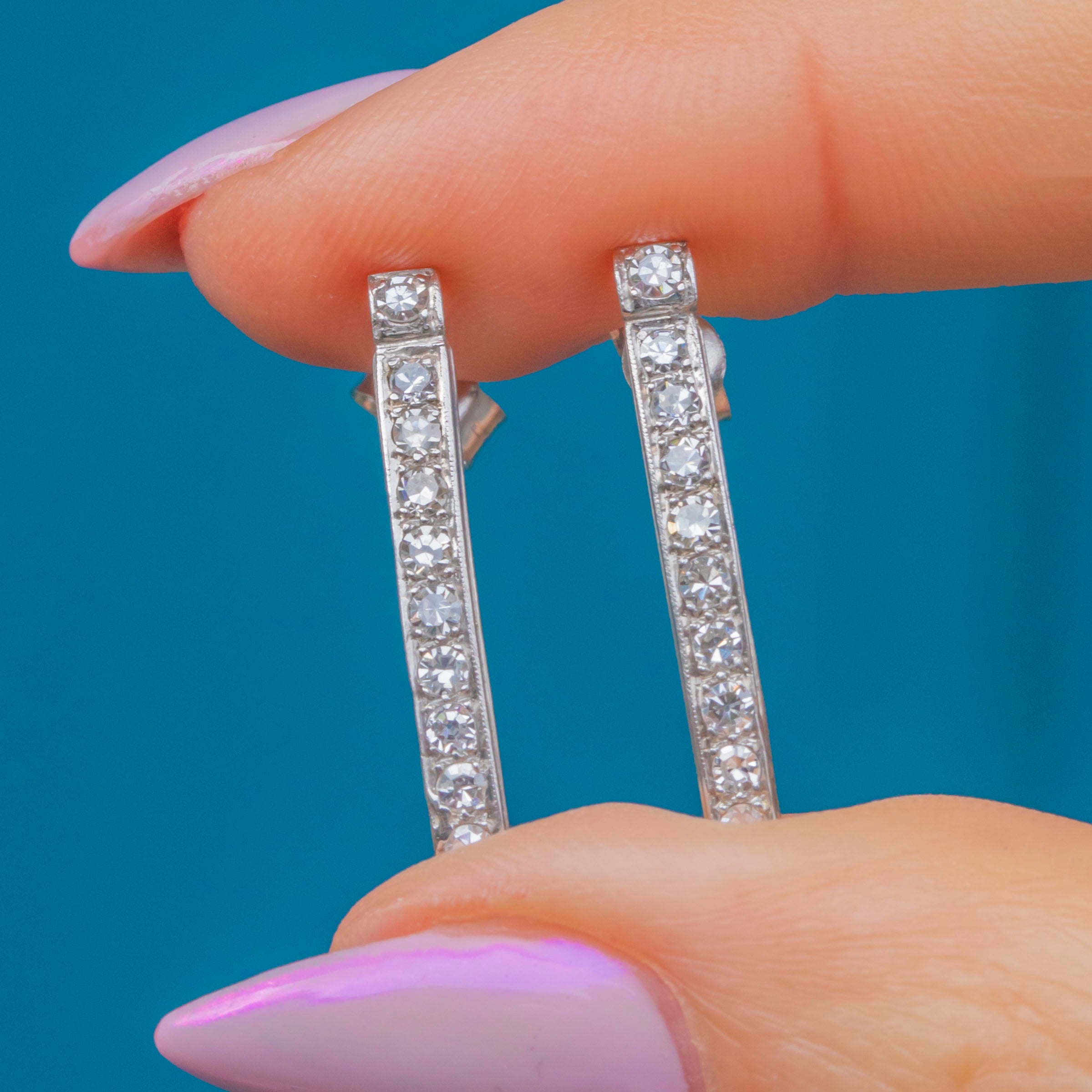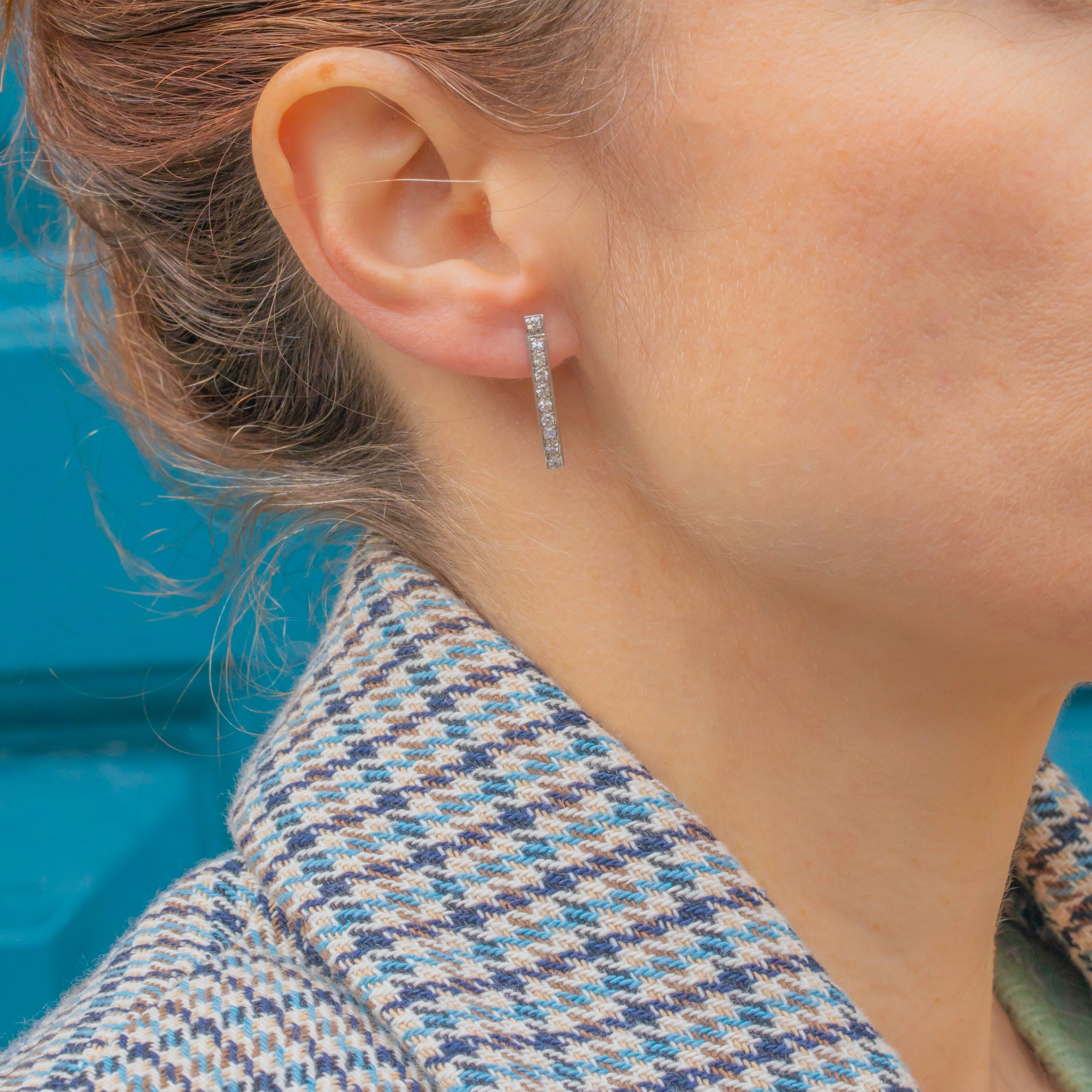 These elegant vintage bar earrings are crafted in rhodium-plated 18ct White Gold and set with sparkling Diamonds totalling approximately 0.60ct. Each earring features a sleek vertical line of bright 2mm Diamonds, creating a refined and timeless look that catches the light beautifully.