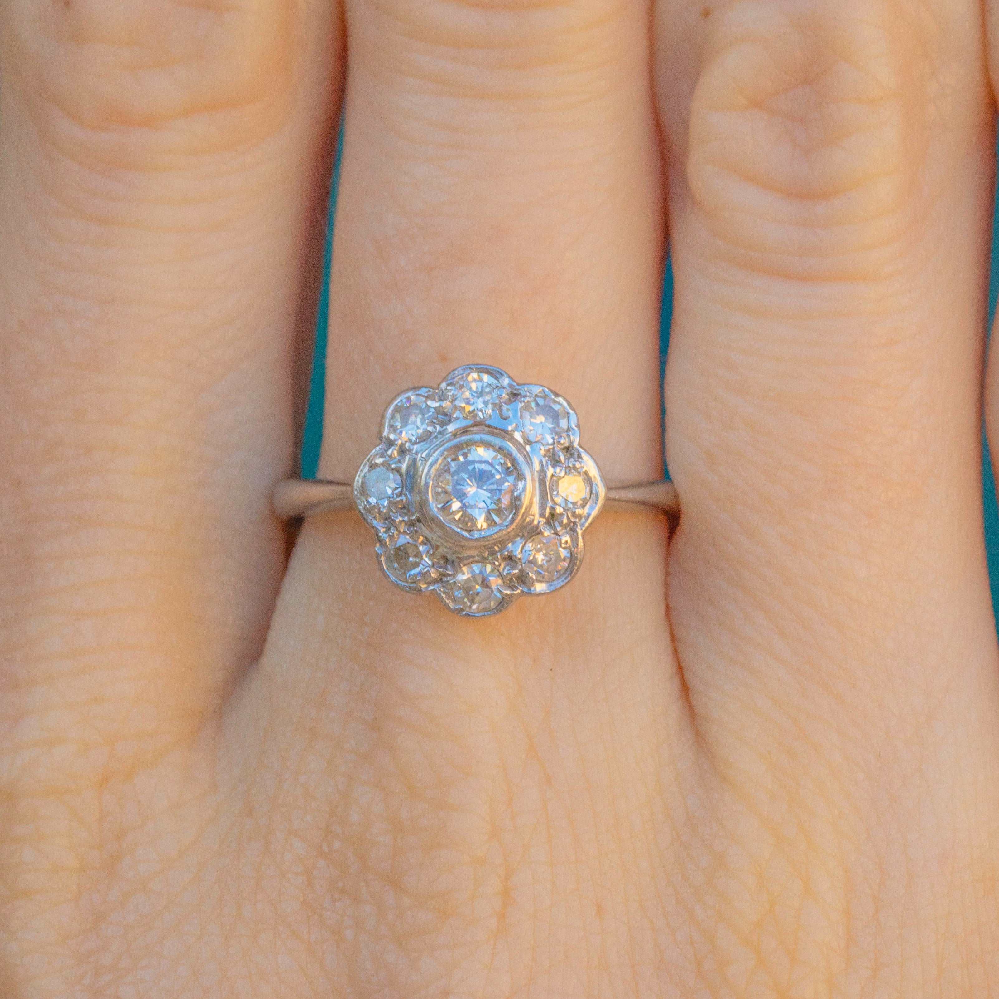 VERY GOOD-EXCELLENT. This 18ct White Gold Diamond daisy cluster ring is in wonderful condition. Each Diamond is securely set and free from damage, possessing a brilliantly bright sparkle to delight its wearer. Her 18ct White Gold shank is also in glorious condition, free from dings, dents or scratches. There is some evidence of resizing in the past, however this is not visible during wear. A distinctly feminine beauty to add to your collection!