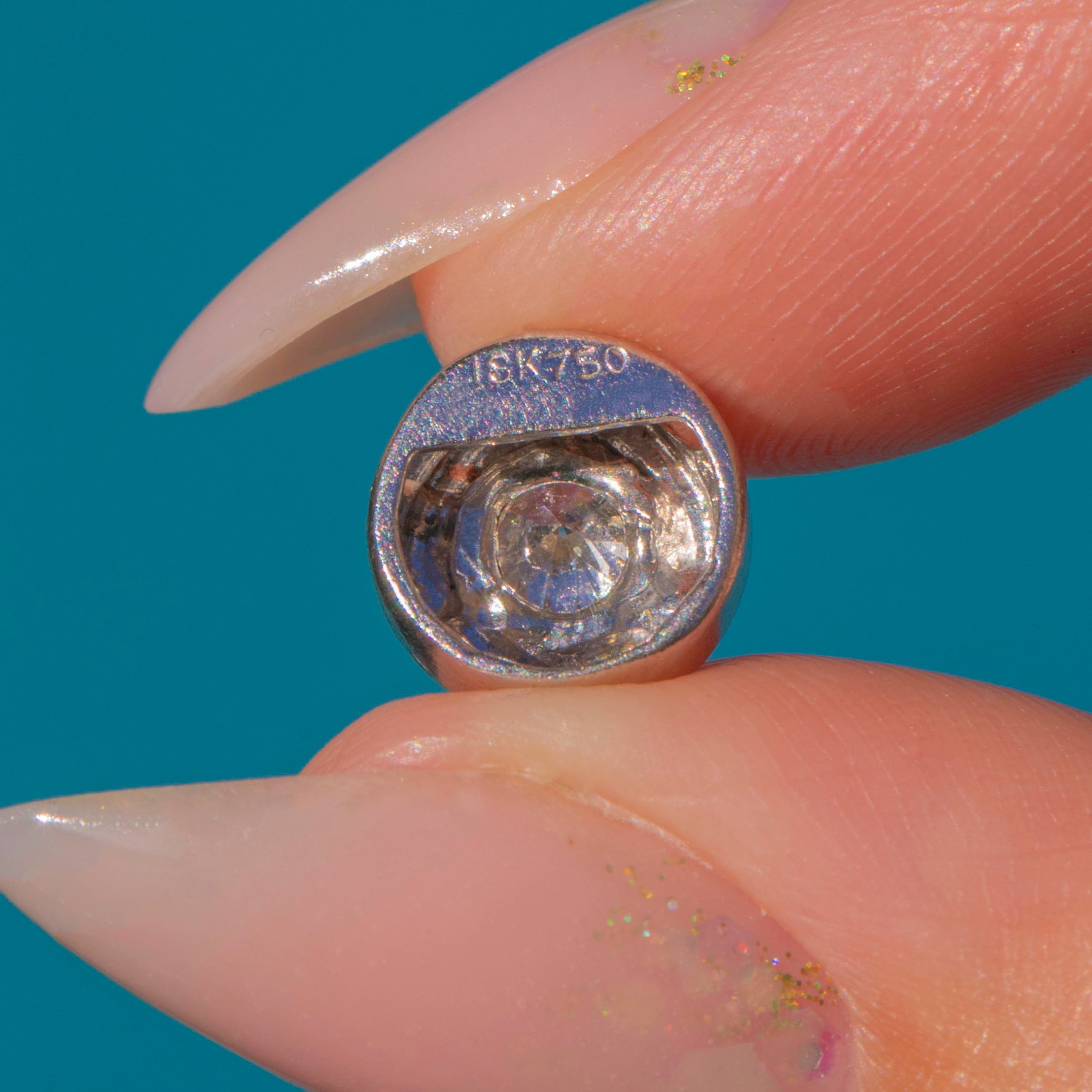 Sleek and wearable, this Vintage Diamond slider is crafted in 18ct White Gold with a minimalist, modern look. The softly domed form is gypsy-set with a bright round brilliant-cut Diamond that sits flush to the surface, giving a clean sparkle that works with everything.