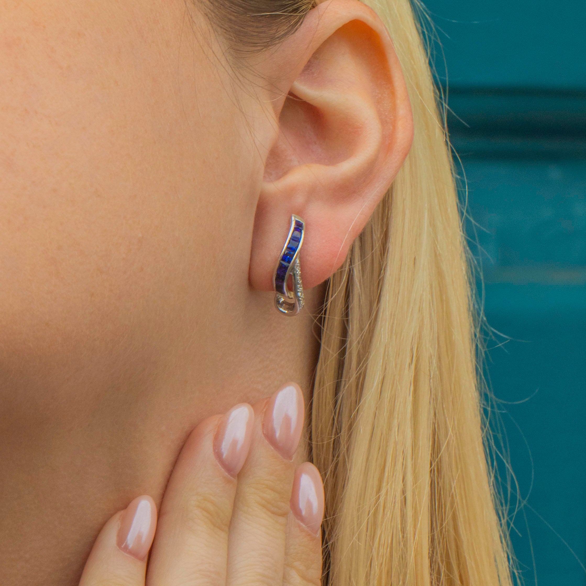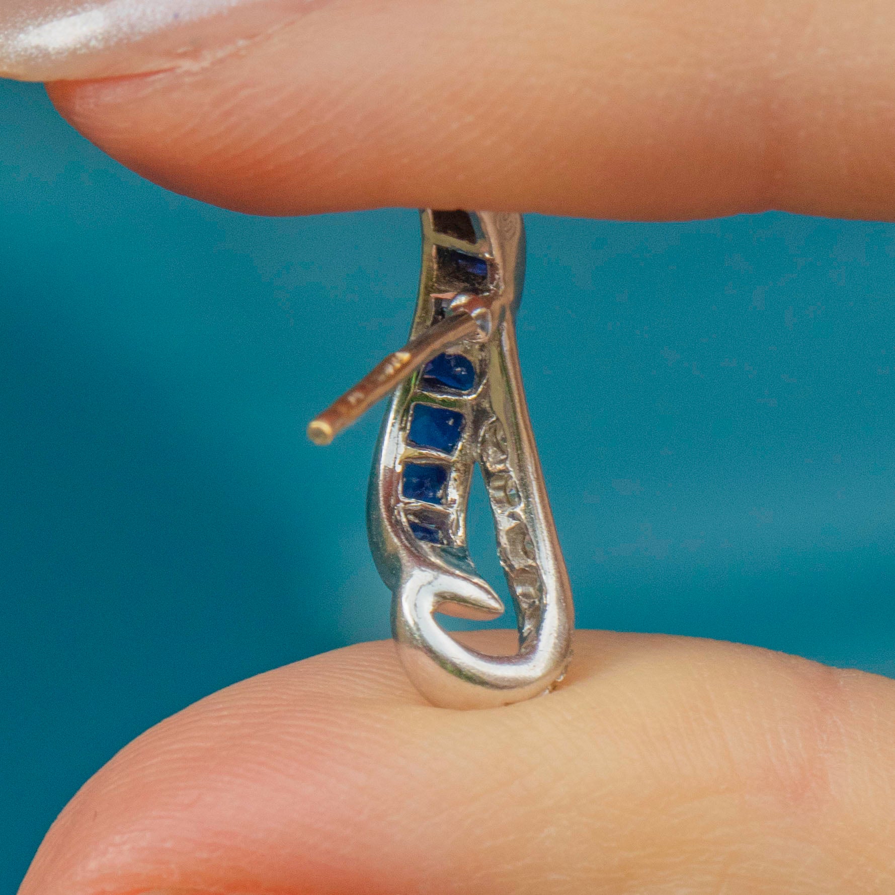 Pop these 18ct white Gold Sapphire Diamond twist earrings into your ears and embrace their elegant charm! Akin to two strands of ribbon, these Vintage earrings effortlessly caress the shape of your lobe, inlaid with a row of midnight blue Sapphires and crisp white Diamonds that catch the light beautifully.