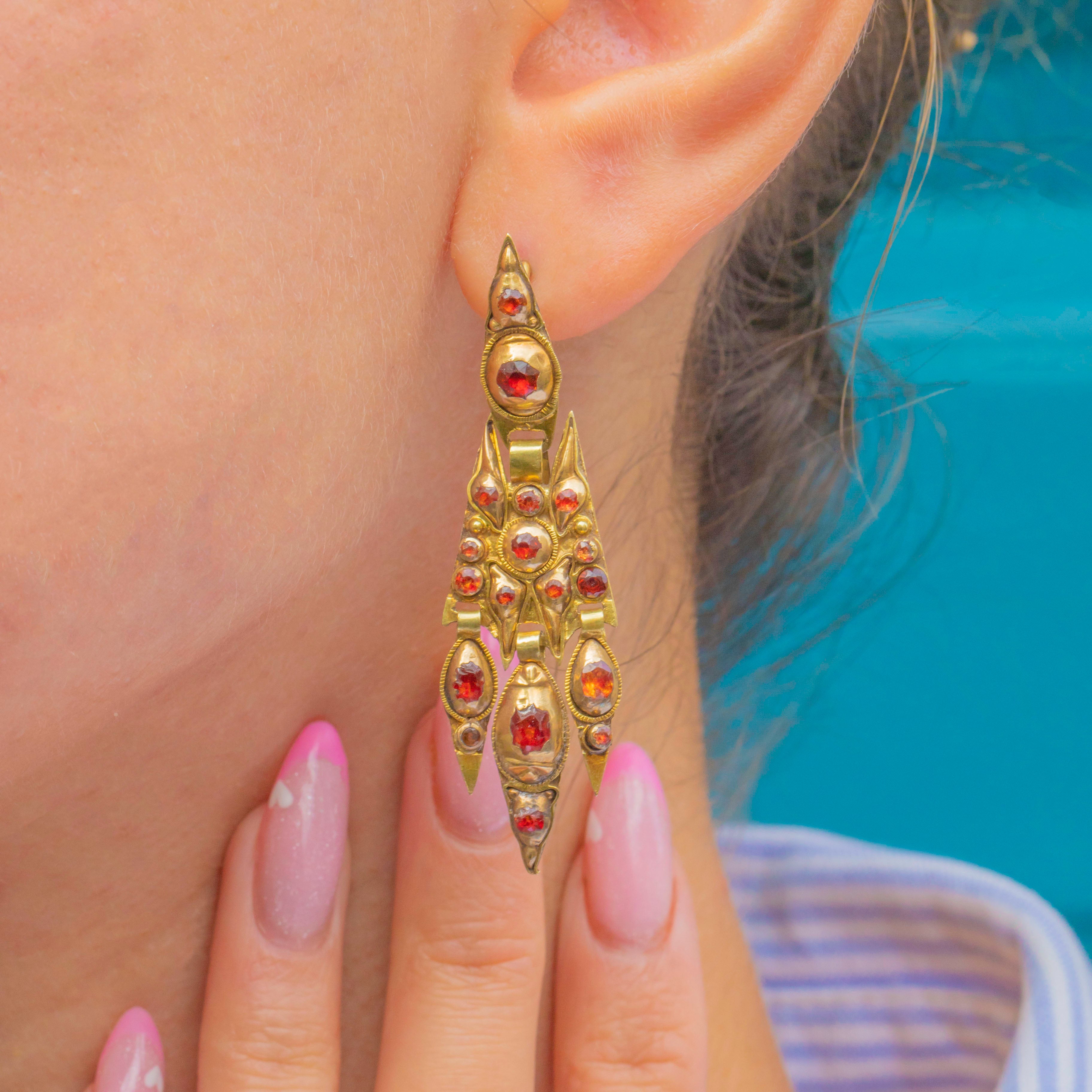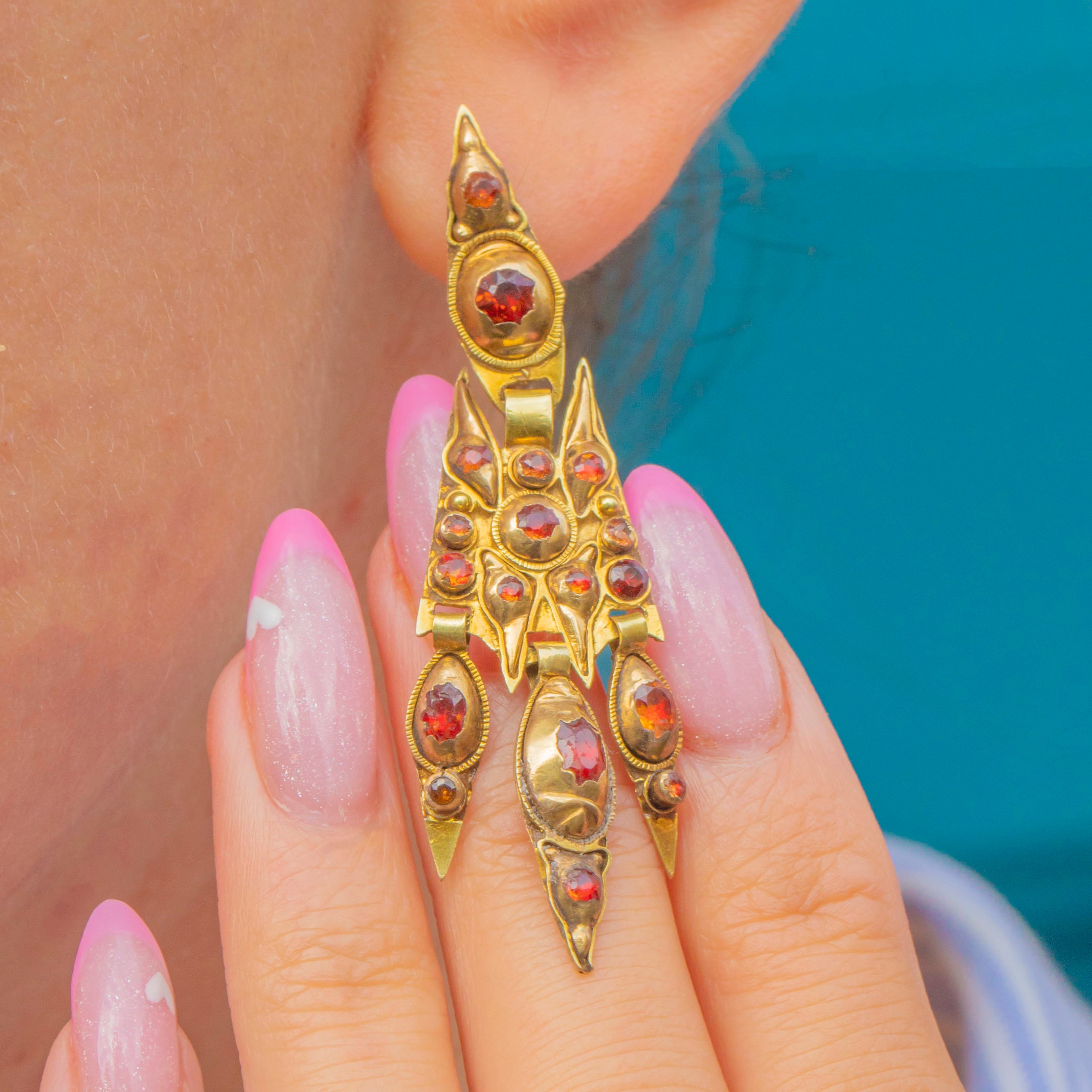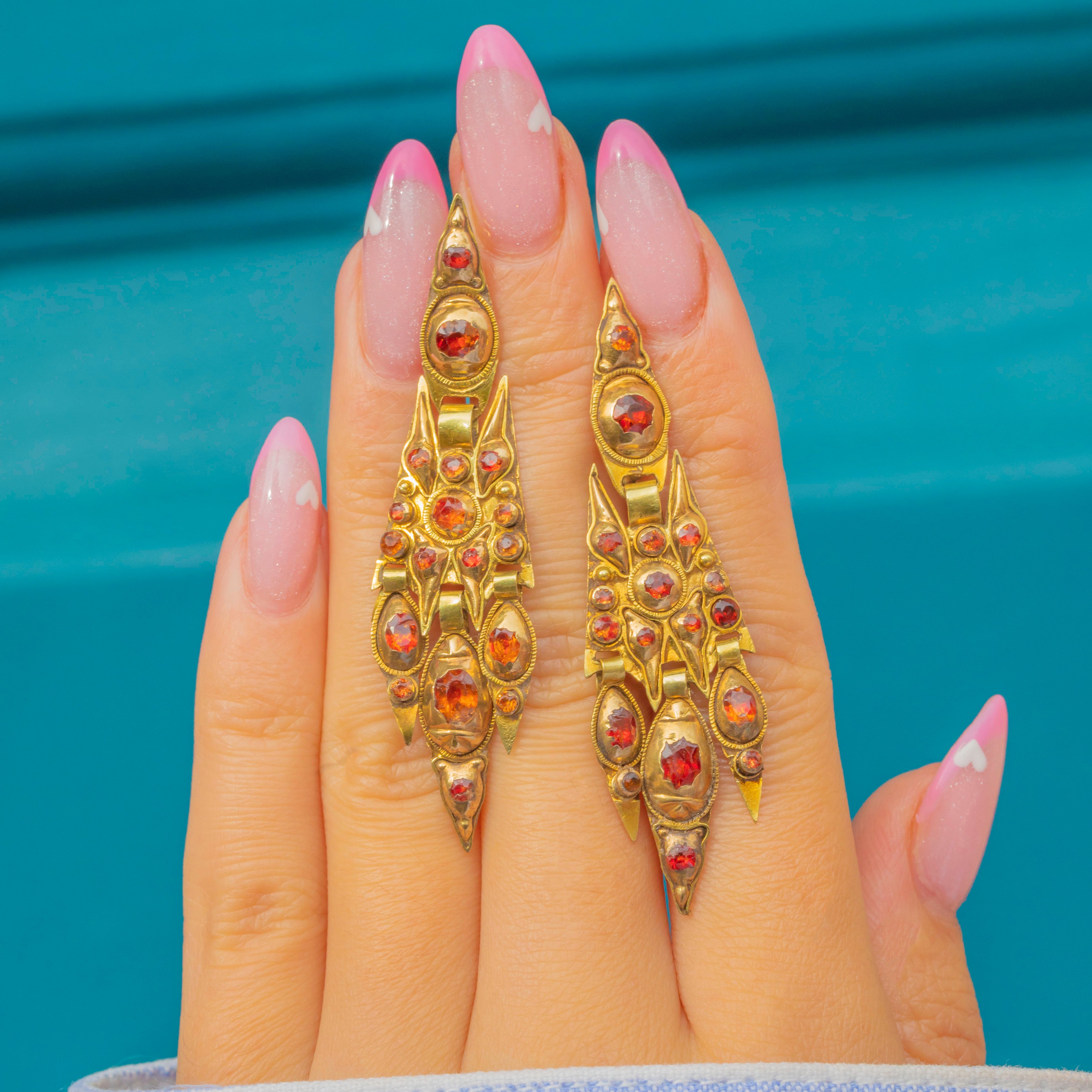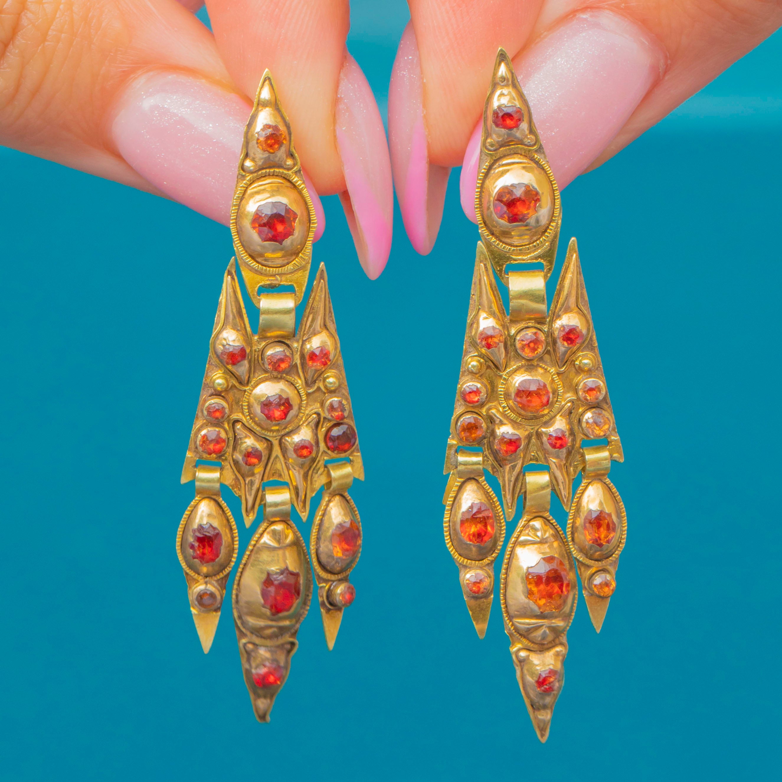 These magnificent Georgian era earrings exemplify the opulent style of the 18th-century Iberian Peninsula. Crafted in rich 18ct Gold and set with glowing natural Spessartine Garnets, they feature cascading tiers of deep reddish-orange stones that catch the light beautifully with every movement.