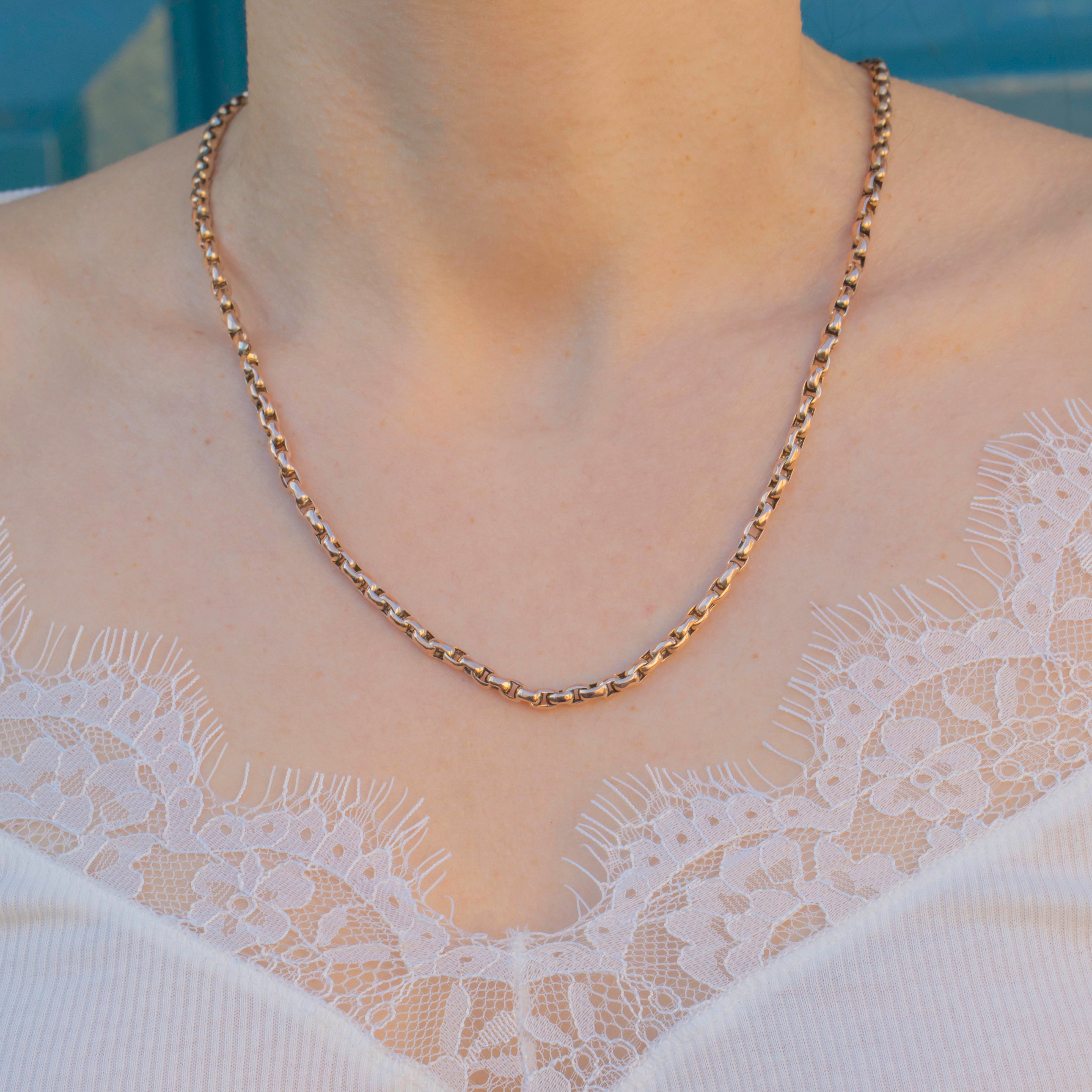 Subtle faceted details caress the the belcher links, providing an additional glimmer of subtle sparkle as this antique Gold belcher chain drapes elegantly across your décolletage!