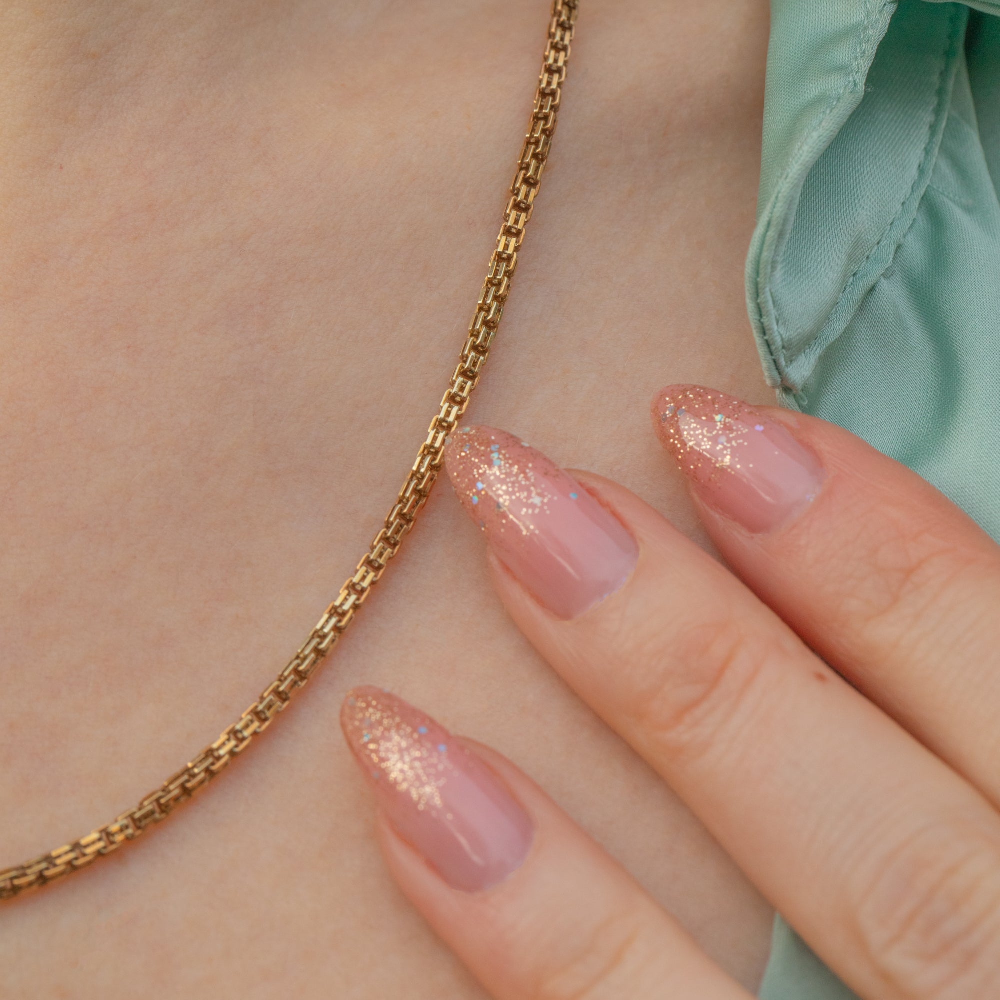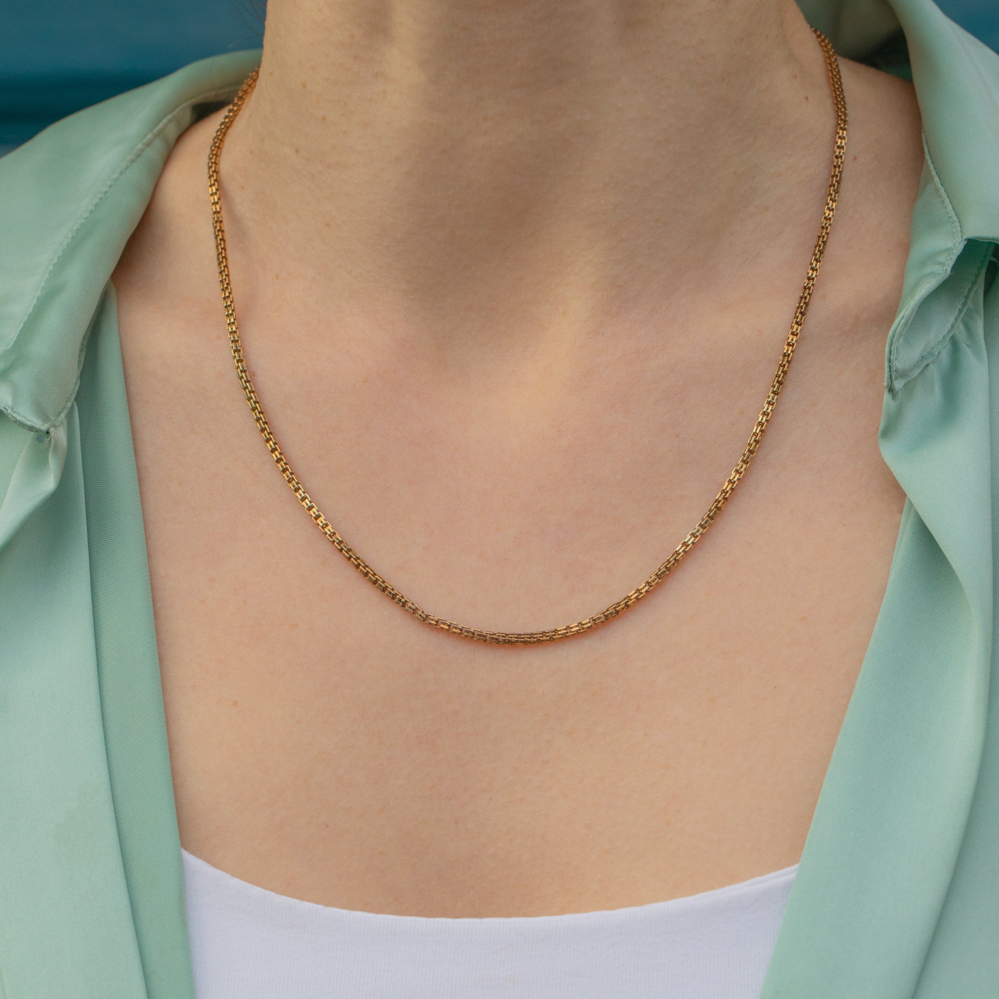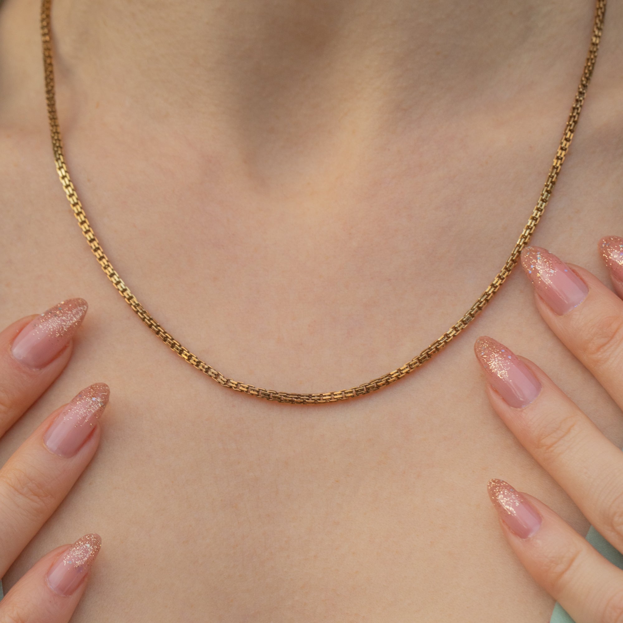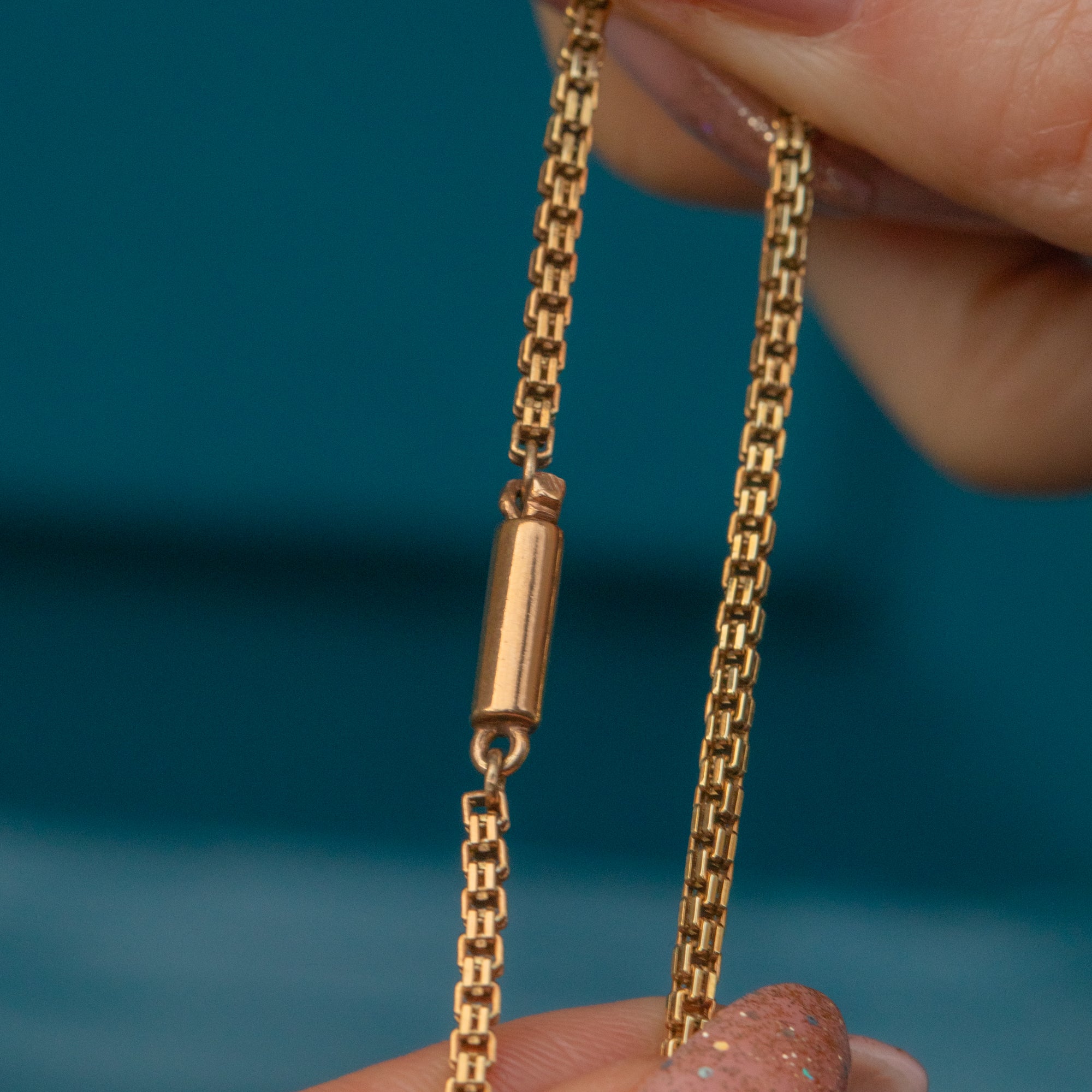 At a generous 19" long, this antique Gold box chain is perfect for layering with other chains, suspending pendants, or simply being worn alone for a subtle flash of Gold. A staple for your jewellery box, this versatile piece is a must-have!