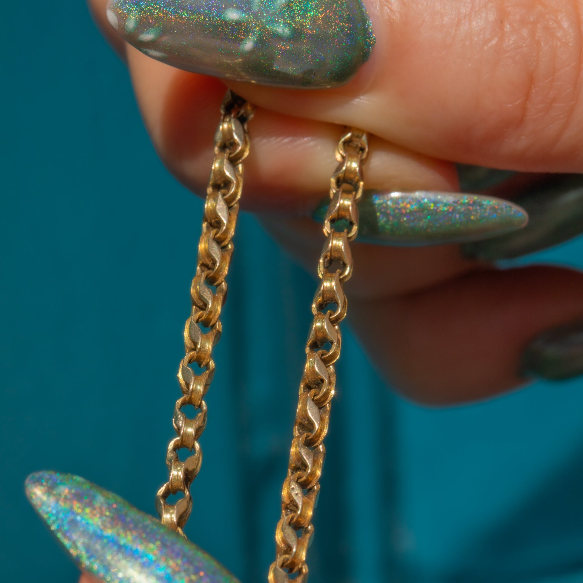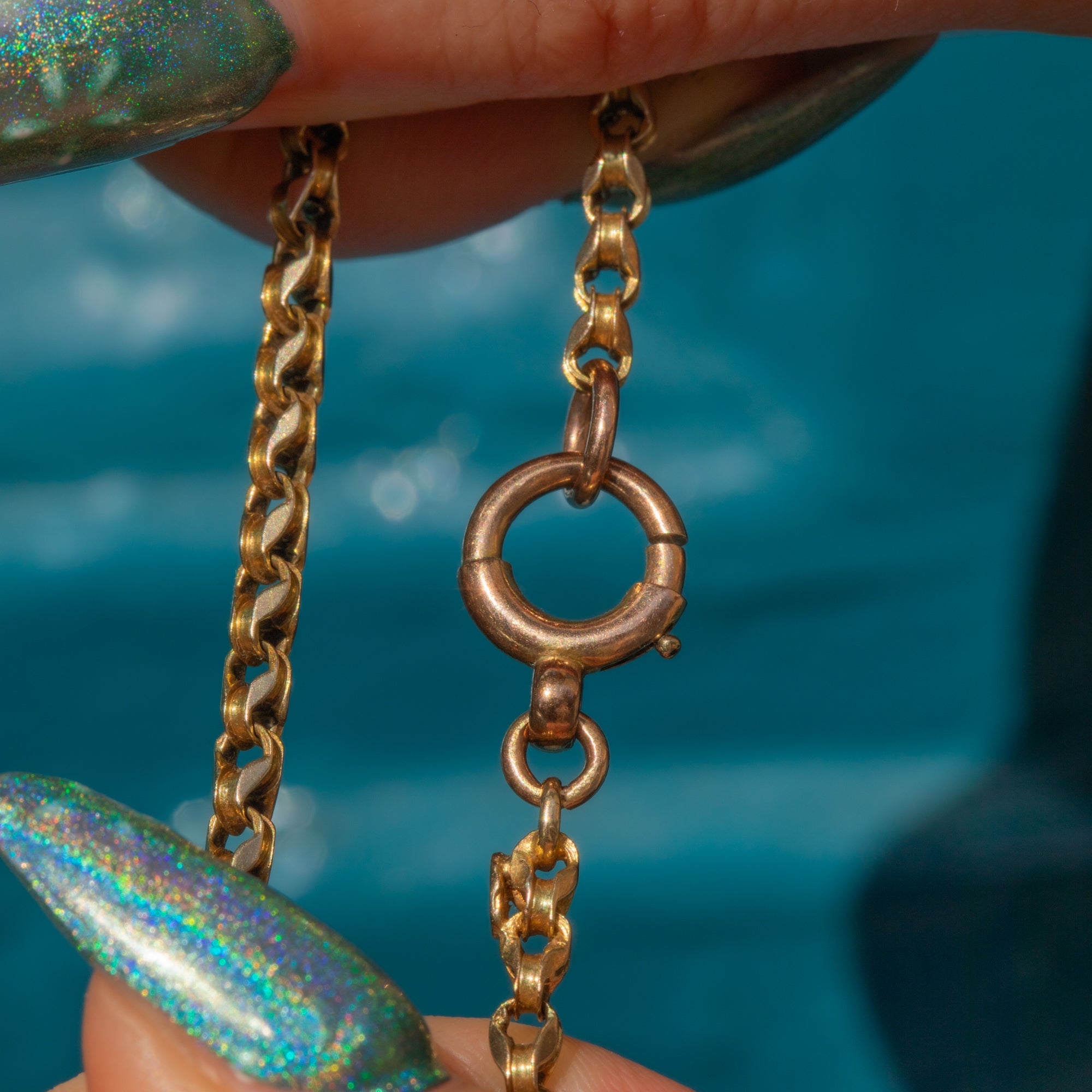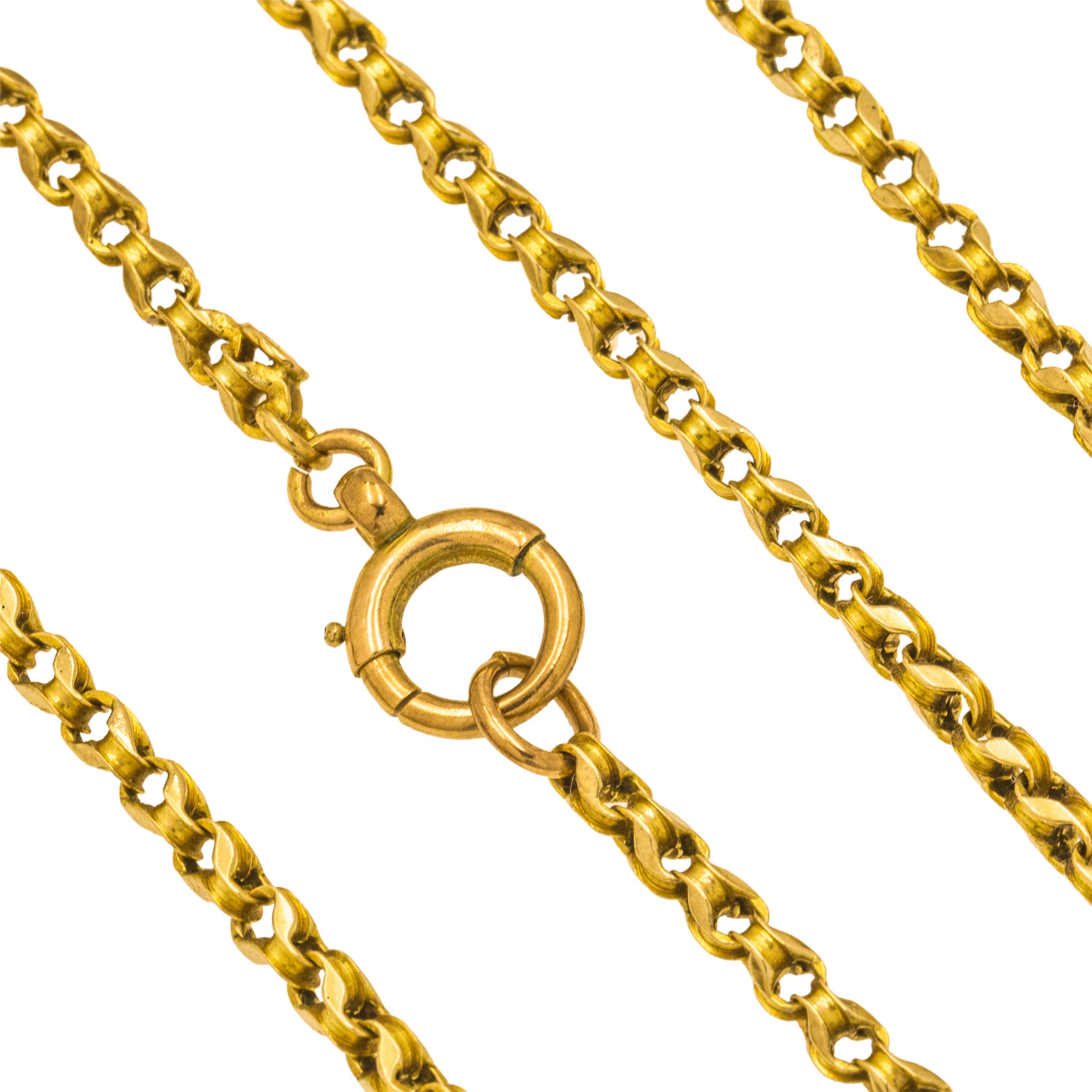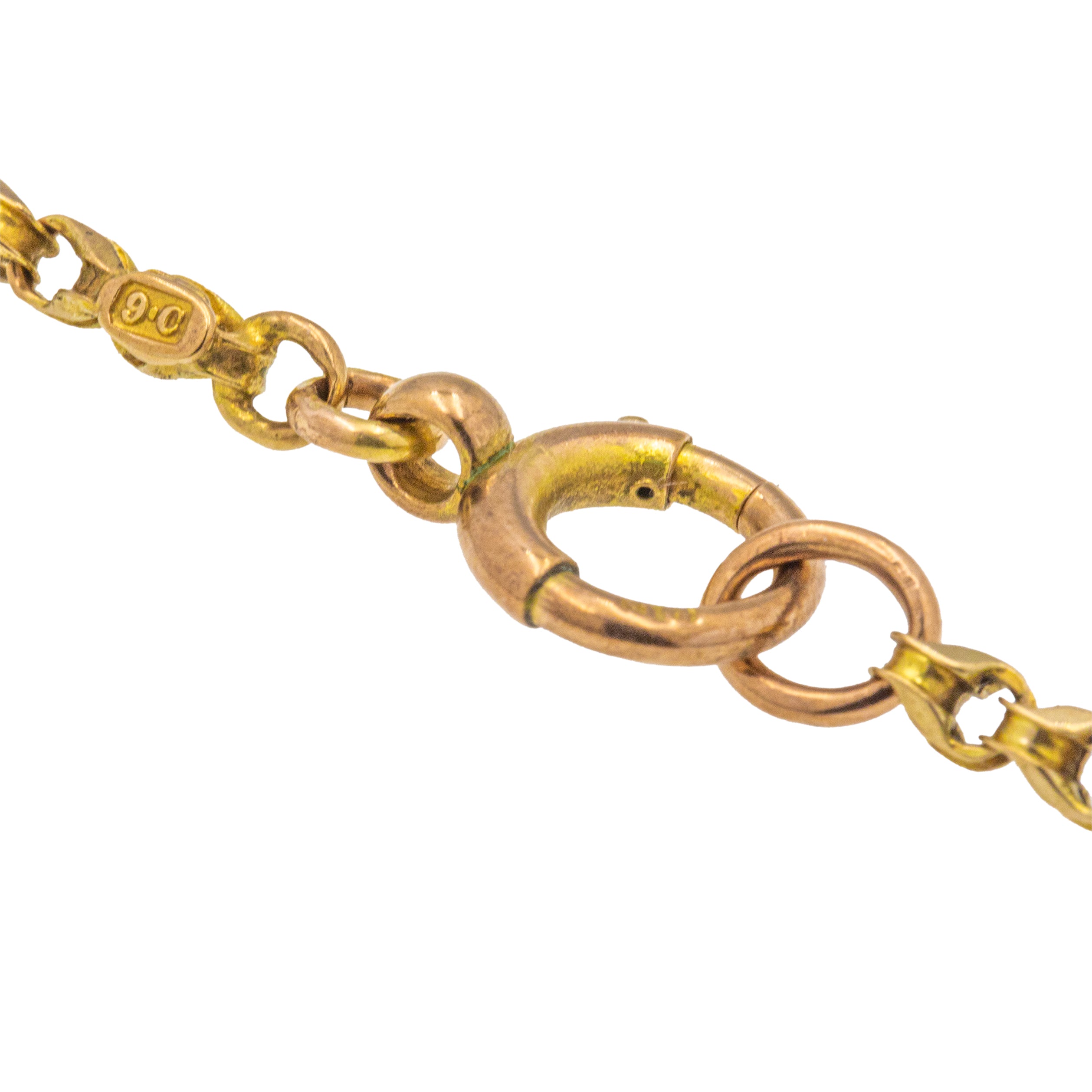 VERY GOOD. This antique 9ct Gold belcher chain is in very good condition! The links are neatly interlinked with no damage to note. Her bolt-ring does need a helping hand to close tightly, but once closed, she securely holds the chain around your neck. A belcher chain with a twist, she will set your collection apart from the rest!