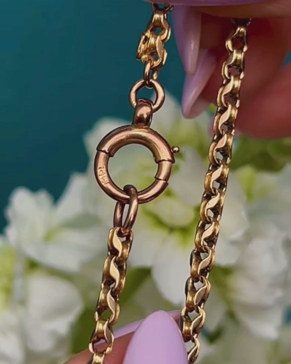 How divine is this antique 9ct Gold belcher chain with bolt-ring! Her 19-inch length is formed of intricately designed belcher links, resembling those highly desired tulip links!