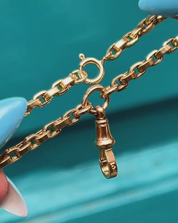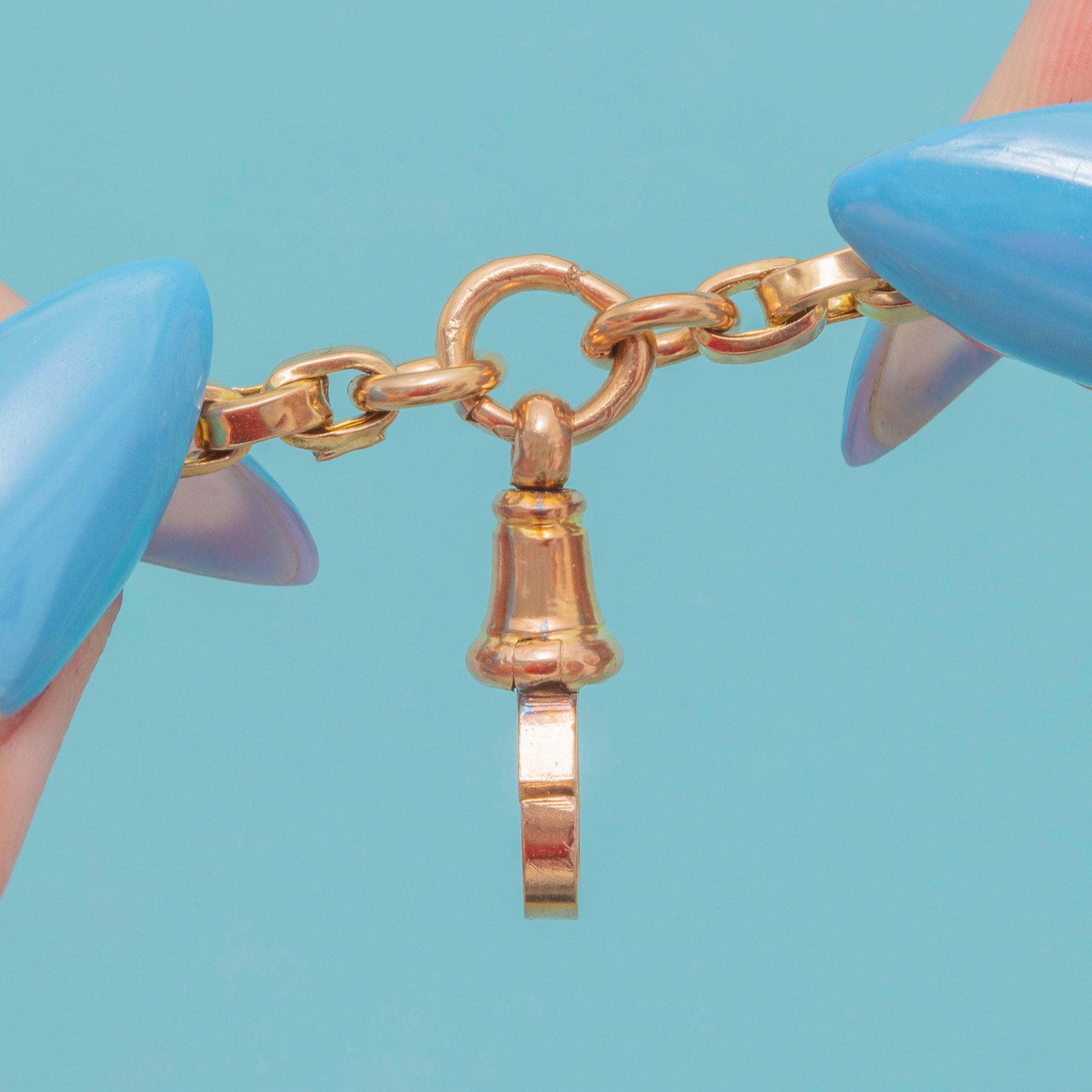 EXCELLENT: Each belcher link is uniform and secure, and the dog-clip charm holder has been well-soldered. Complete with the bolt-ring clasp in perfect working order, this Victorian chain can be worn with utmost confidence.