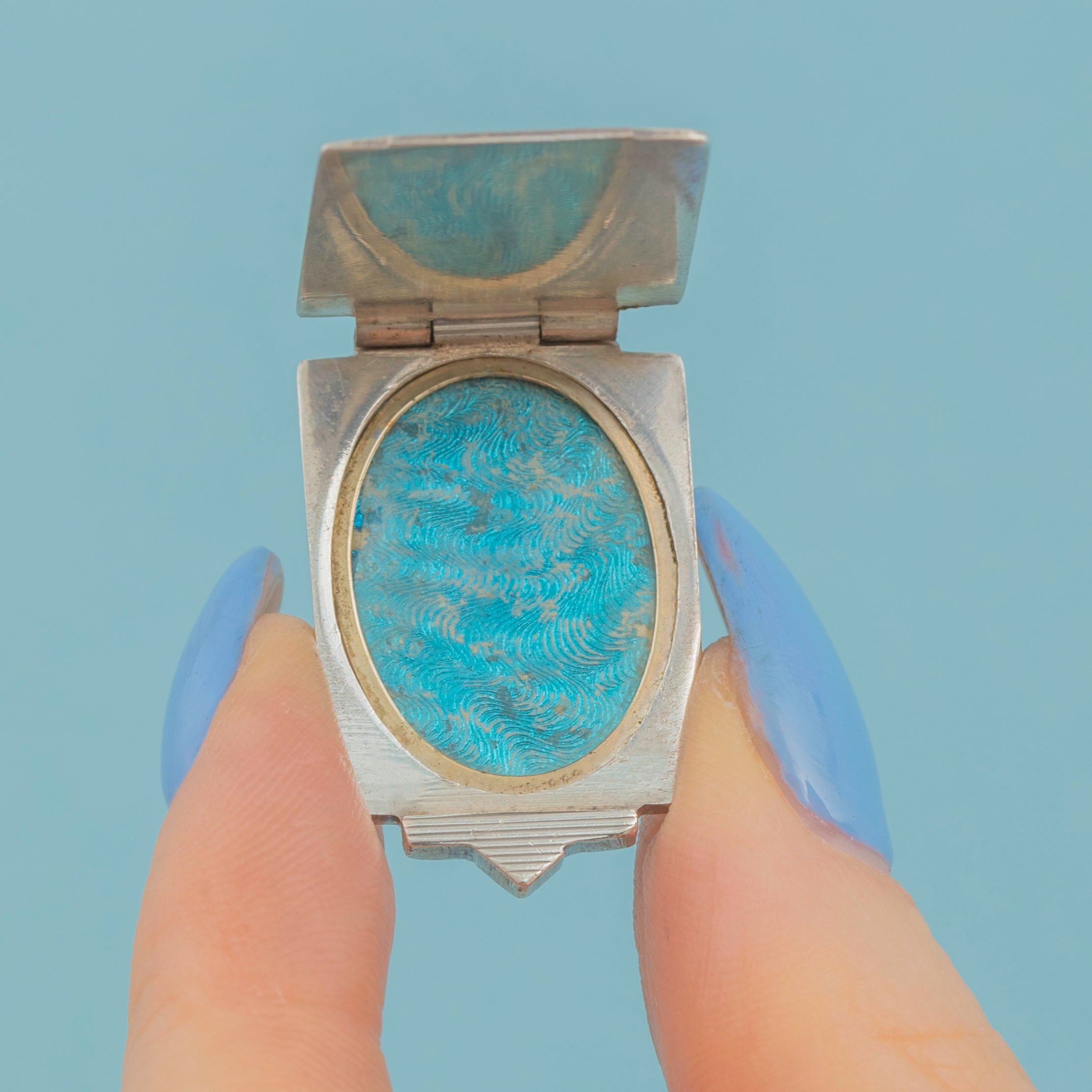 This striking Art Deco silver engraved rectangular locket beautifully captures the elegance of its era. Boasting finely engraved lines within a bold geometric design, this Art Deco locket perfectly captures the craftsmanship of the early 20th century.
