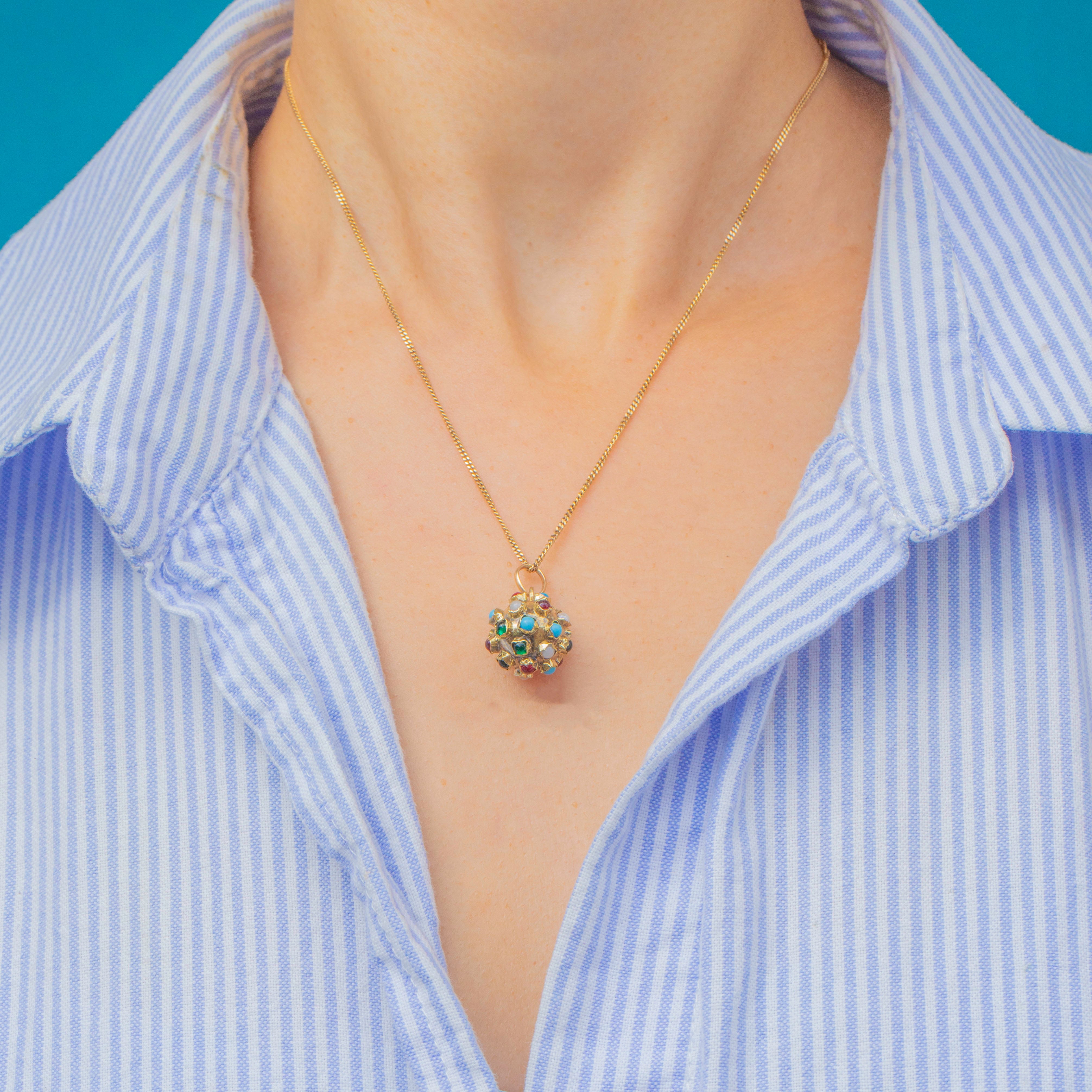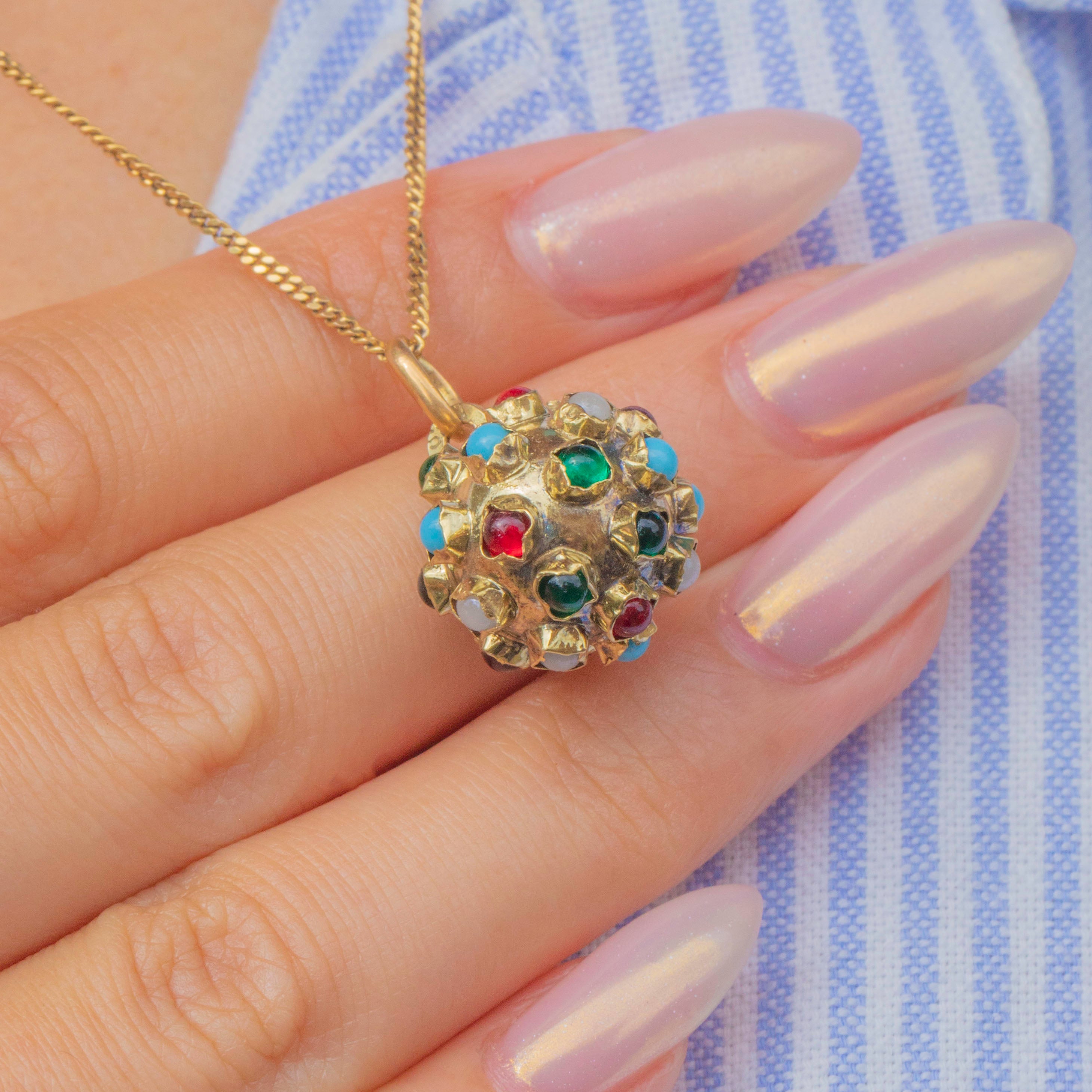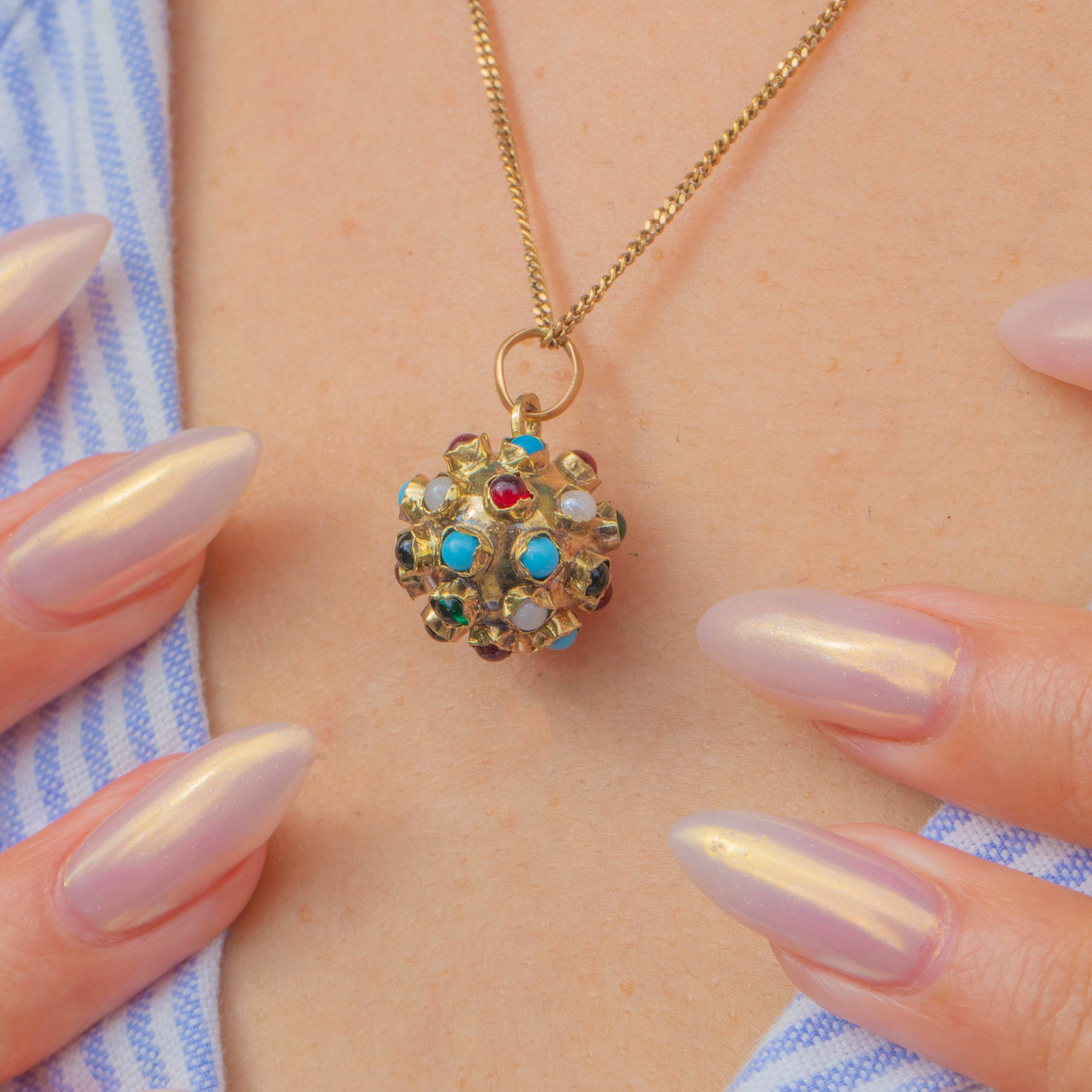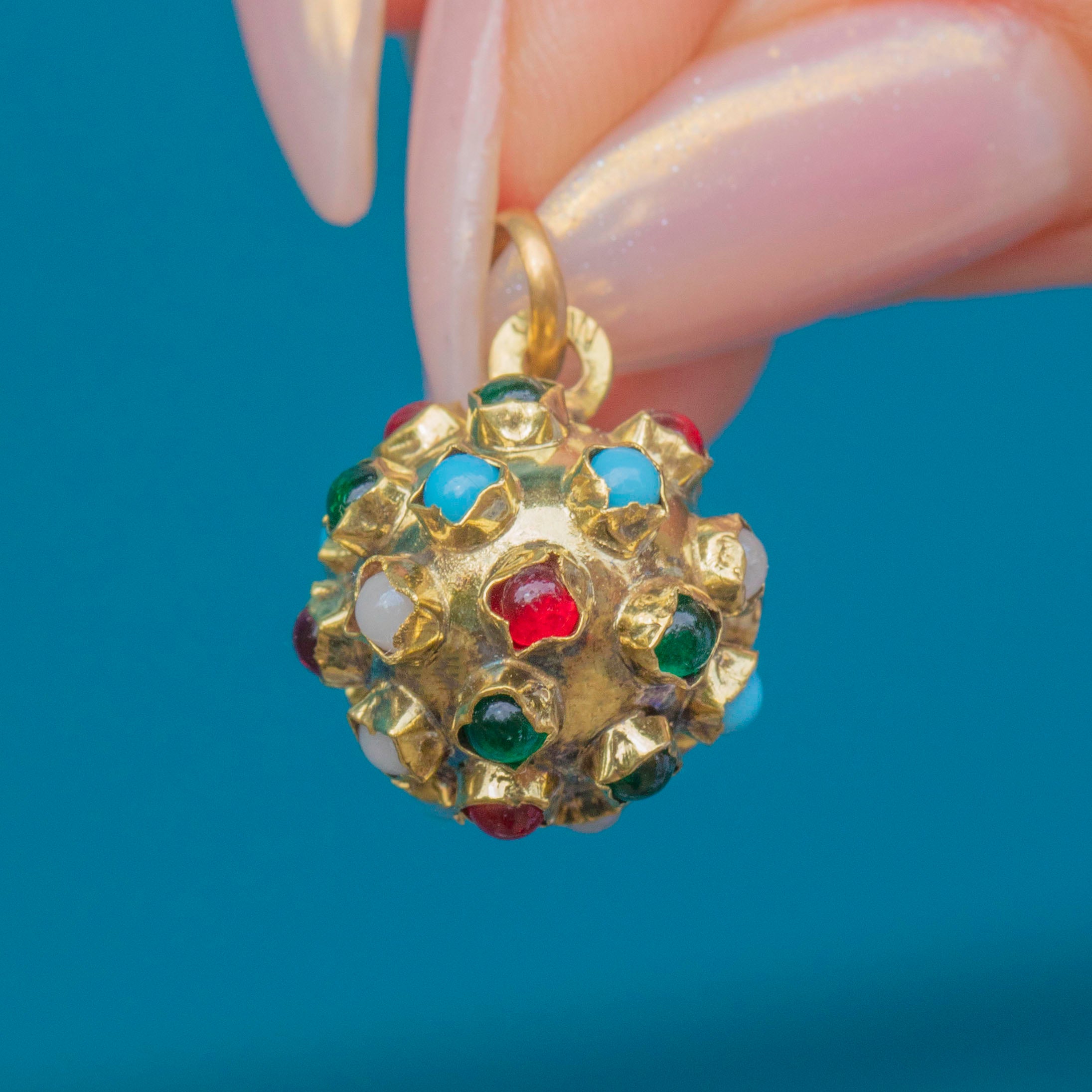 A playful “Sputnik” orb charm in 9ct Gold, dating to the 1960s. This bold mid-century design is set all over with colourful faux gems, simulating Emeralds, Rubies, Garnets, Pearls and Turquoise for a striking multicoloured effect.