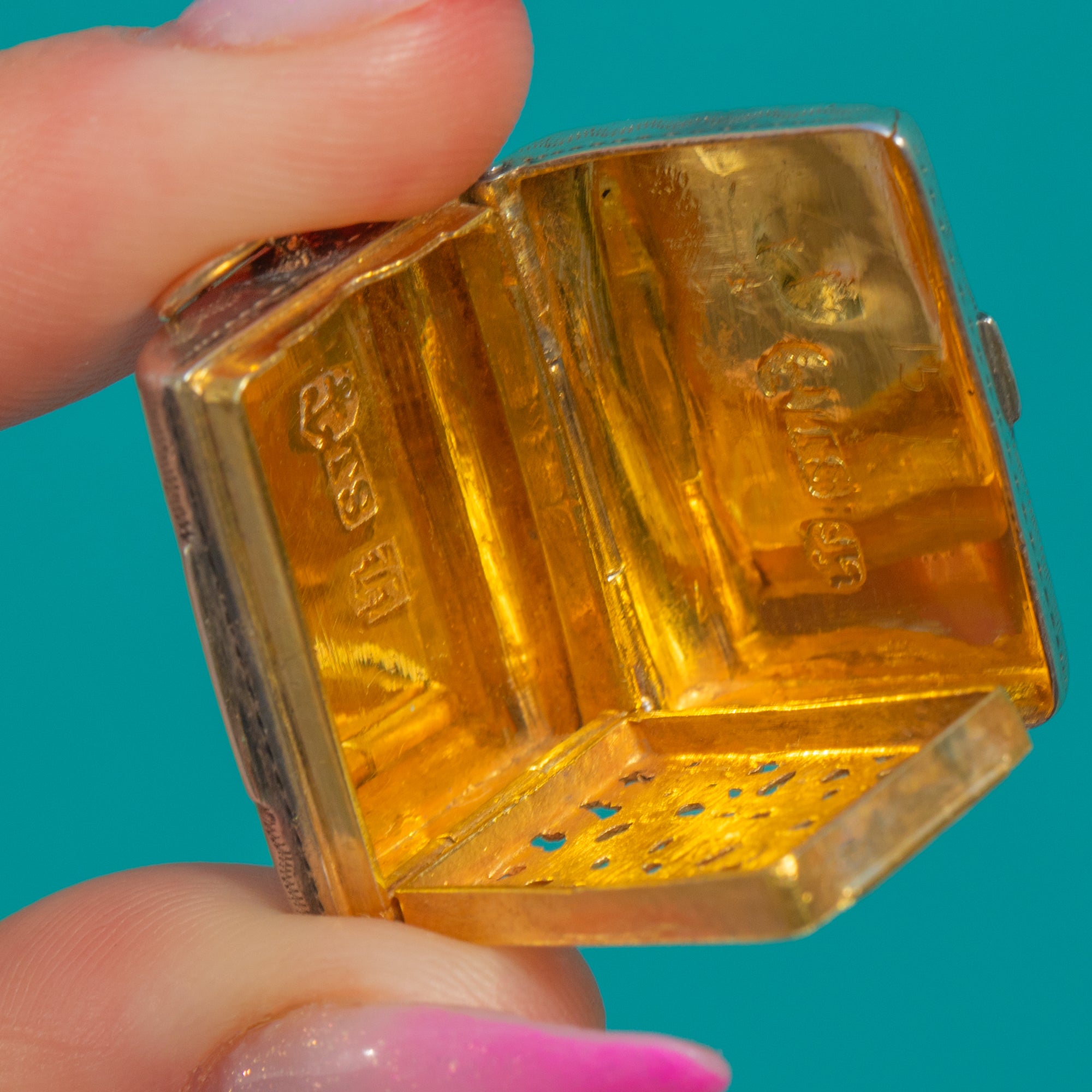 VERY GOOD: Light surface marks and a gentle patina to the exterior commensurate with age. The gilded interior and pierced grille remain bright with minor rubs only; hinge and closure are secure. Hallmarks are clear and legible, indicating the piece has been well cared for.