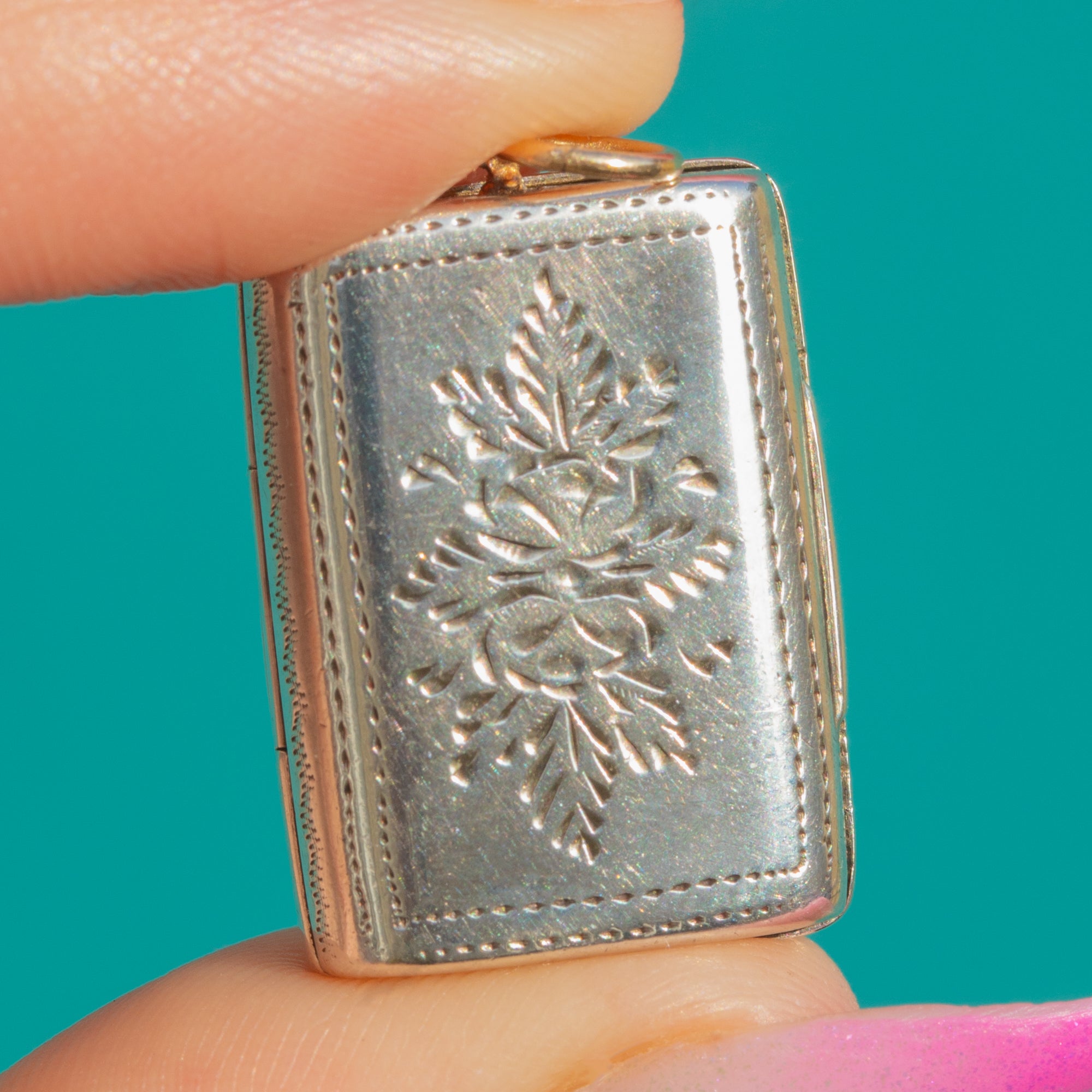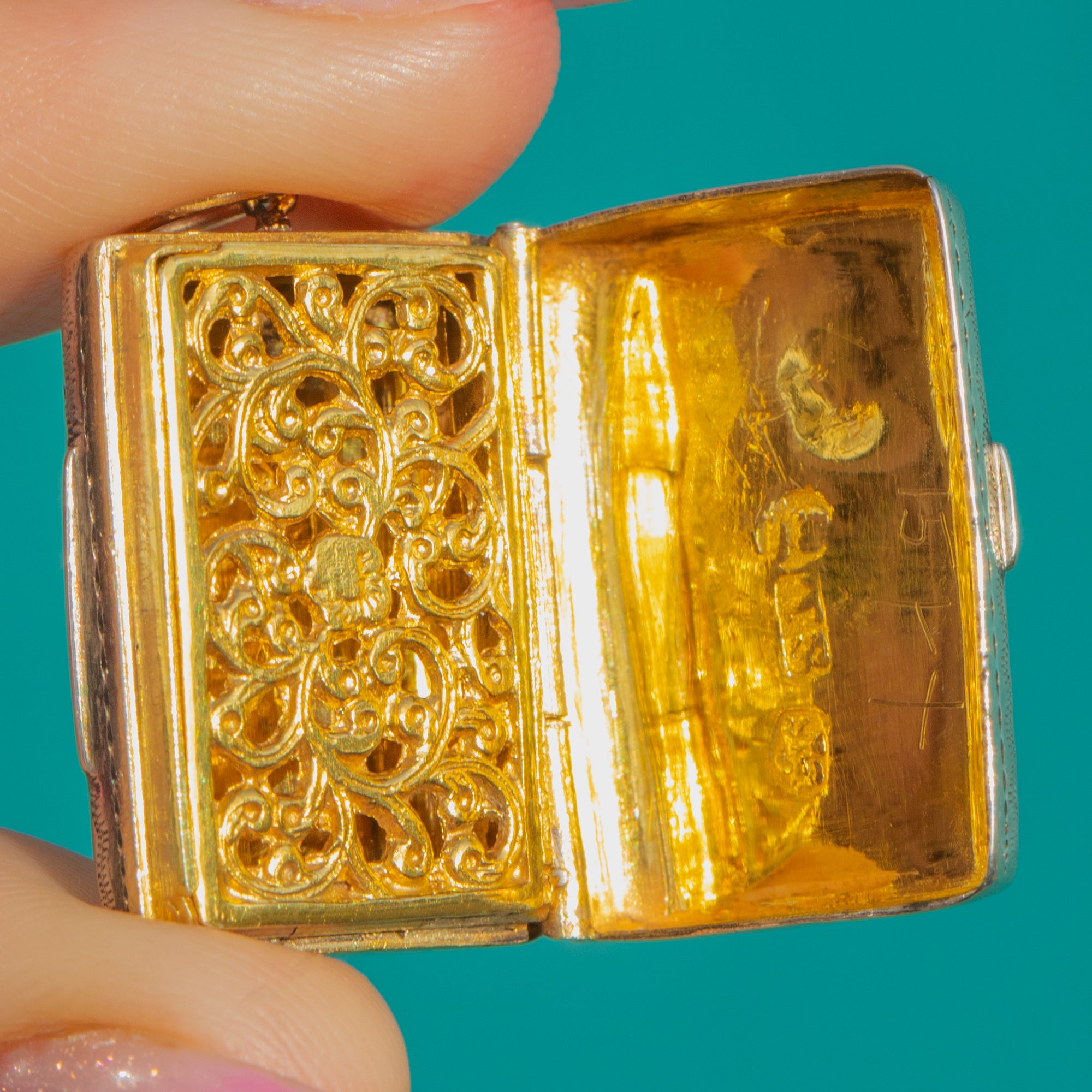 Open the hinged lid to reveal a glowing 9ct Gold-gilded interior with a finely pierced grille. Fully hallmarked for Birmingham, 1833 with the Lion Passant, date letter “K”, and maker’s mark “TS” (possibly Thomas Streetin), it’s a petite masterpiece of early 19th-century craftsmanship—perfect as an elegant keepsake pendant or to adorn a favourite chain.