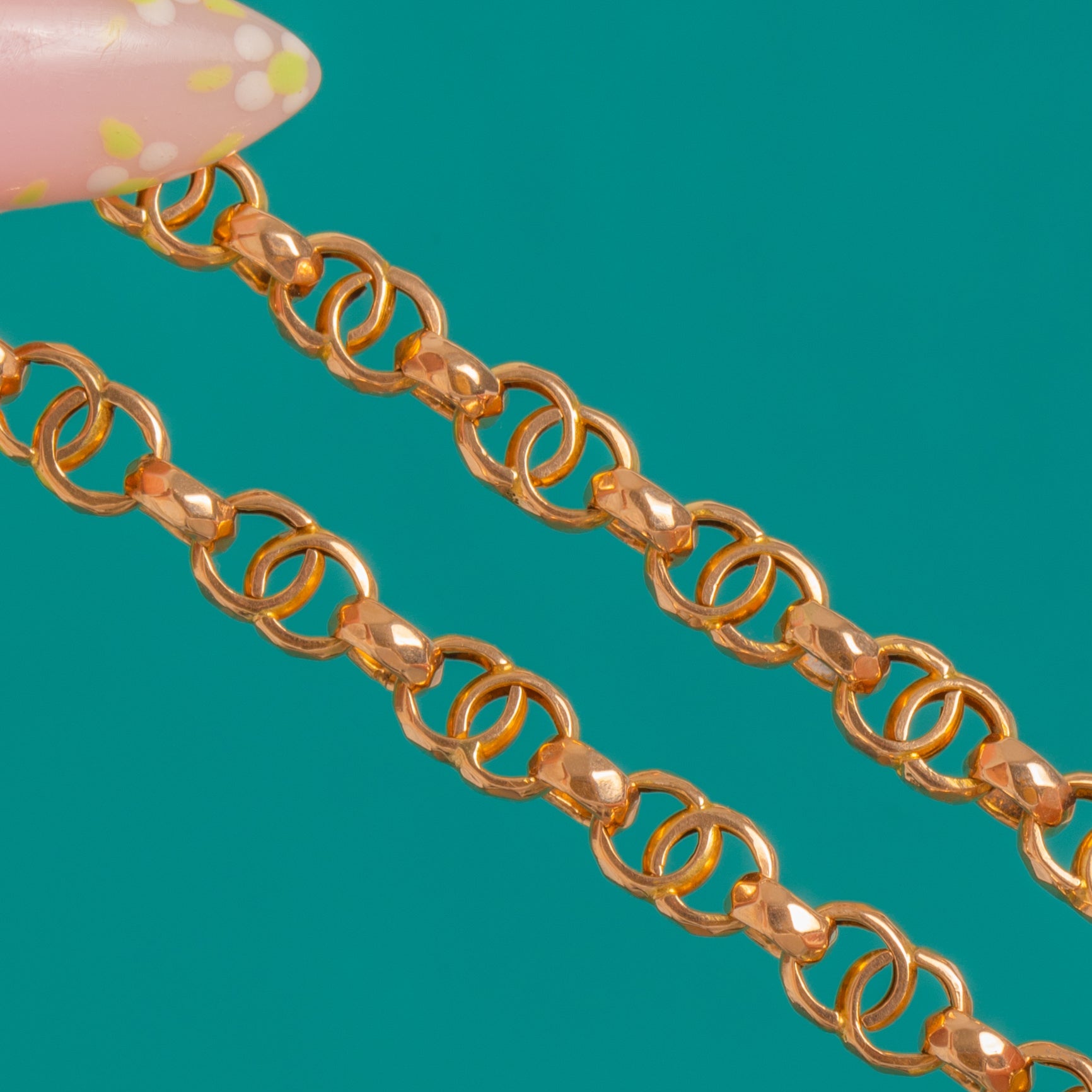 A rare Victorian fancy “Double C’s” chain in glowing 9ct Gold, this beauty plays with negative space and light in the most elegant way. Each interlocking C-shaped link has faceted, textured faces that shimmer with every movement, creating a refined sparkle that feels undeniably luxurious.