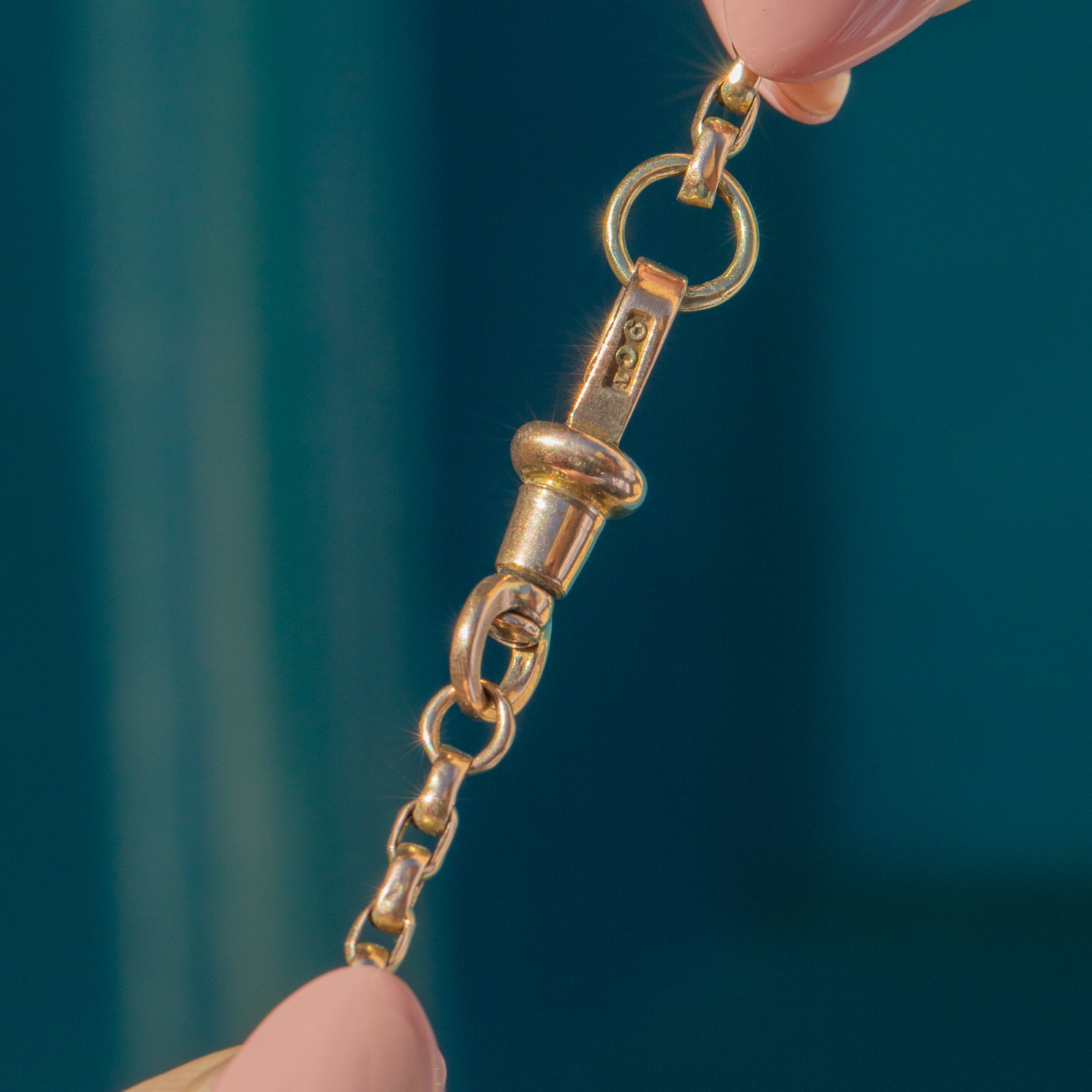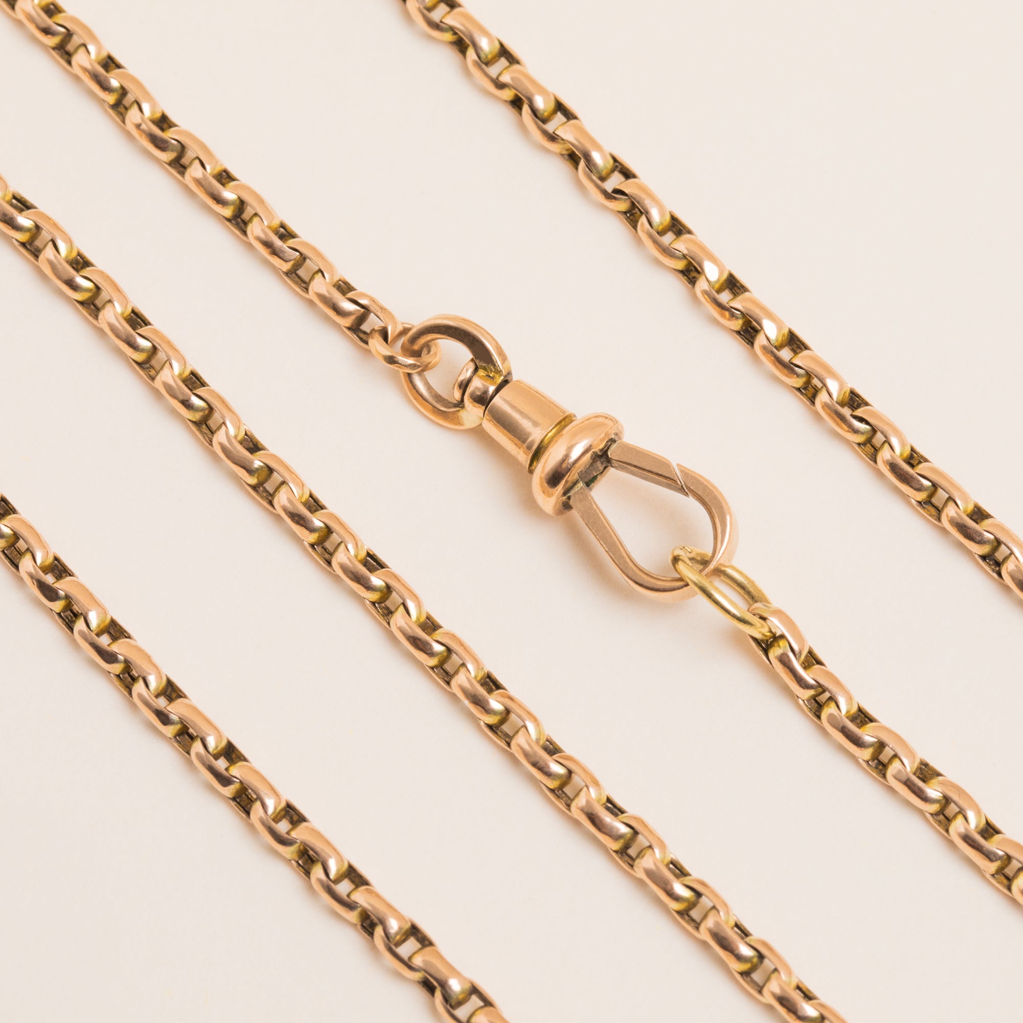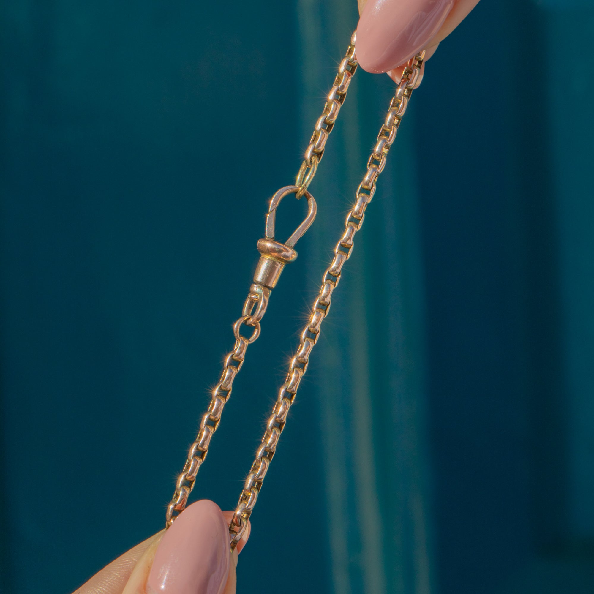 Complete with an antique dog clip, this Victorian Gold chain will rest beautifully on your décolletage, perfect for suspending your chunkier pendants and charms. A versatile piece, she will make a wonderful addition to your collection, either layered with other chains or simply worn alone for a welcome flash of Gold.