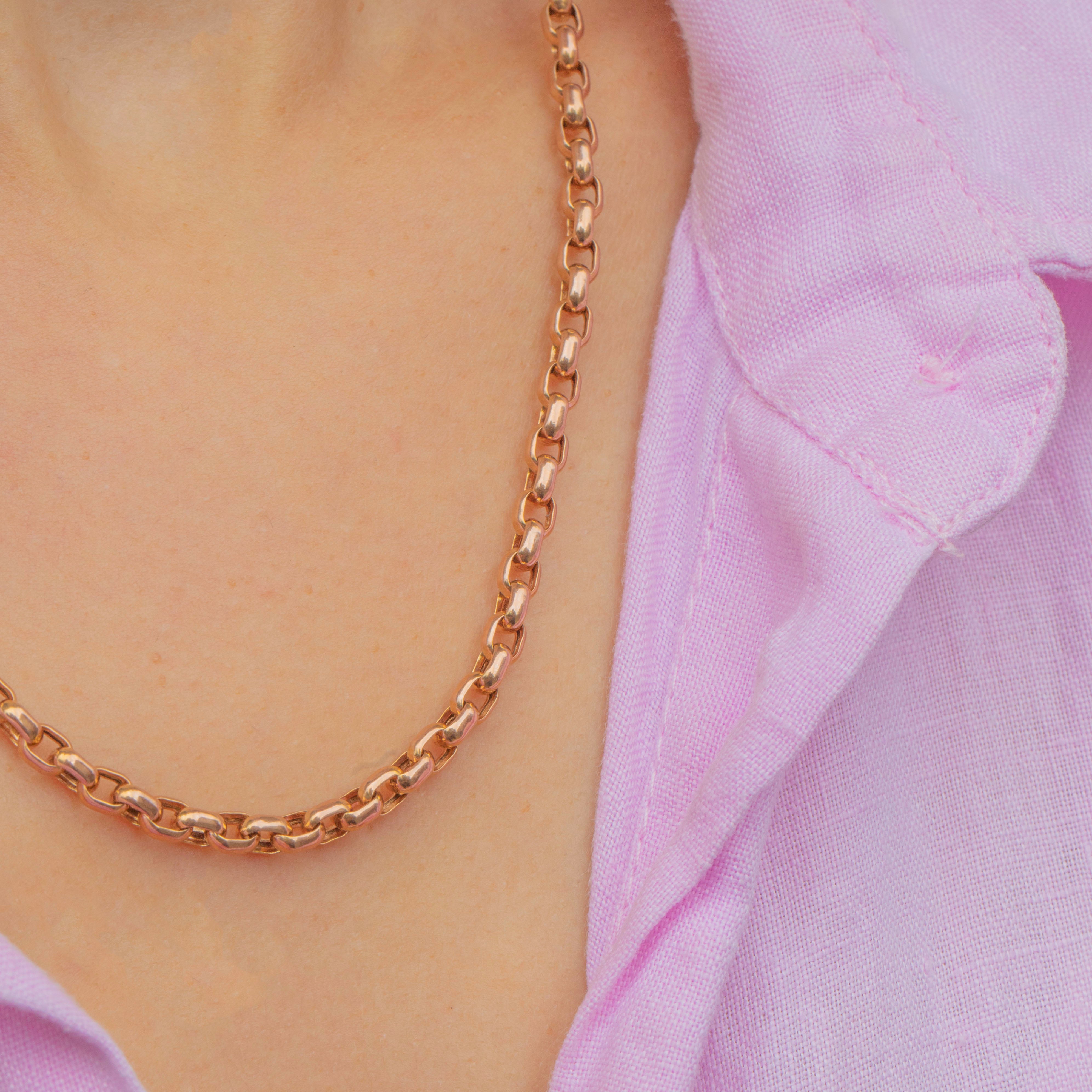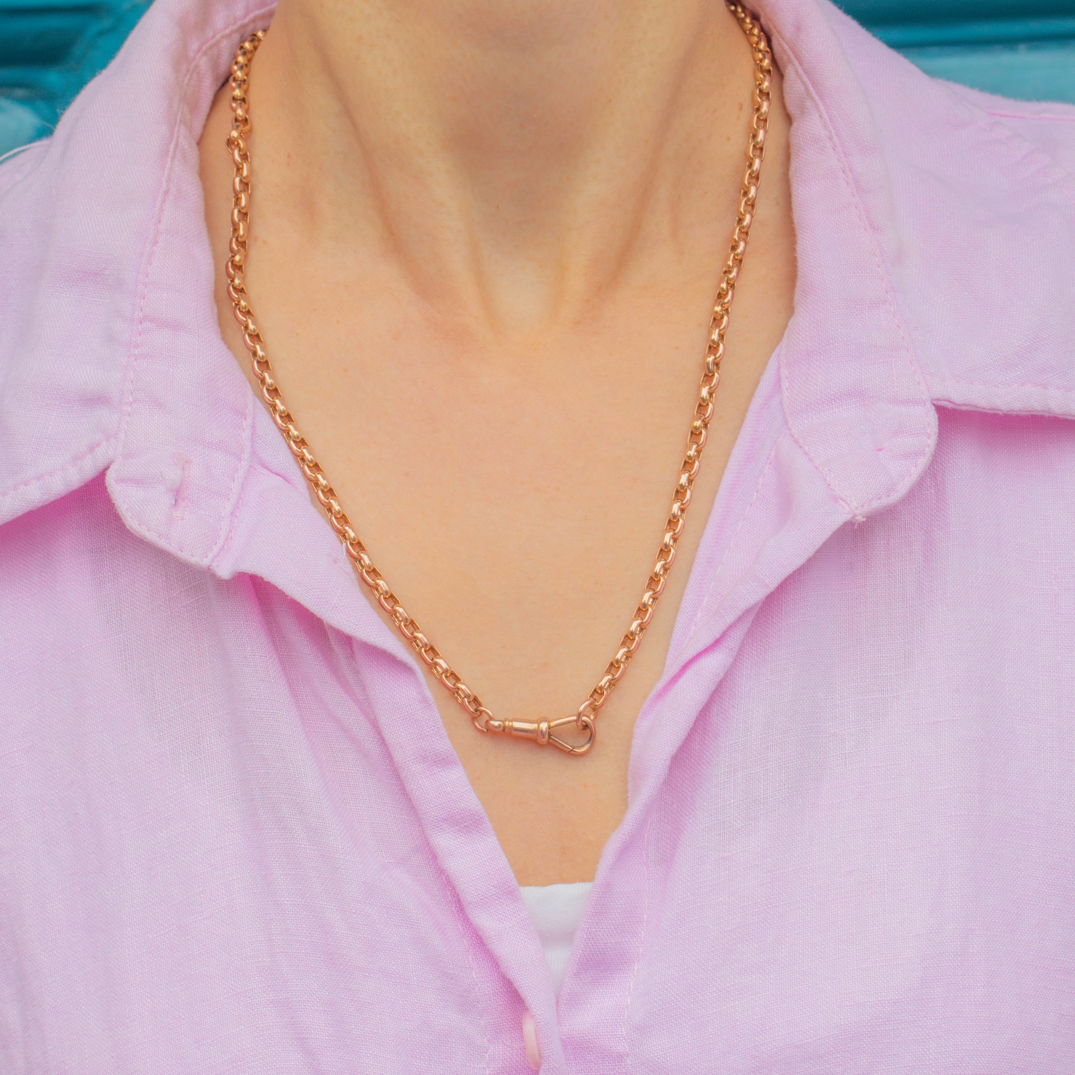 This antique 9ct Gold belcher chain is a classic Victorian staple, designed with rounded 4mm links and finished with a sturdy dog-clip clasp. Substantial at 11g, its rich rosy Gold tone and timeless style make it perfect for wearing alone, layered with other chains, or paired with a pendant.