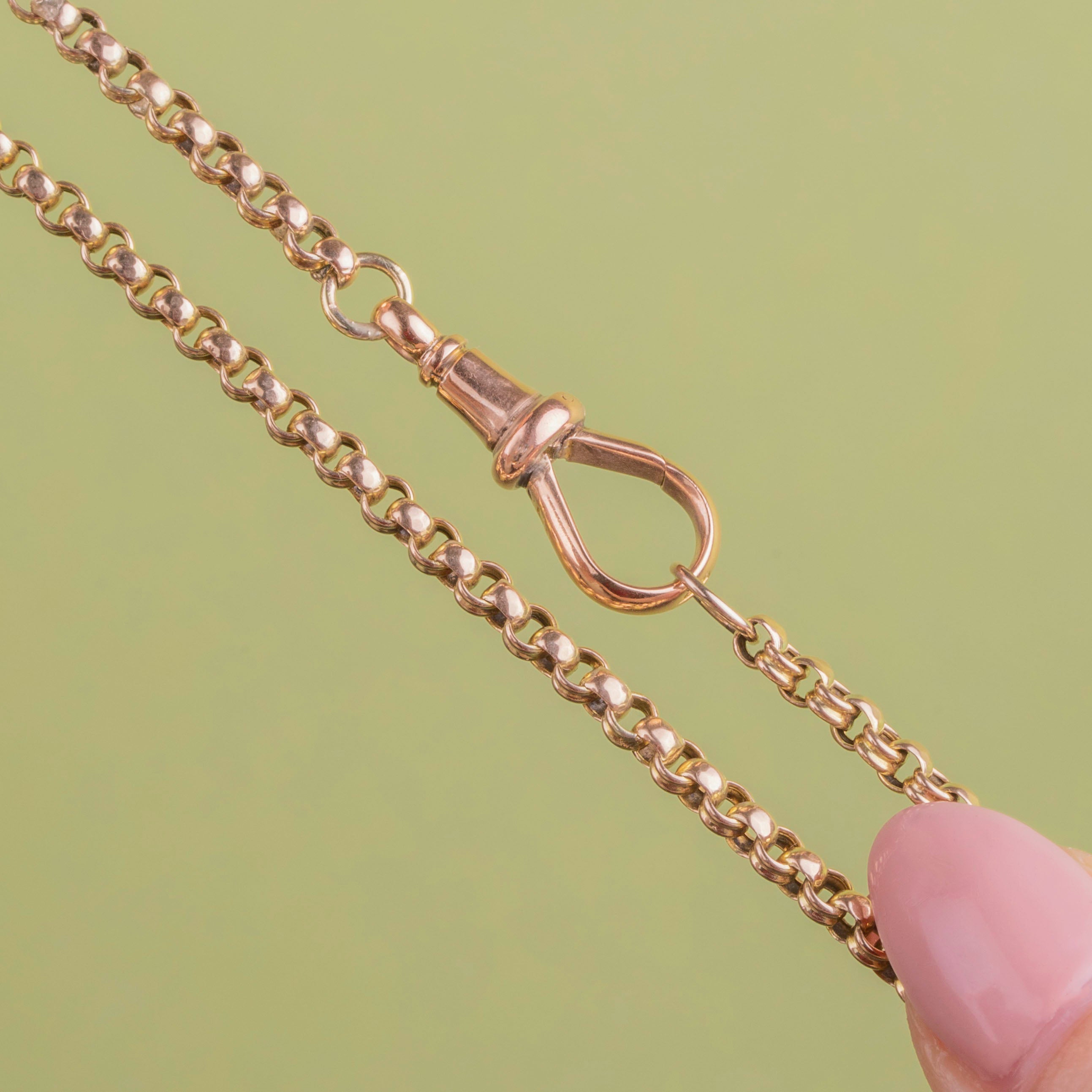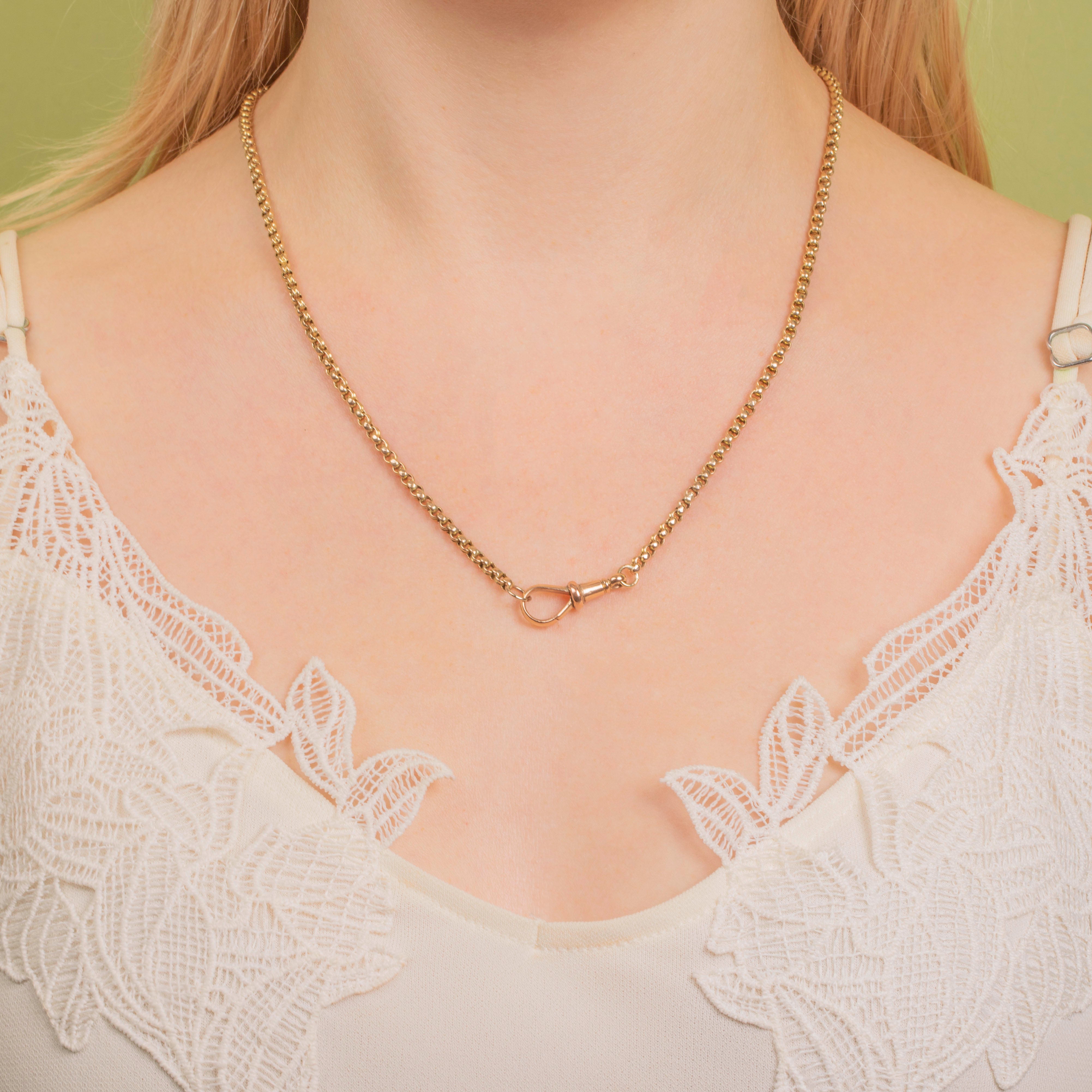 EXCELLENT. We are pleased to present this 20" antique 9ct Gold faceted belcher chain in excellent condition! The links are securely connected and the Gold is buttery throughout. With a fully functioning dog clip, you can wear this timeless Victorian Gold chain with absolute confidence!