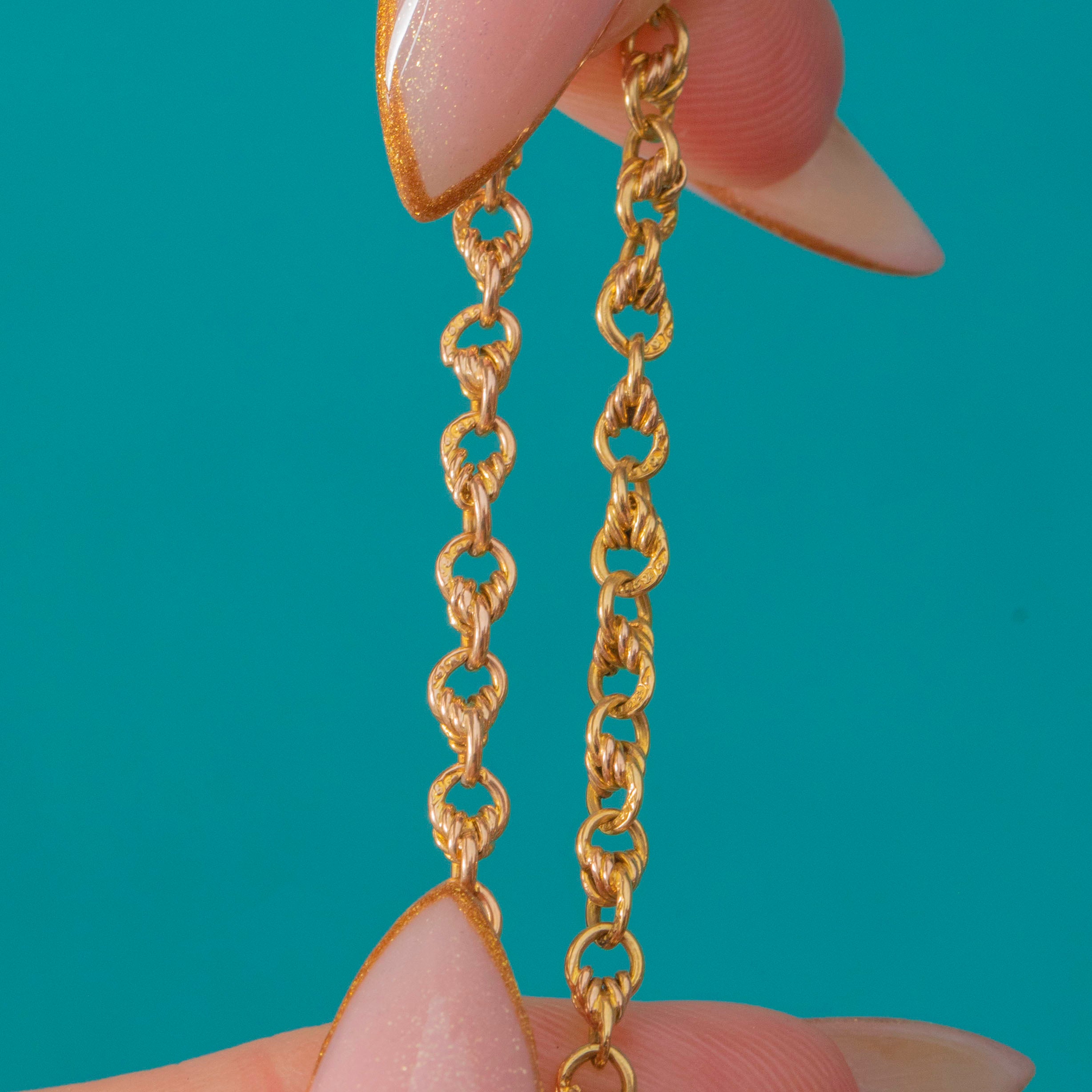 A beautiful antique 15ct Gold fancy knot chain from the Victorian era. Each link is exquisitely formed with intricate twisted detailing, creating a delicate yet substantial design that glows with that unmistakable antique 15ct Gold hue.