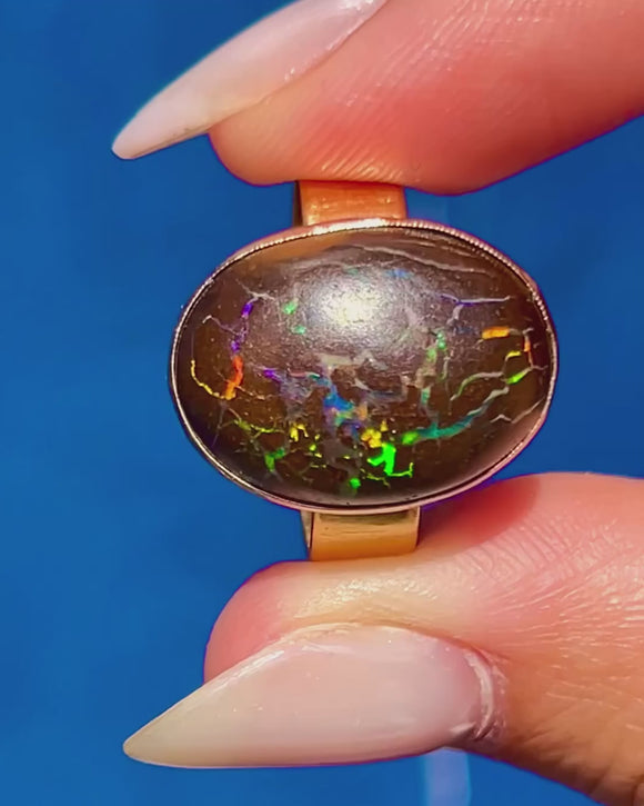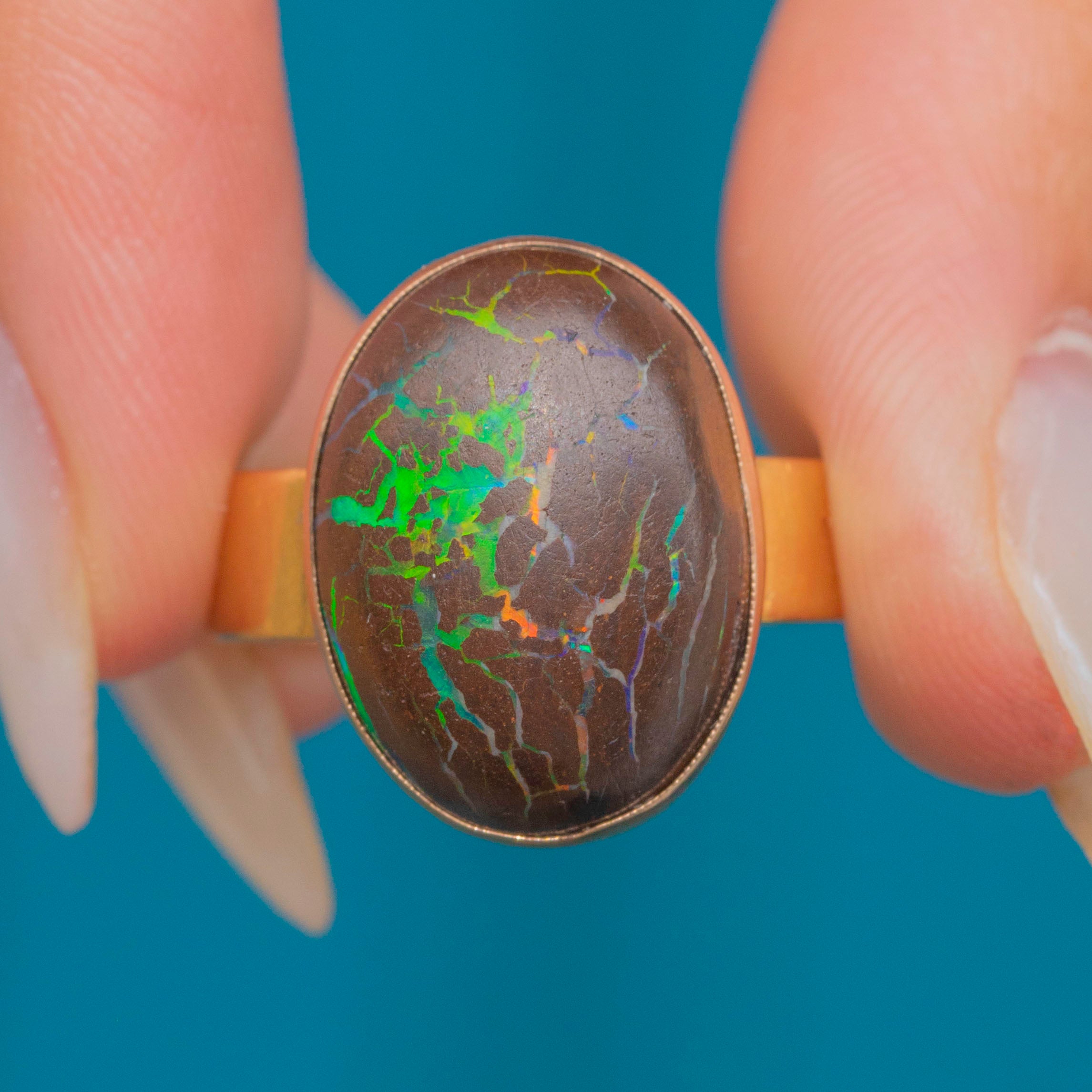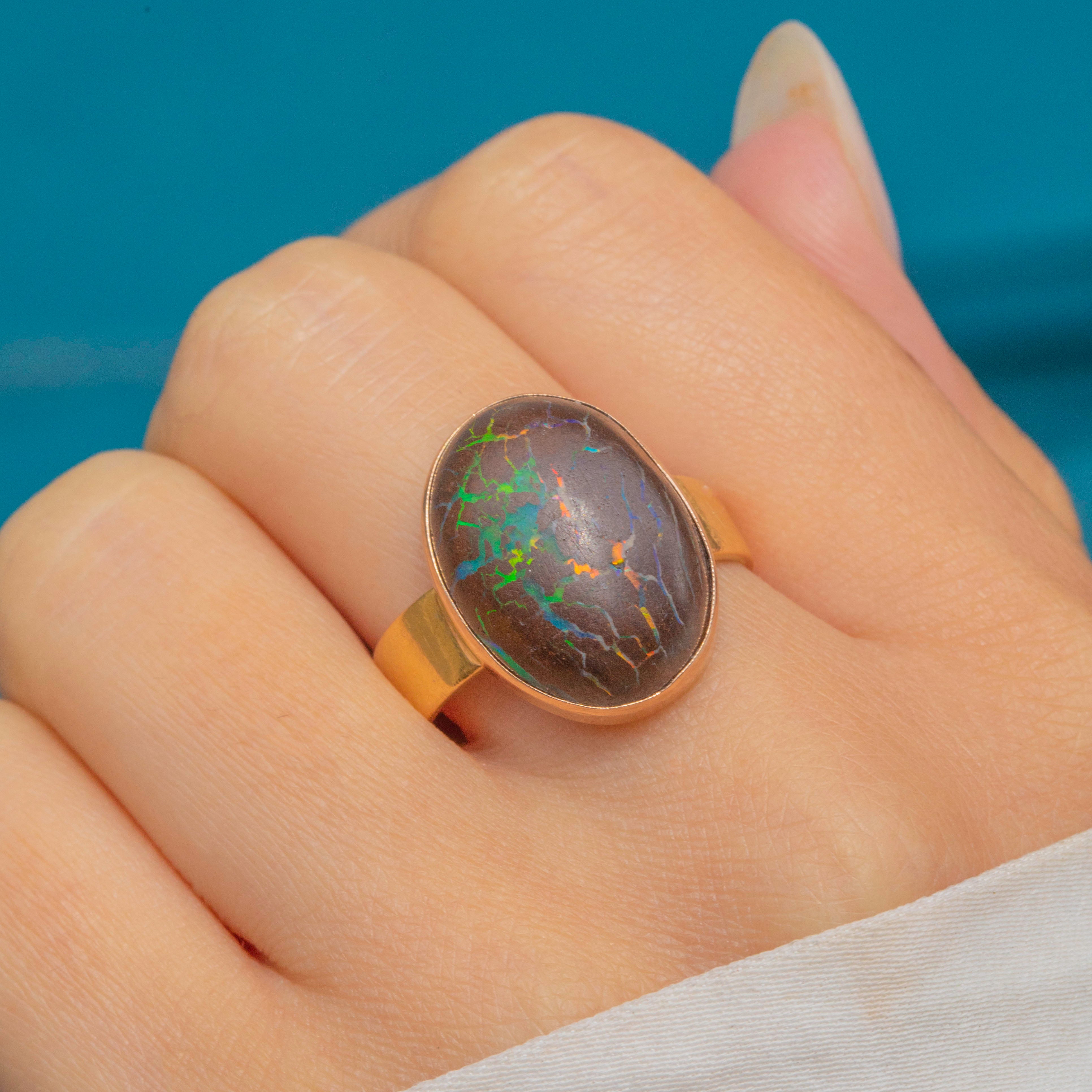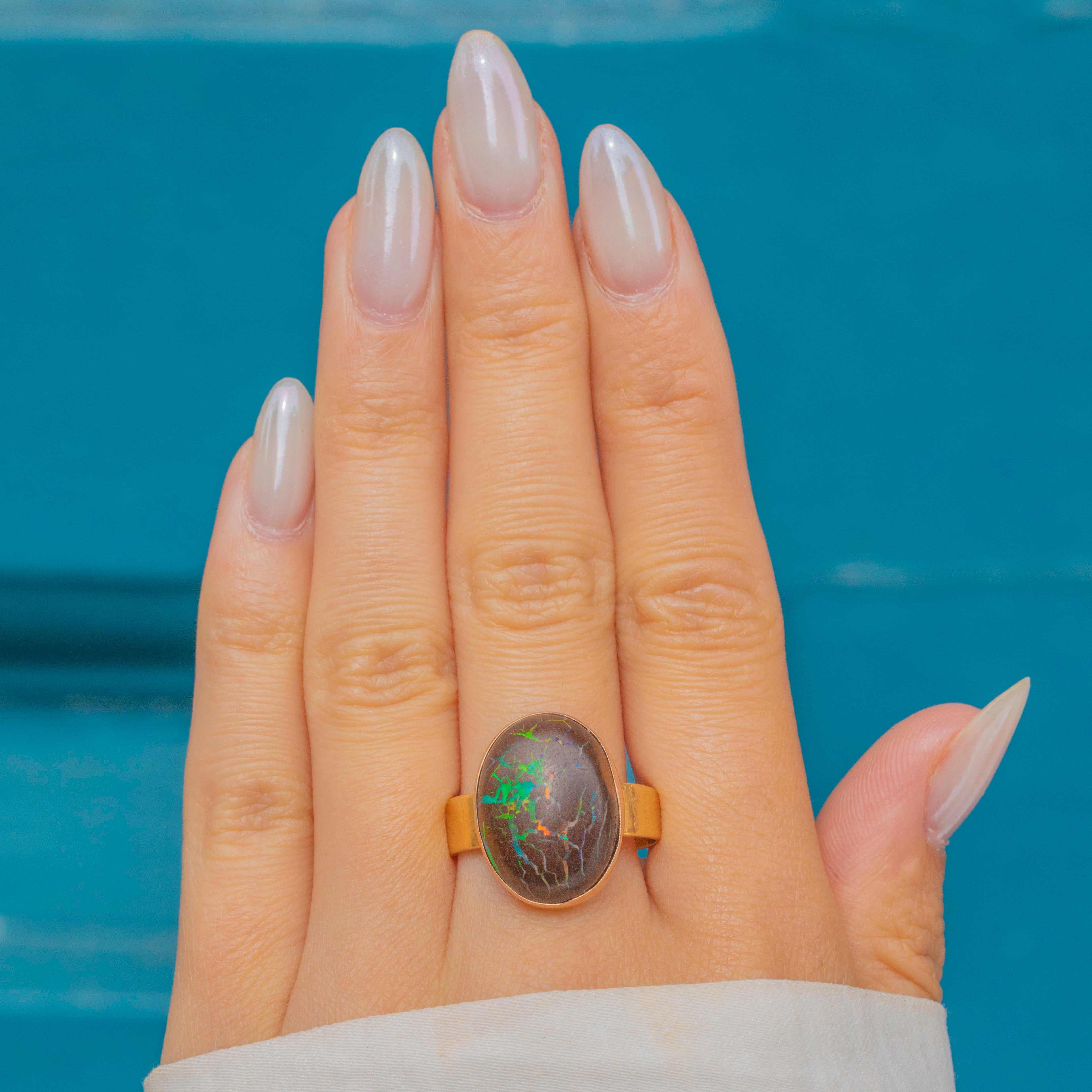 The Boulder Opal provides the finger with ample coverage, and you will discover a new pattern or colour within this impressive treasure every time you look at it!