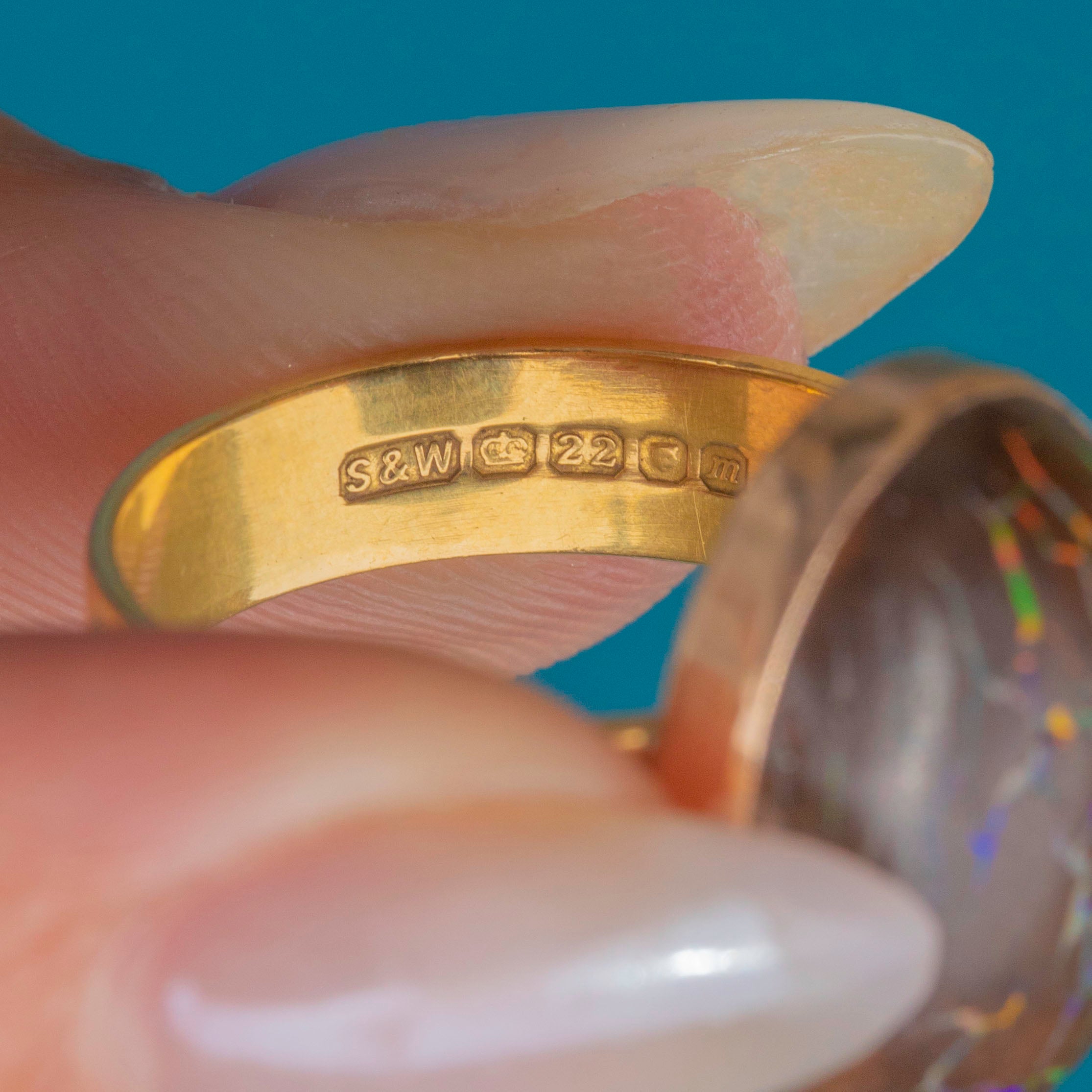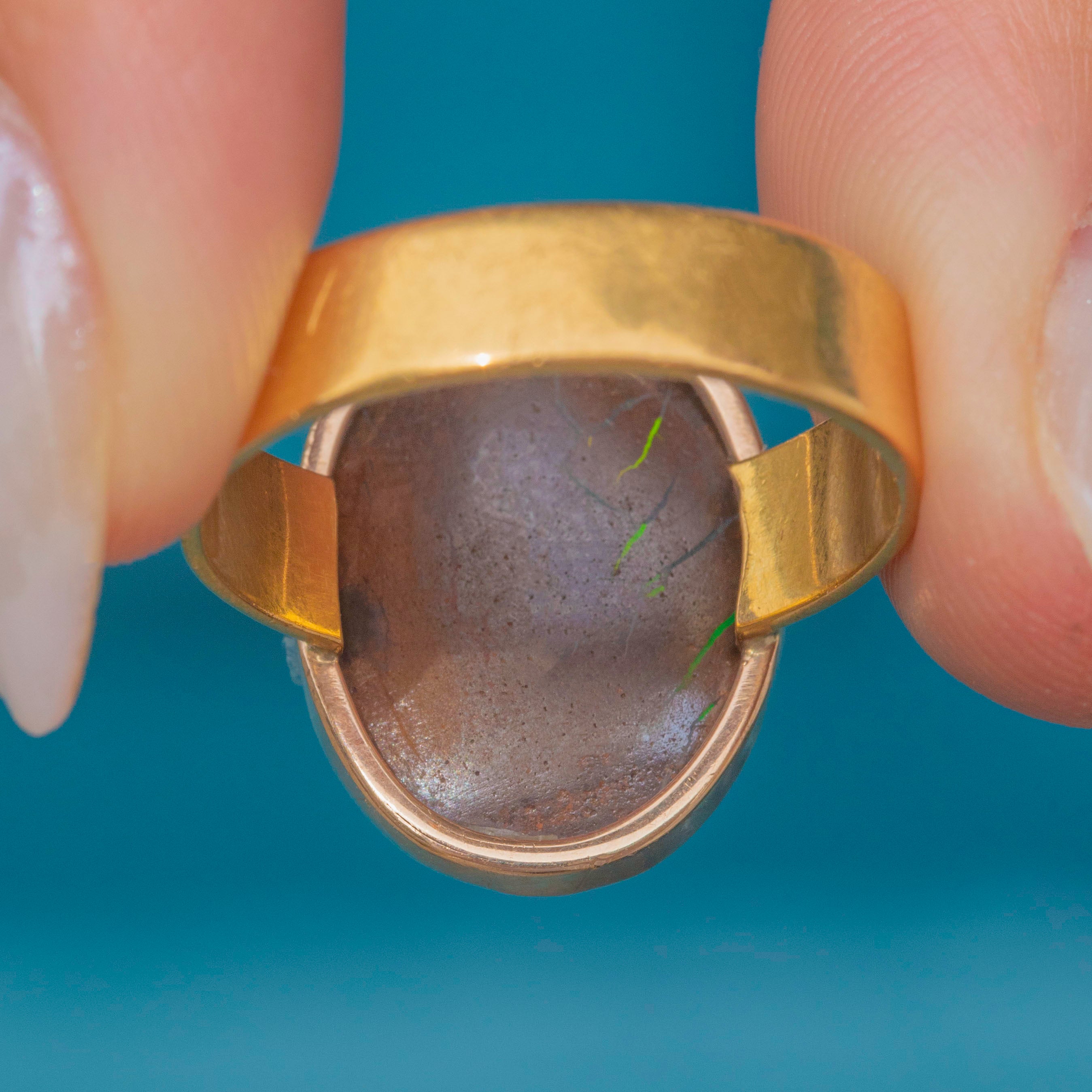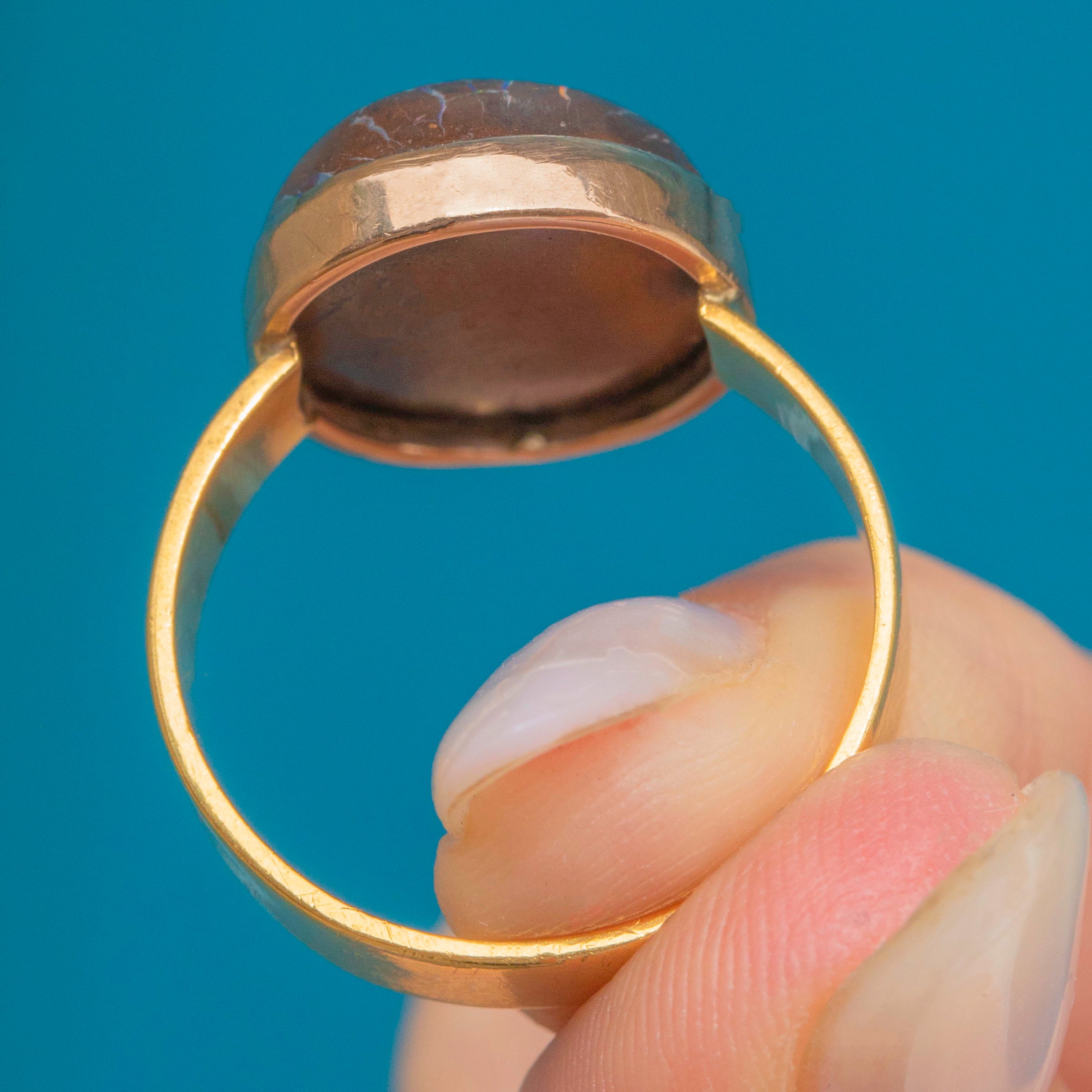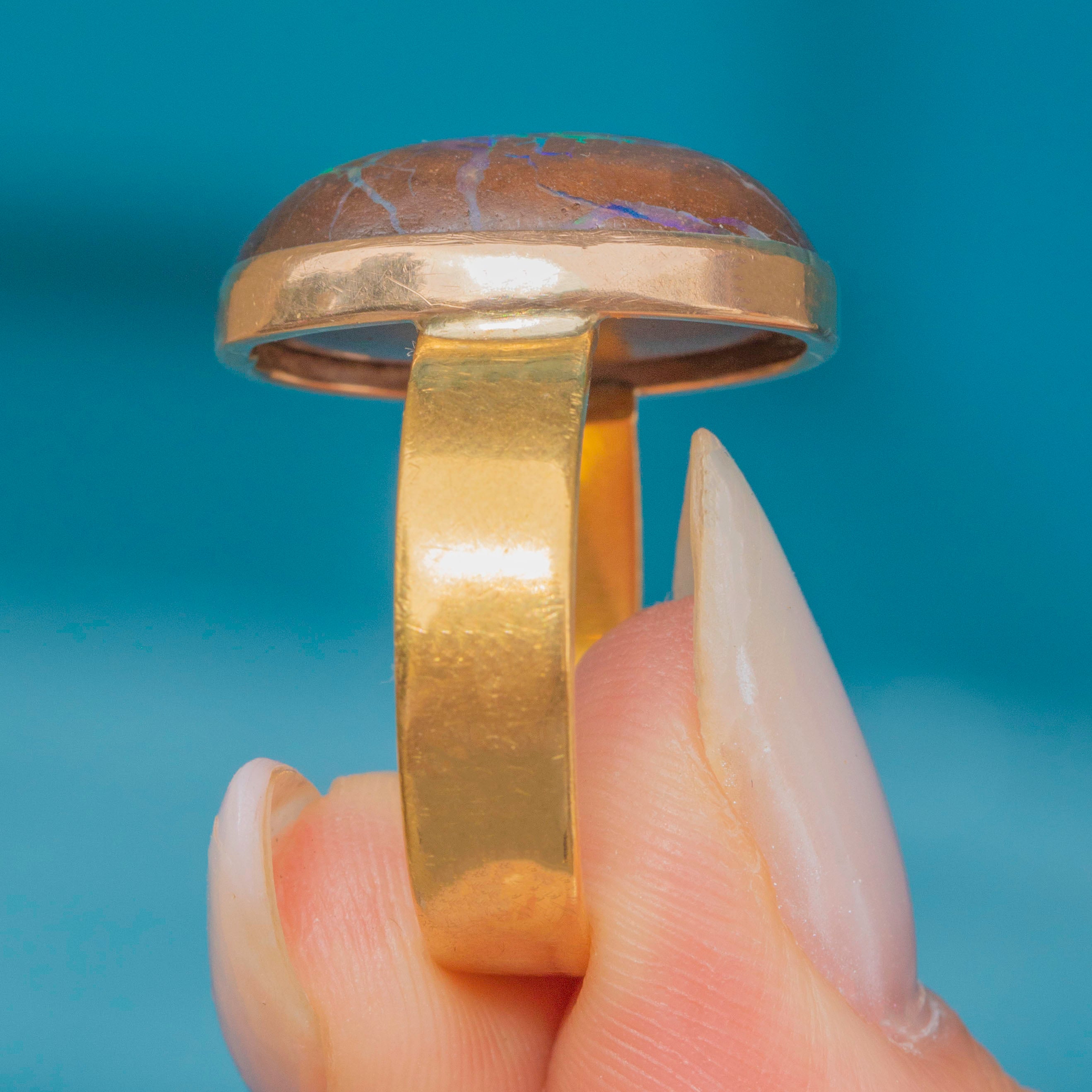 EXCELLENT: The Boulder Opal is smooth, with no surface wear, and secure within its bezel setting. The Gold has a lovely saturation and a chunky band that's comfortable to wear, with no dings to note. With a full set of English hallmarks dating to 1967!