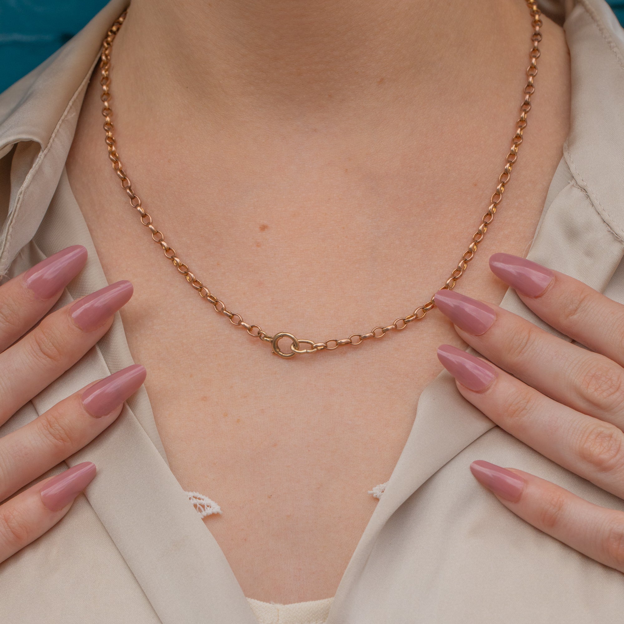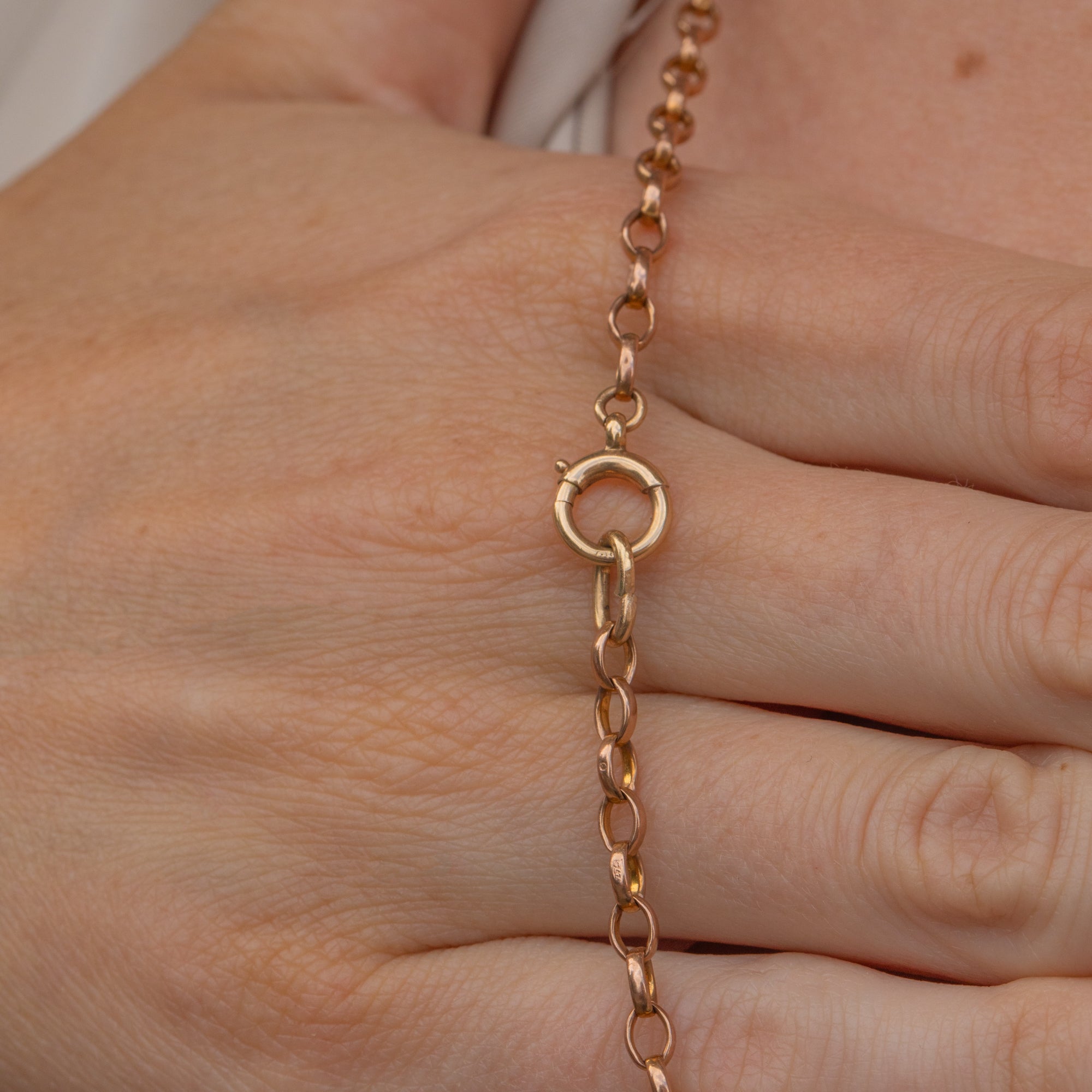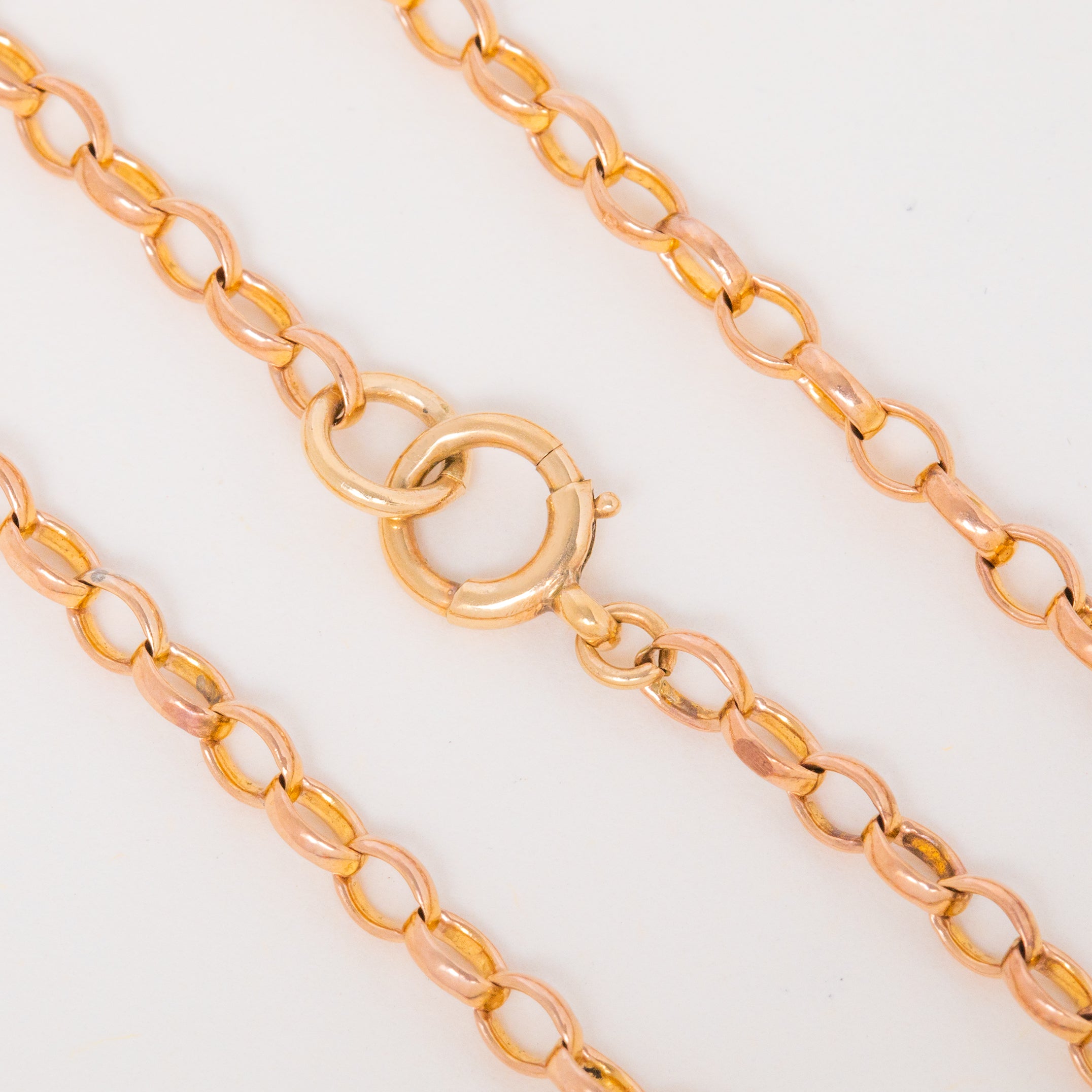 Each belcher link has a soft rosy tint, and the piece is finished with a bolt-ring from which you can suspend charms or a pendant!