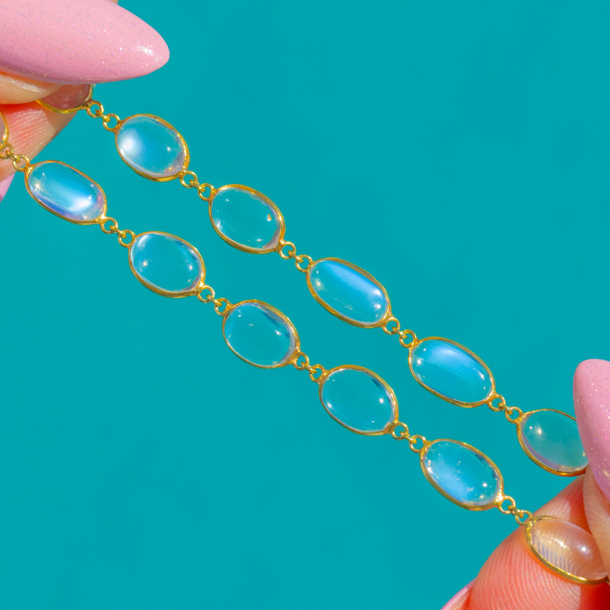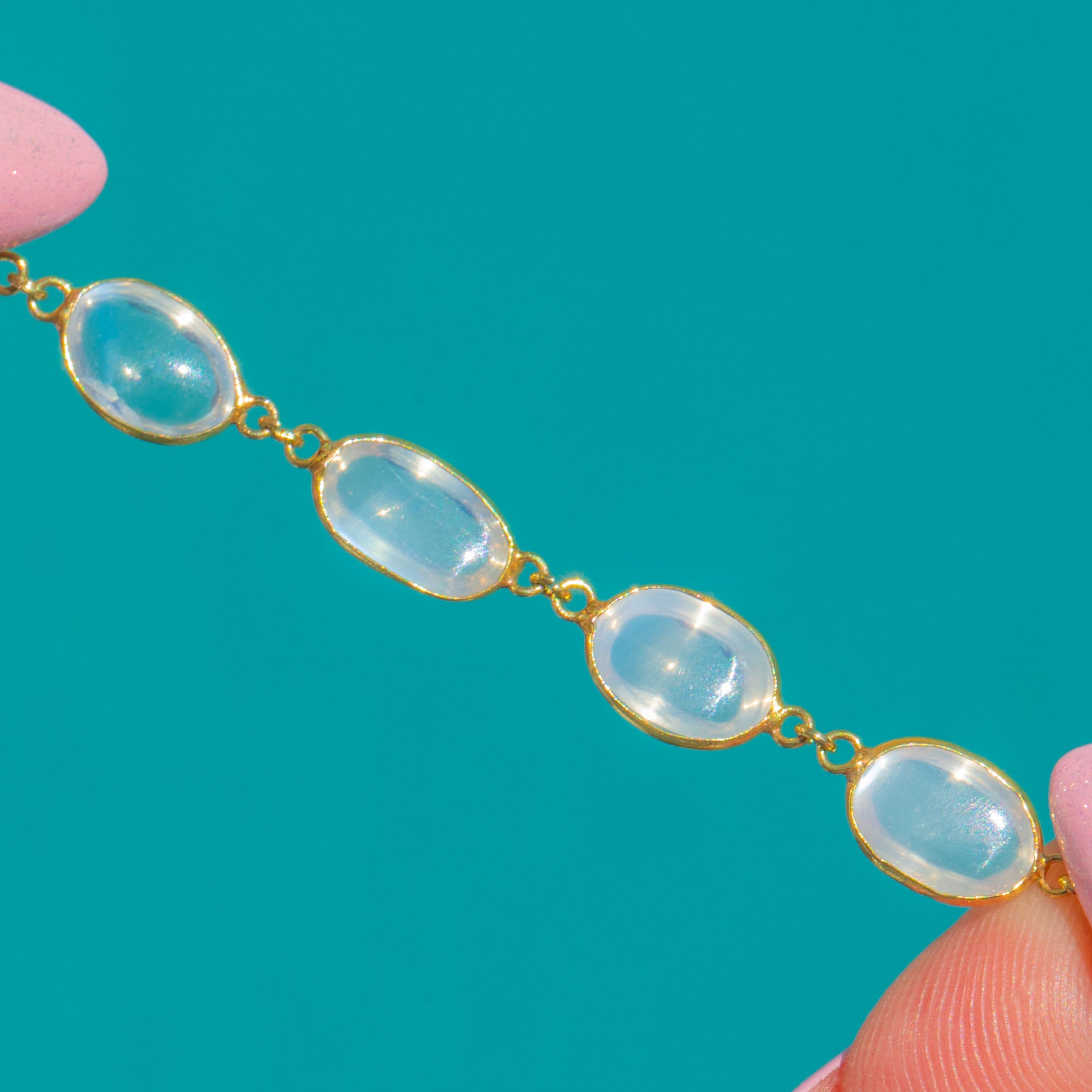 EXCELLENT: The Moonstones are bright and smooth with no chips or scratches noted under close inspection. The 18ct Gold bezel settings and articulated links are secure and well-preserved with minimal surface wear consistent with careful use. No visible repairs or alterations.
