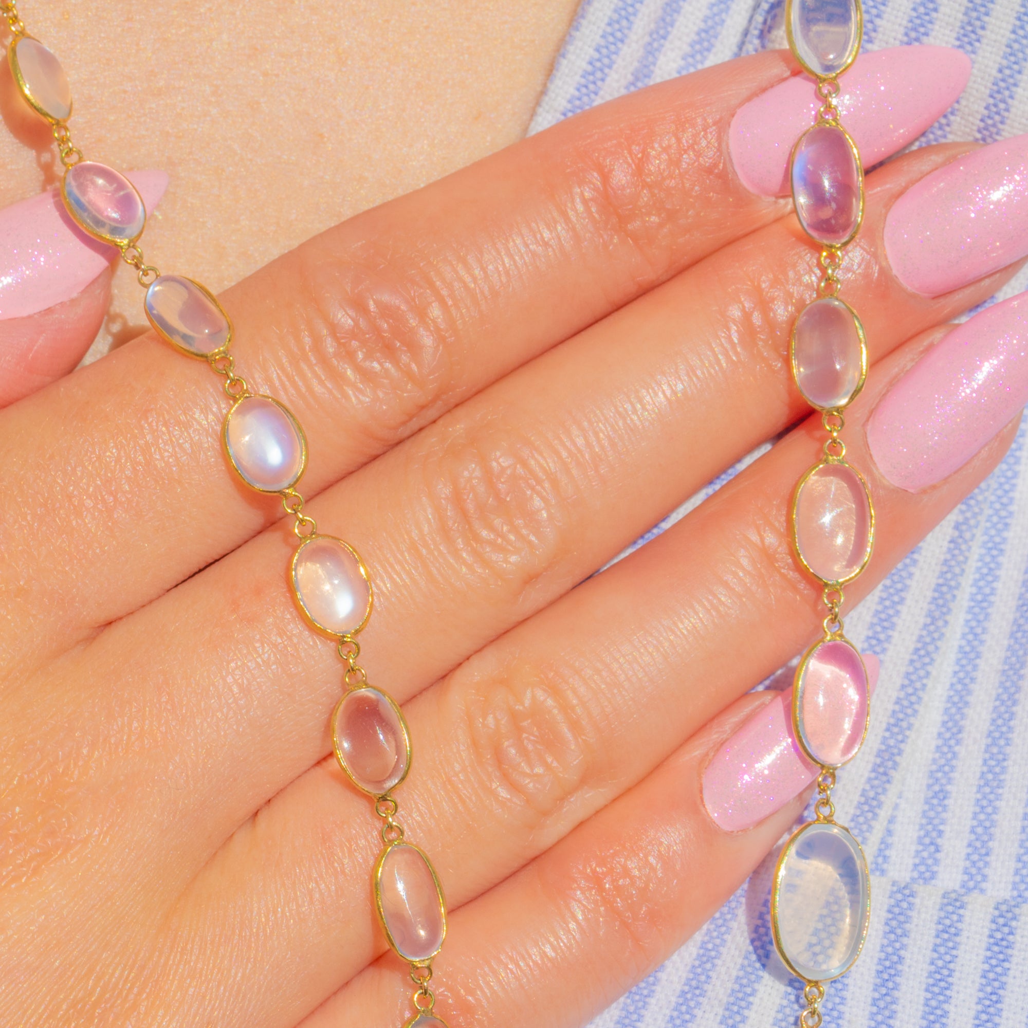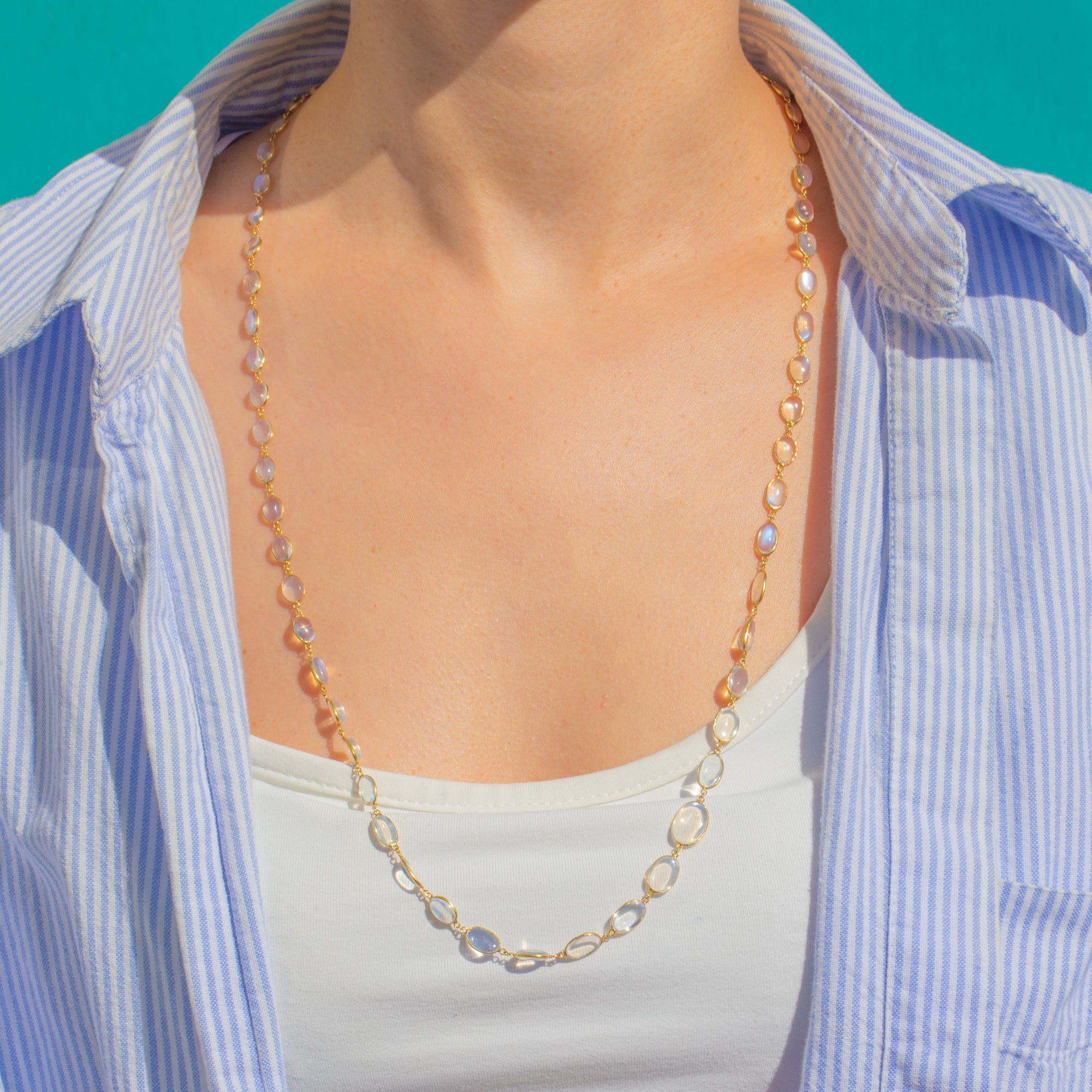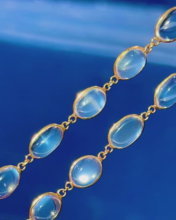 Crafted in rich 18ct Gold with a classic rivière silhouette, this piece showcases approximately 30 carats of Moonstone graduating from 6mm to 12mm long. At 26 inches, it layers beautifully or makes a serene statement worn alone—timeless, feminine and exquisitely poised.