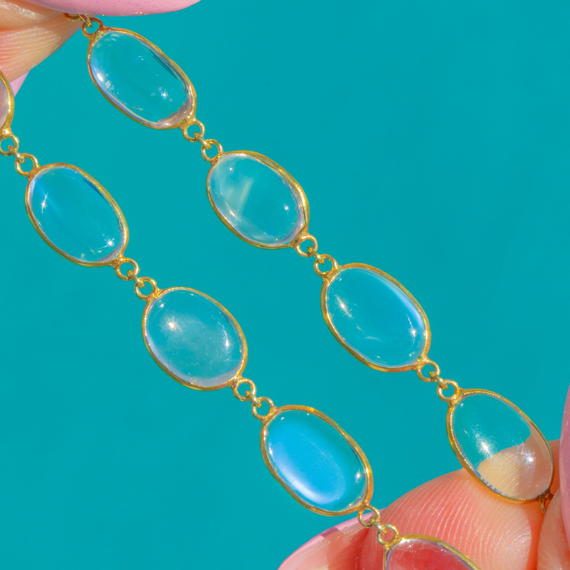 A luminous Edwardian Moonstone rivière necklace in 18ct Gold, composed of graduated oval cabochon Moonstones in elegant bezels. The cabochons glow with a soft, opalescent play of light, offering pearly and aqua flashes that dance across each stone. Refined and fluid, the articulated stations create a graceful, uninterrupted line of colour along the neckline.