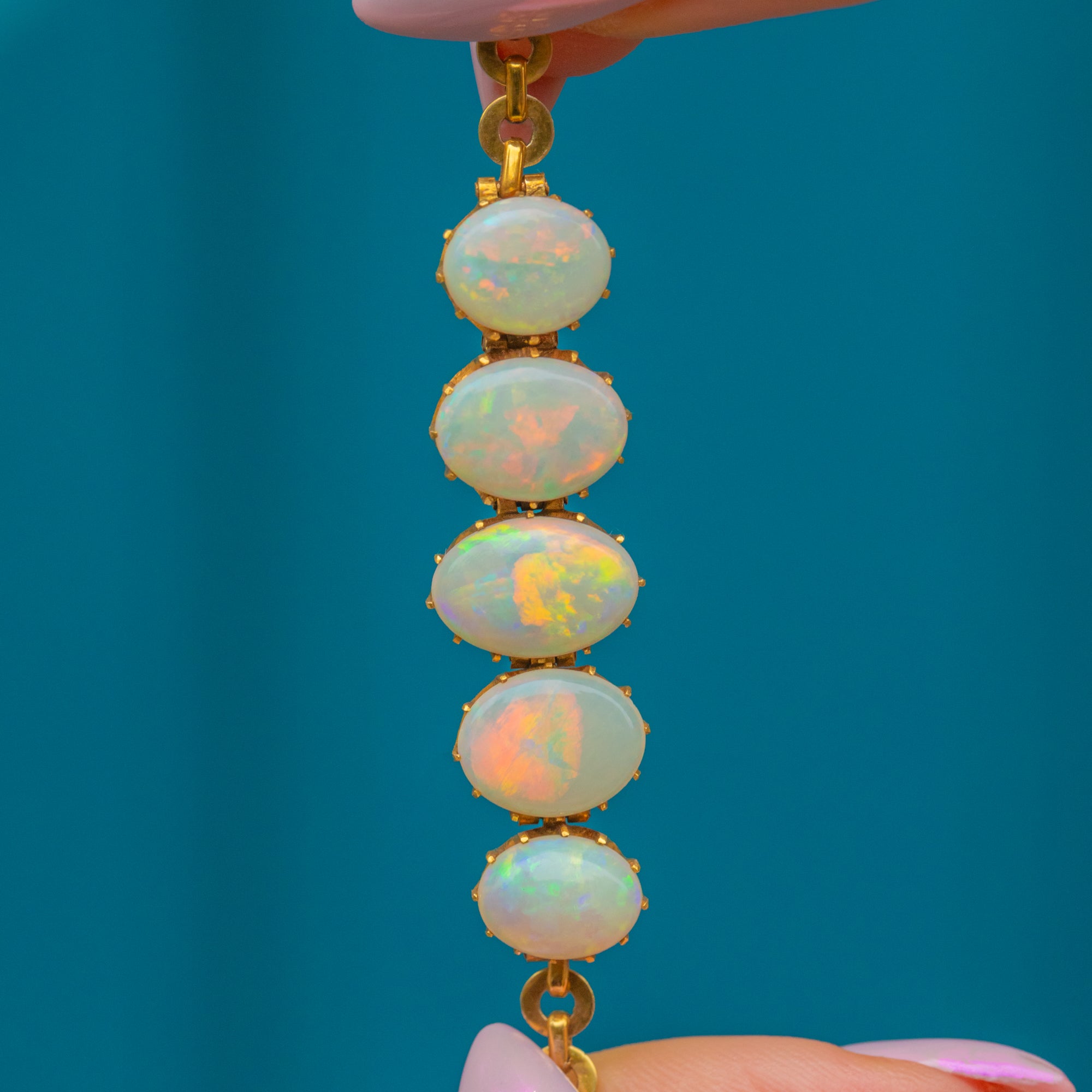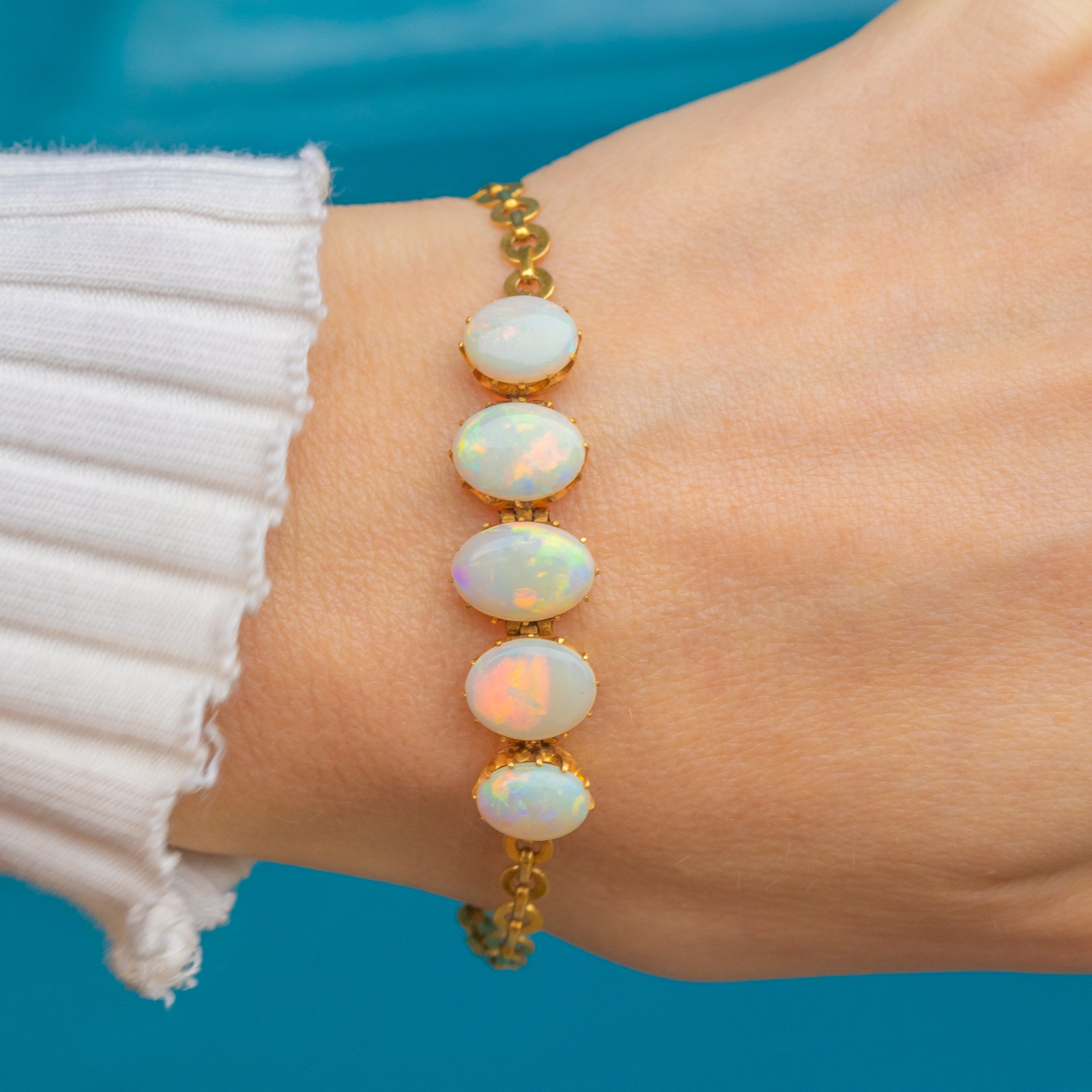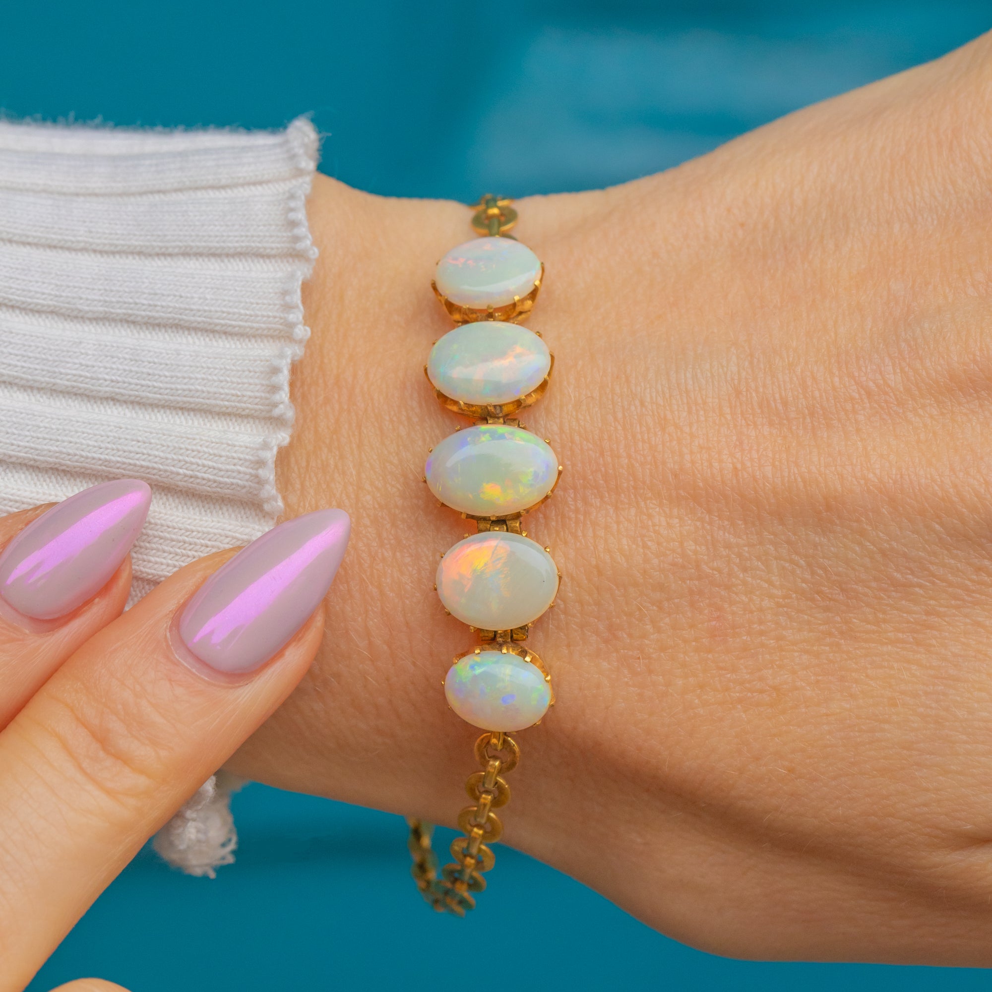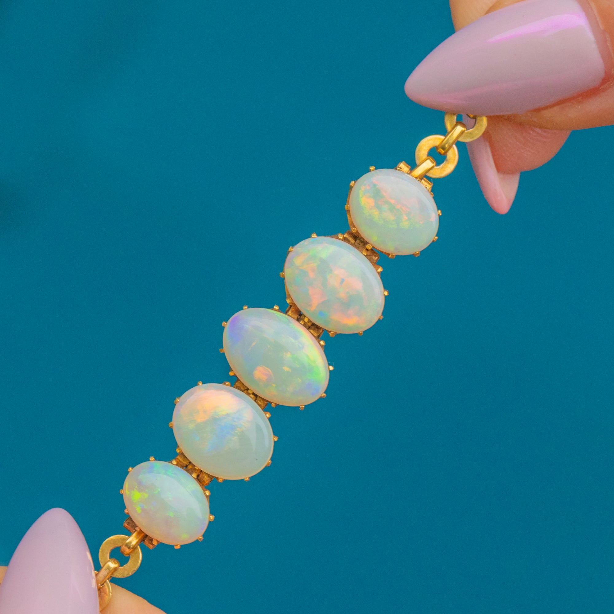 This exquisite Victorian bracelet showcases five luminous natural Opals, their vibrant flashes of green, pink and blue dancing beautifully in the light. Totalling an impressive 3.50cts!