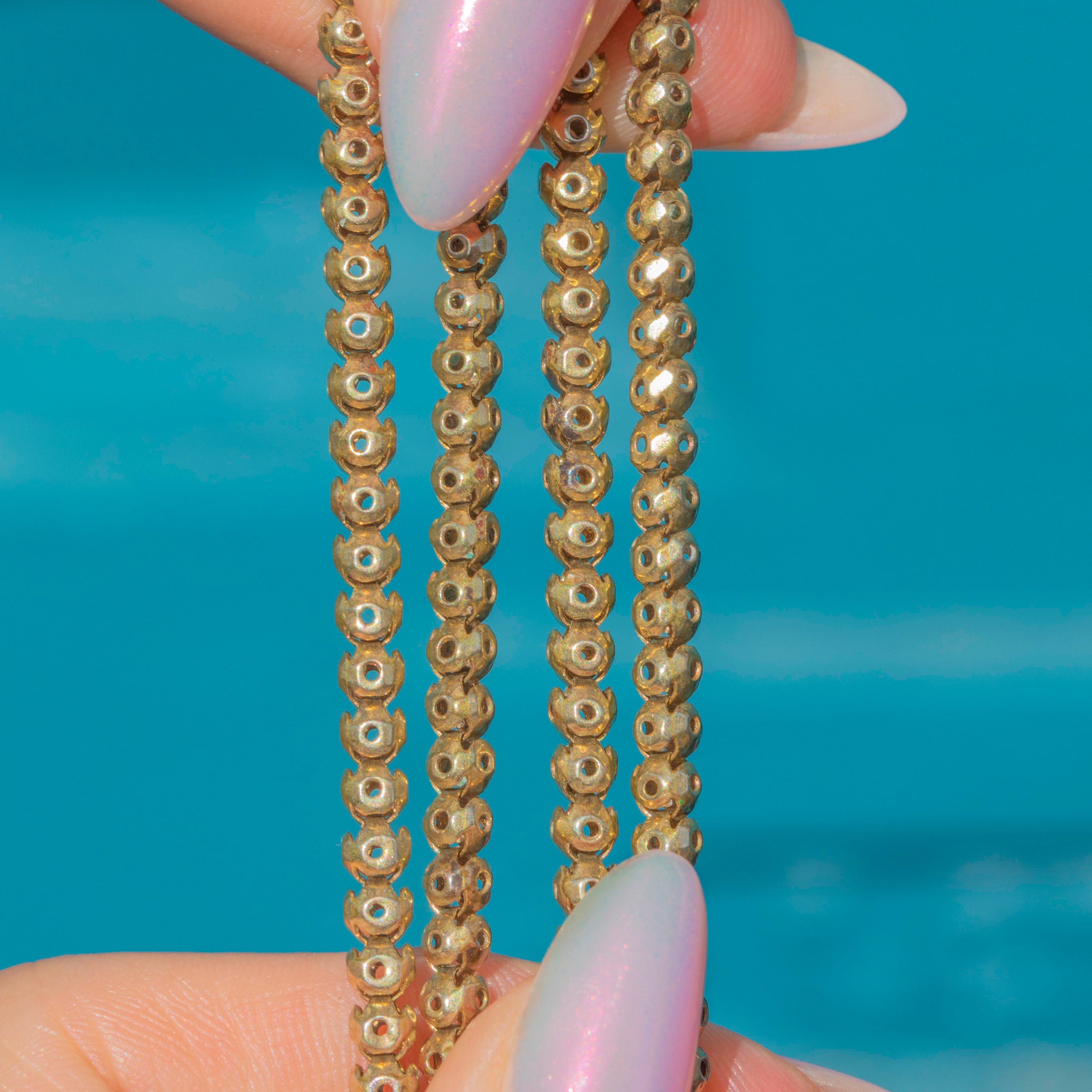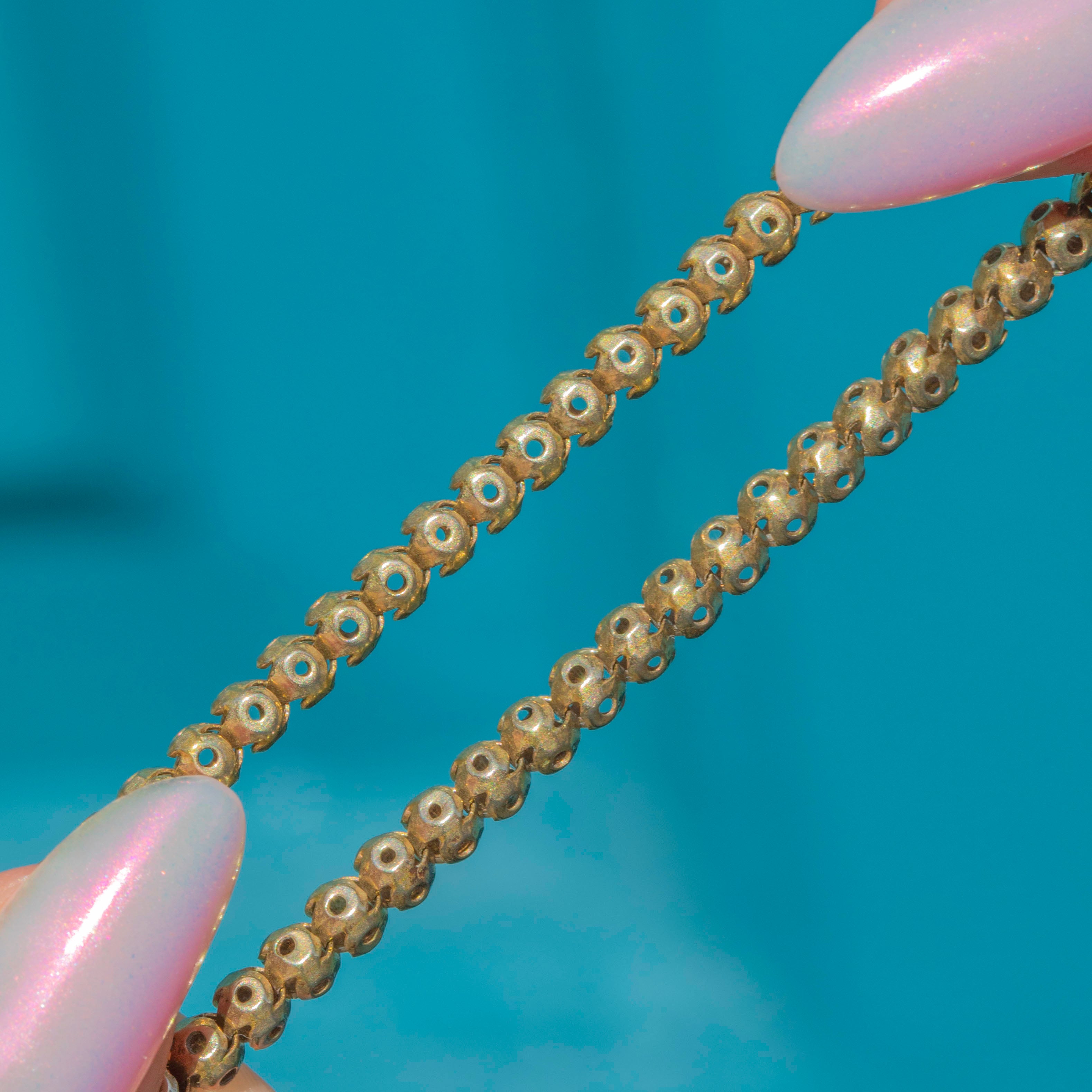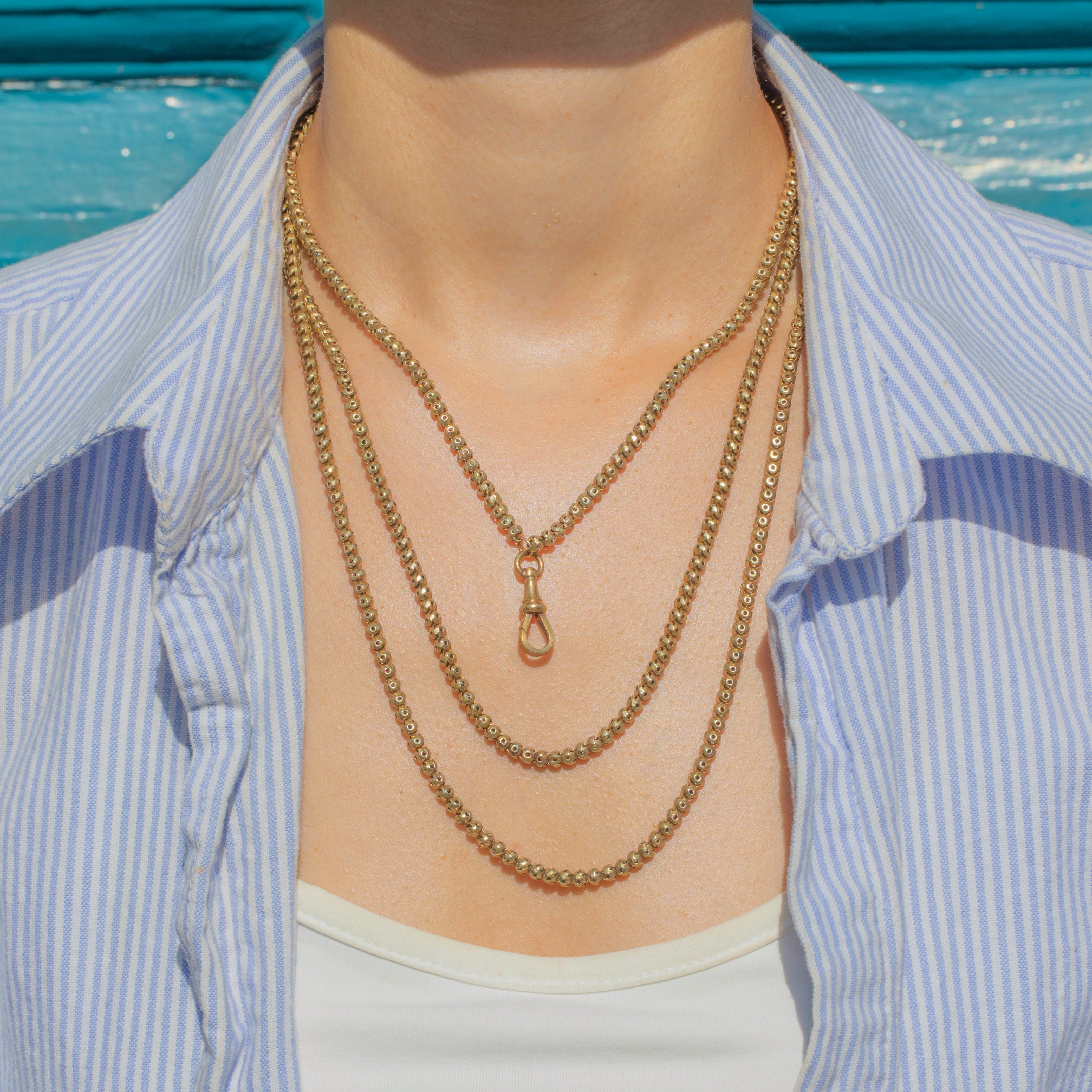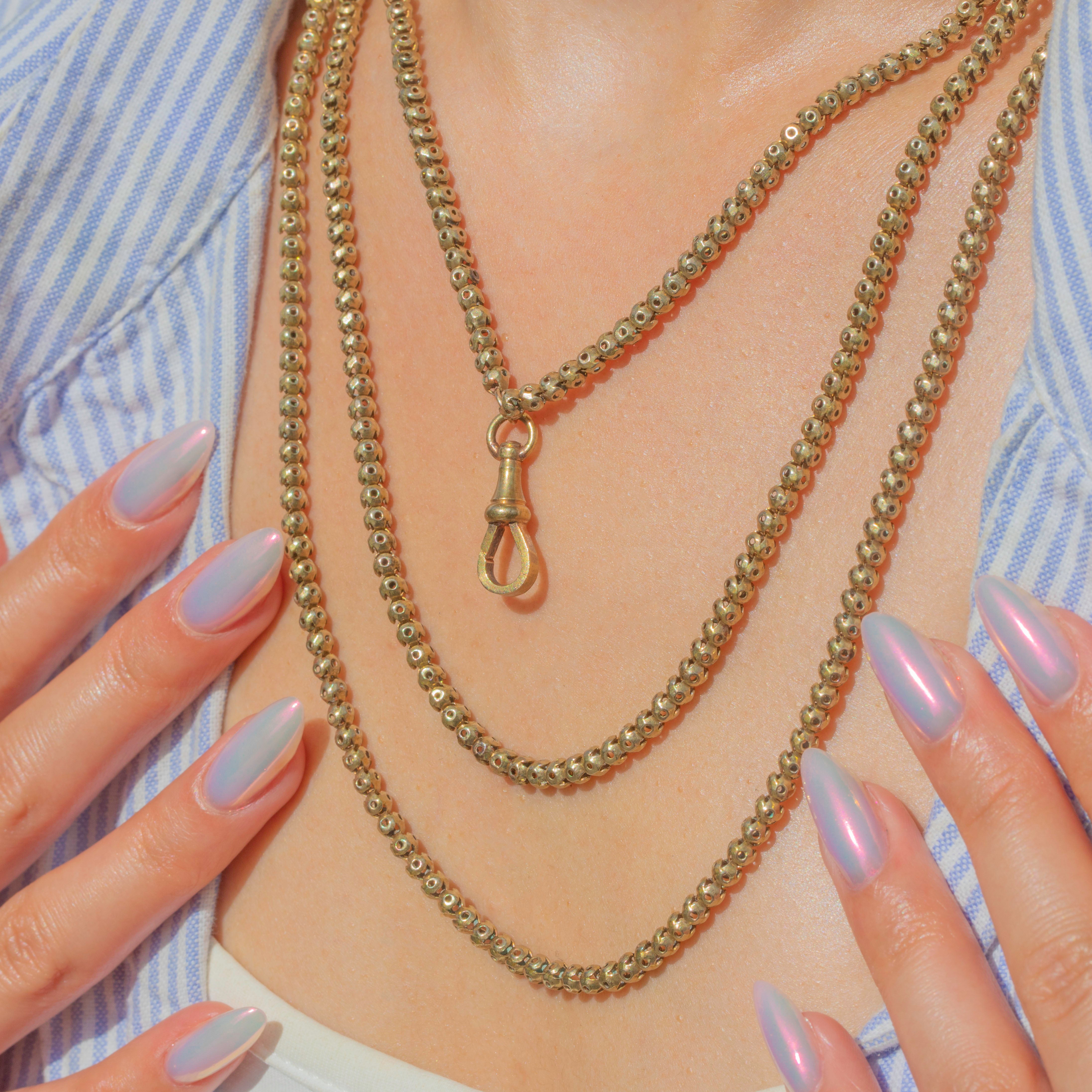 VERY GOOD: The links are secure and the generous 58" length makes her a great piece for layering. There are some signs of surface wear, including discolouration to the dog-clip, though it is fully functioning. A lovely, cost-effective piece, this antique chain is a must-have!