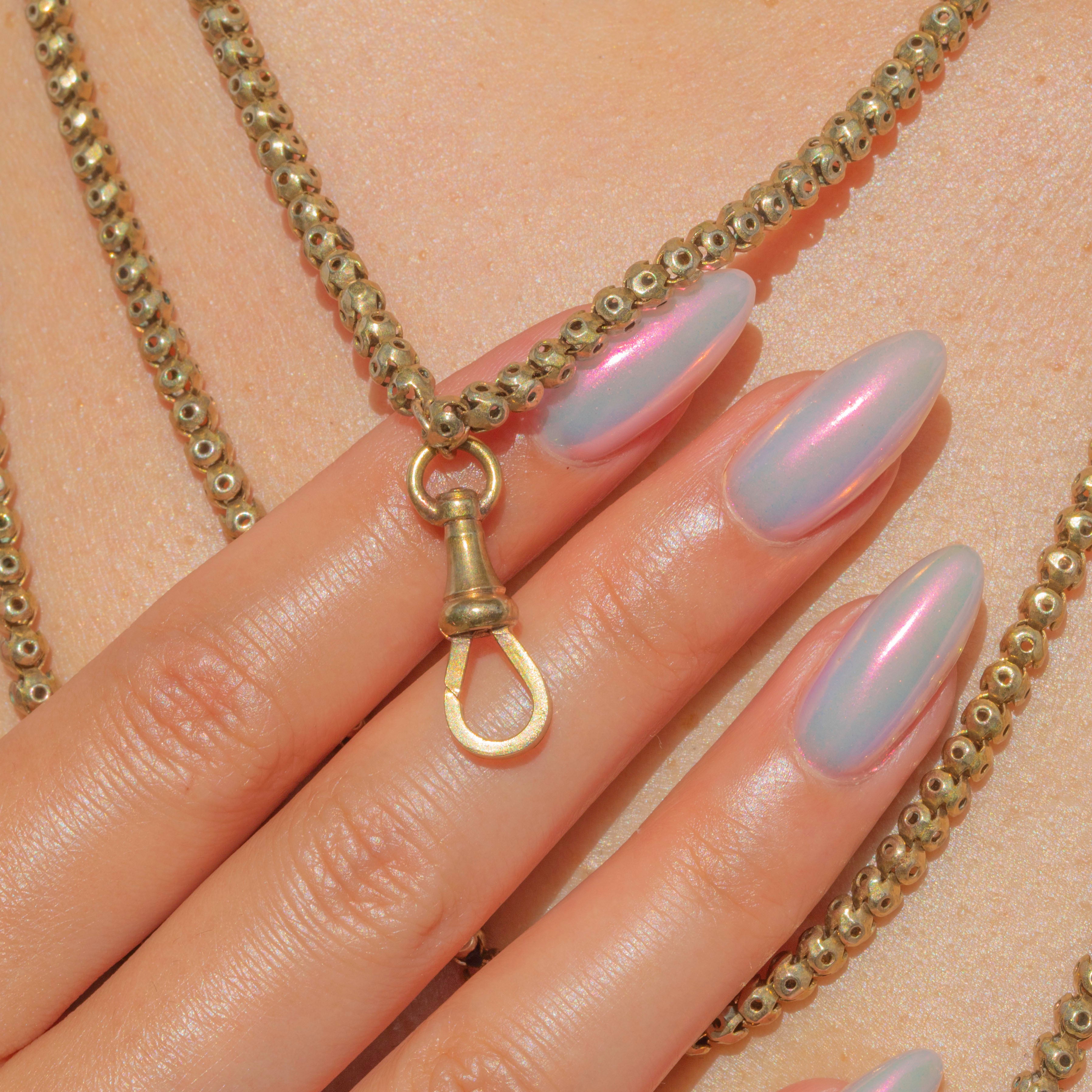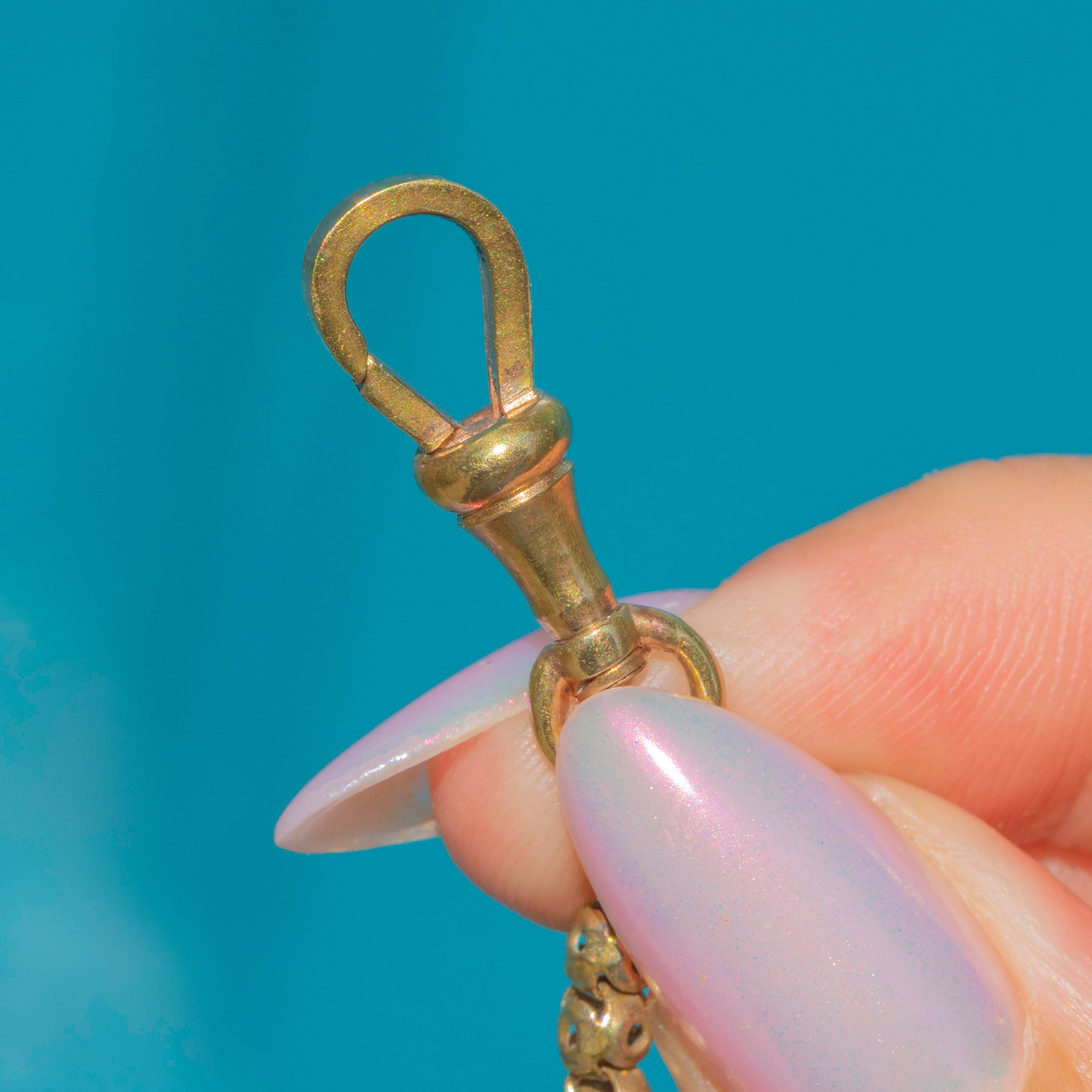 This Victorian longuard chain features gorgeous pierced links, providing a lovely texture, and is complete with a highly sought-after dog-clip, giving you endless styling options.