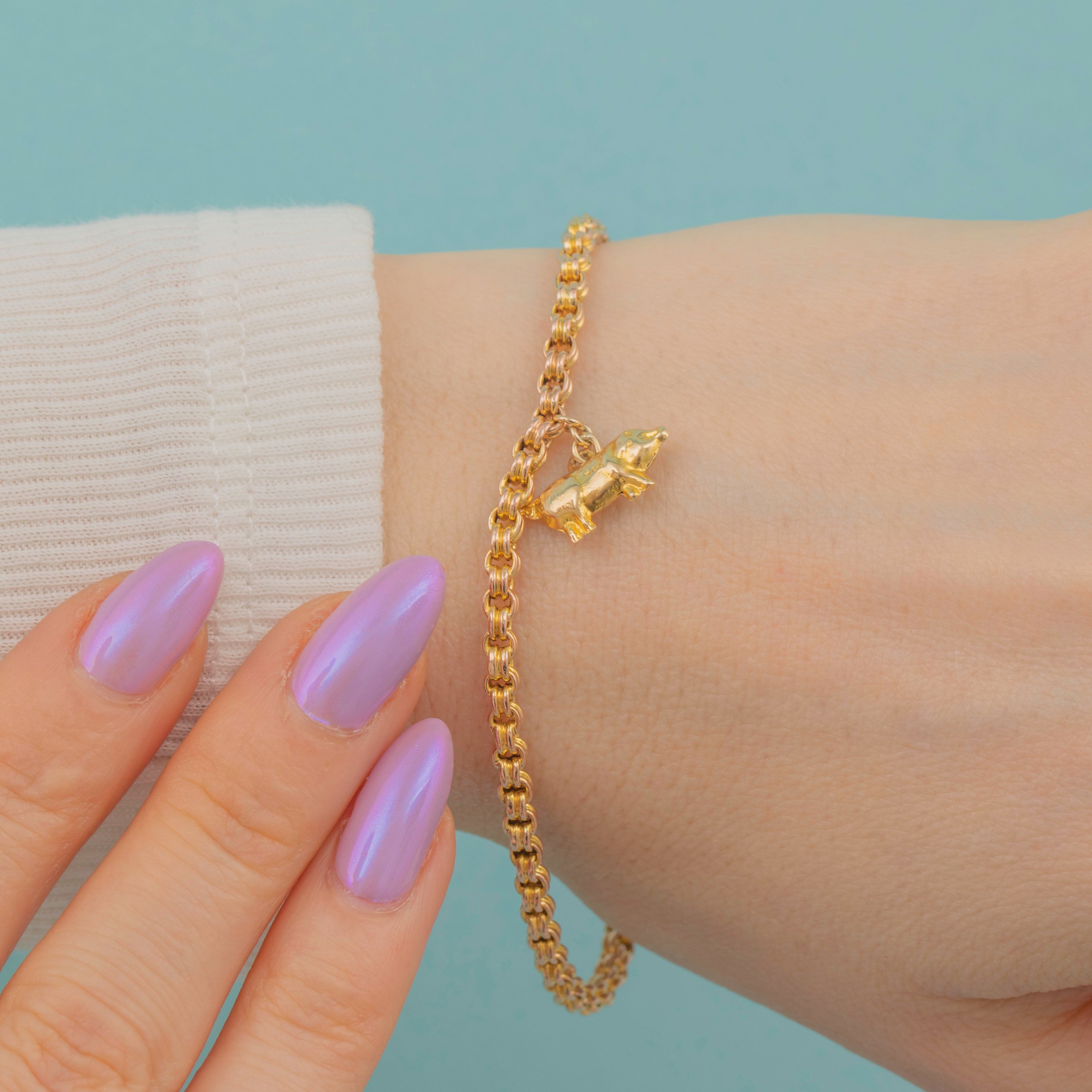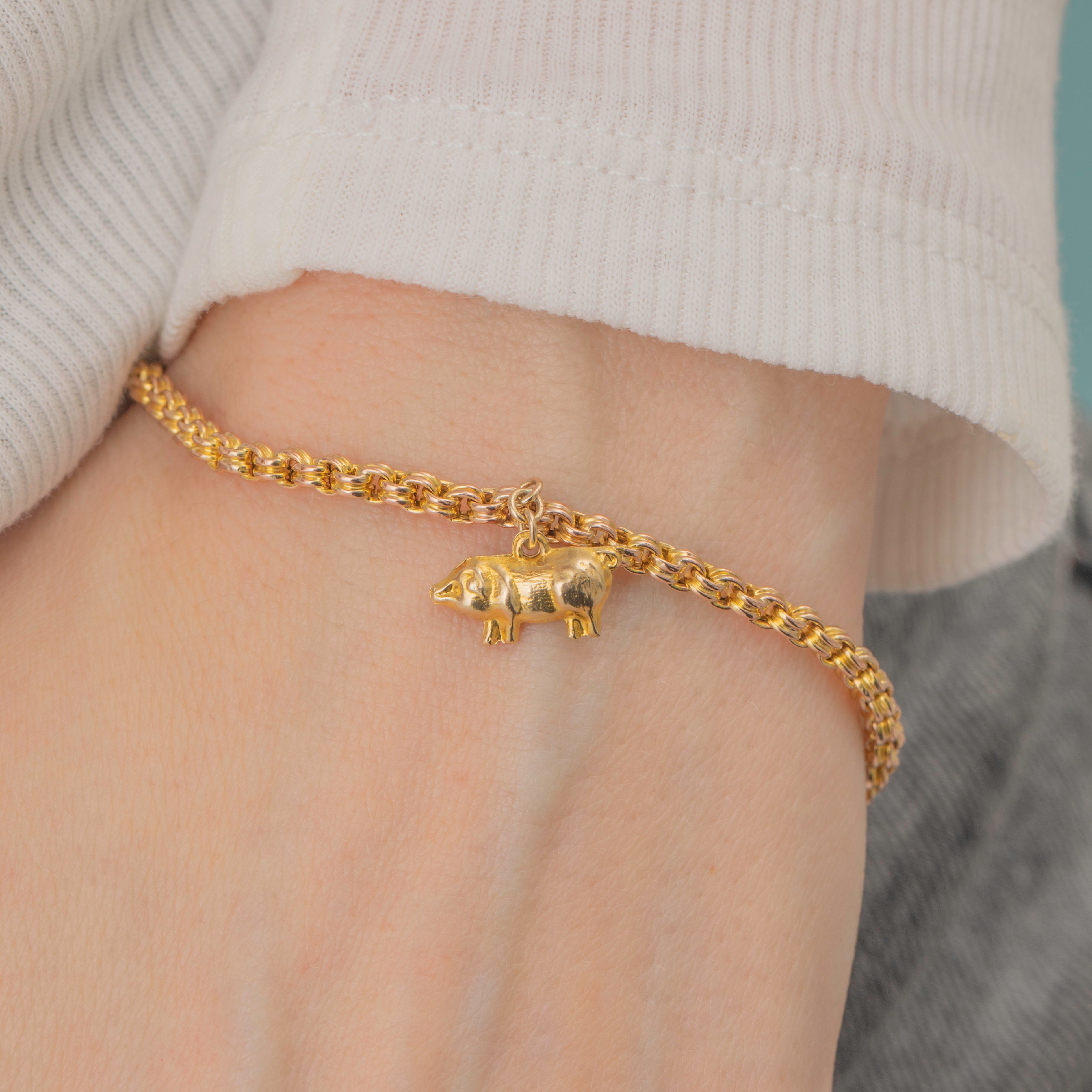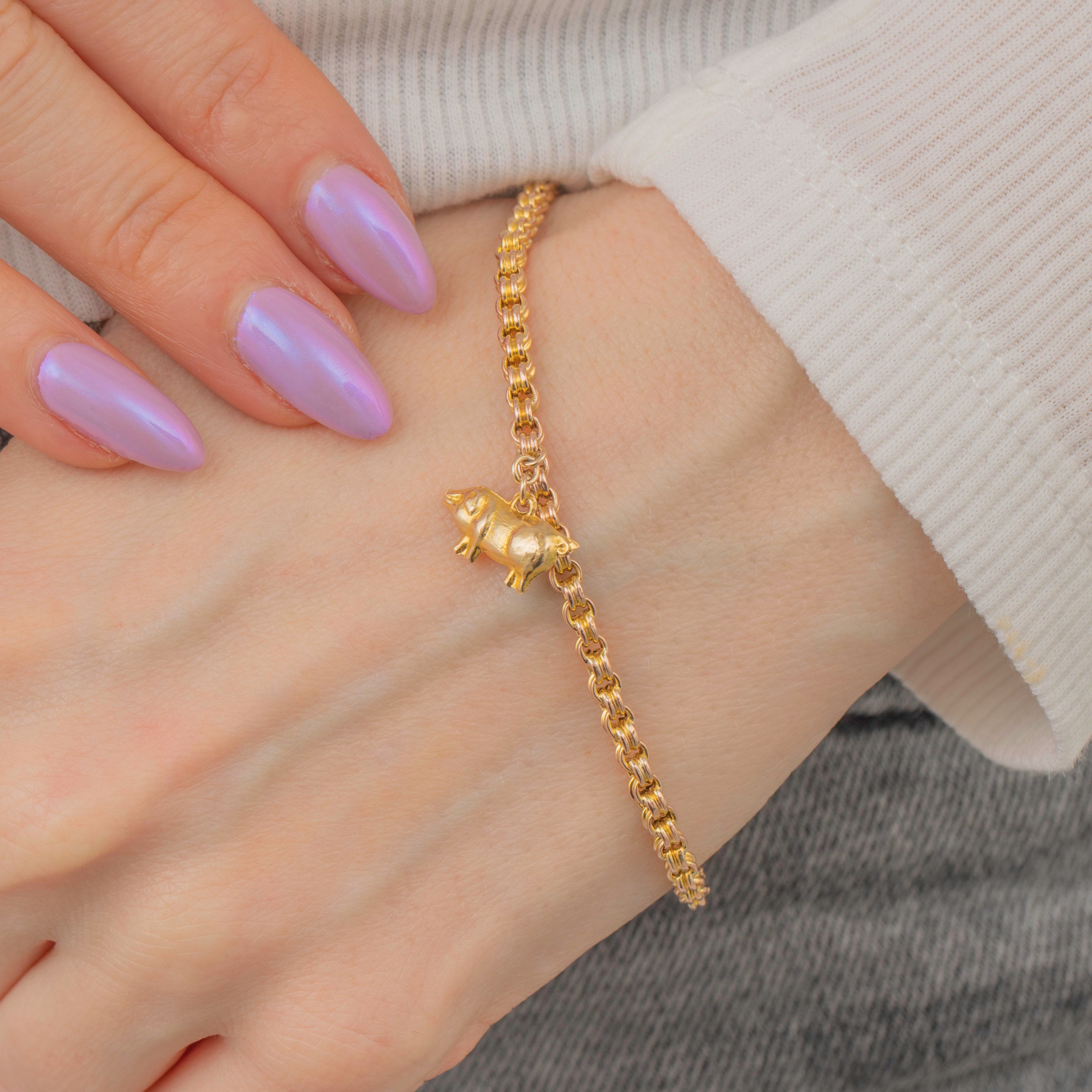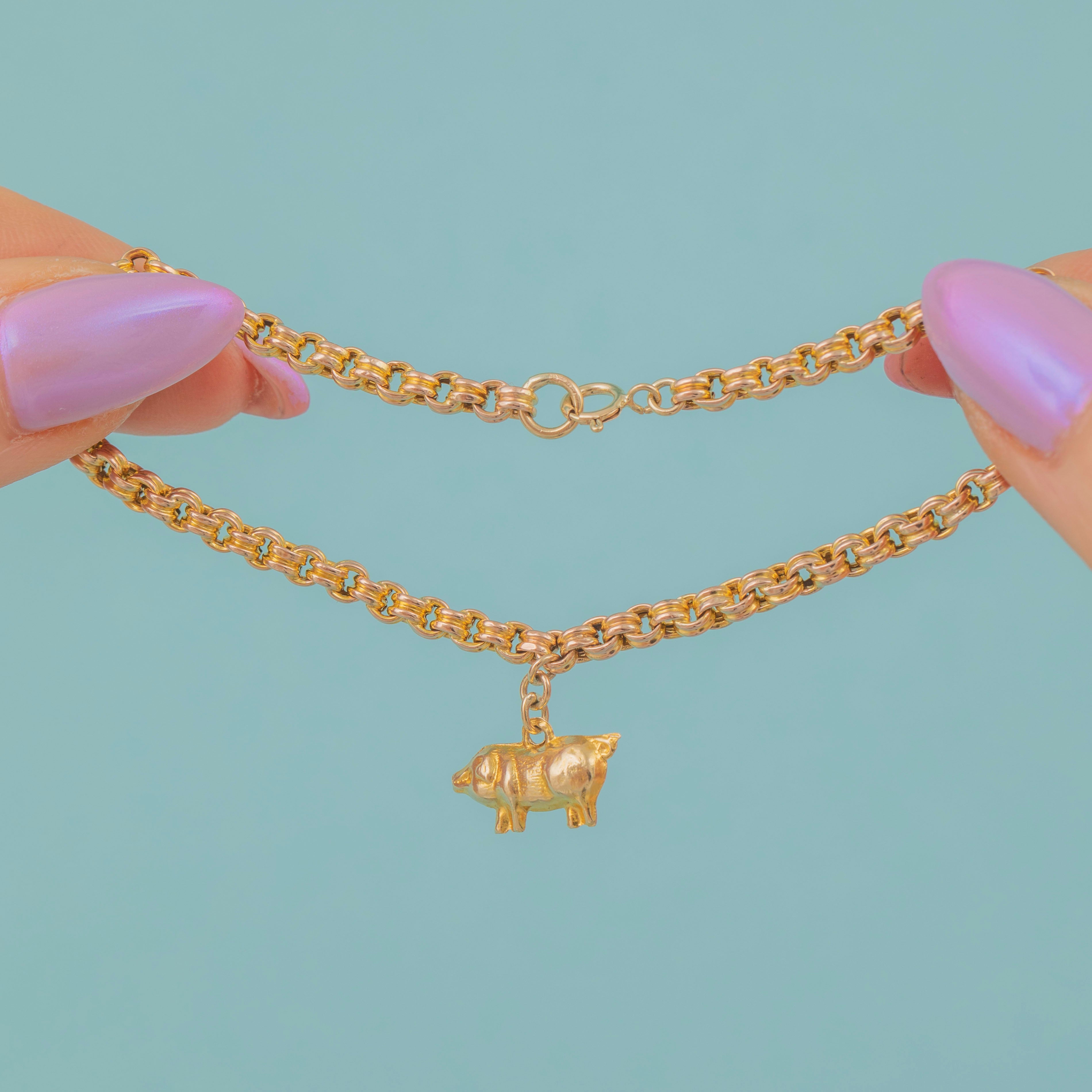 Victorian jewellery was often steeped in symbolism and this piece is no exception, with pigs worn as a talisman for good luck and fortune. The solid Gold pig charm is suspended from chunky double belcher links giving this Victorian bracelet a robust feel that can be worn with confidence!