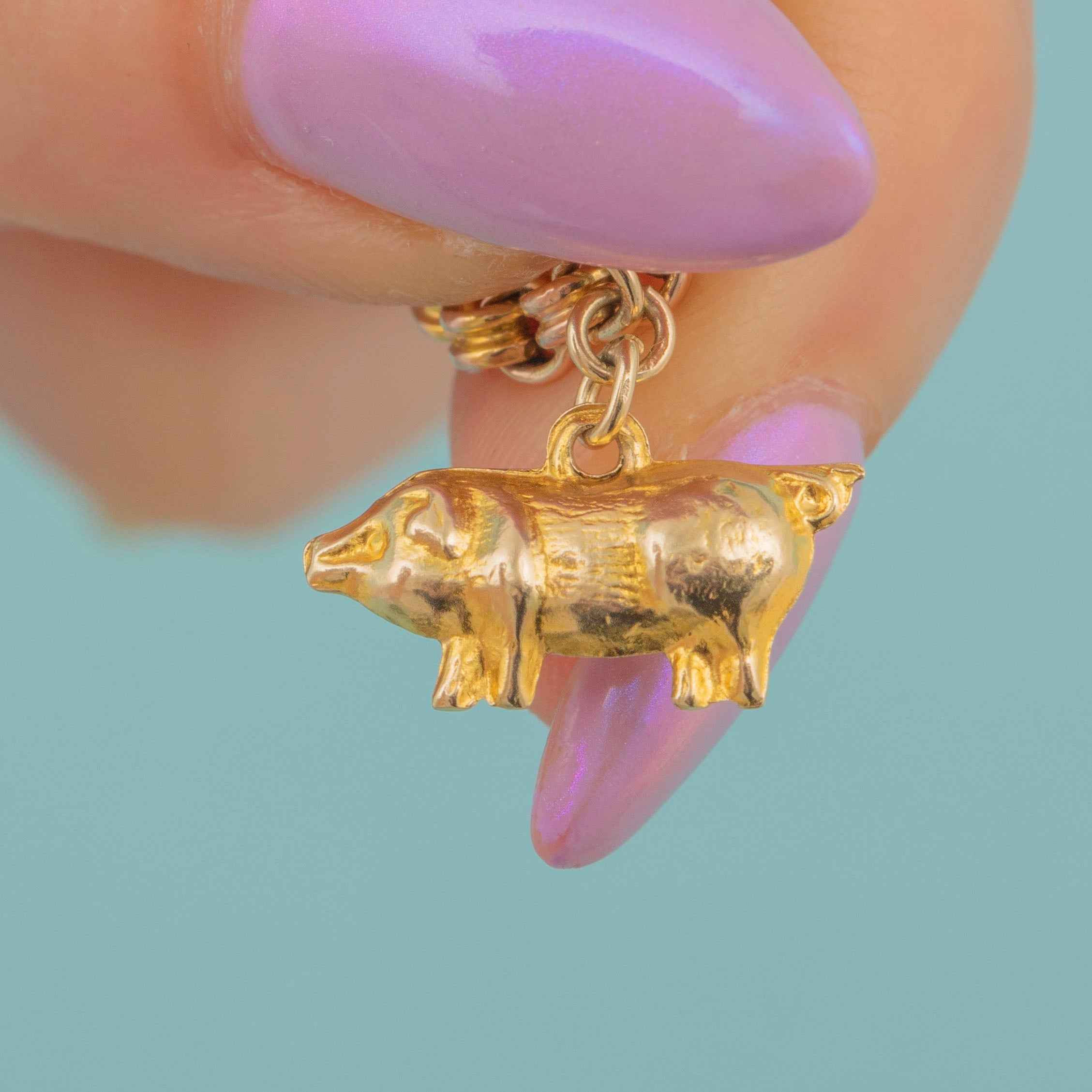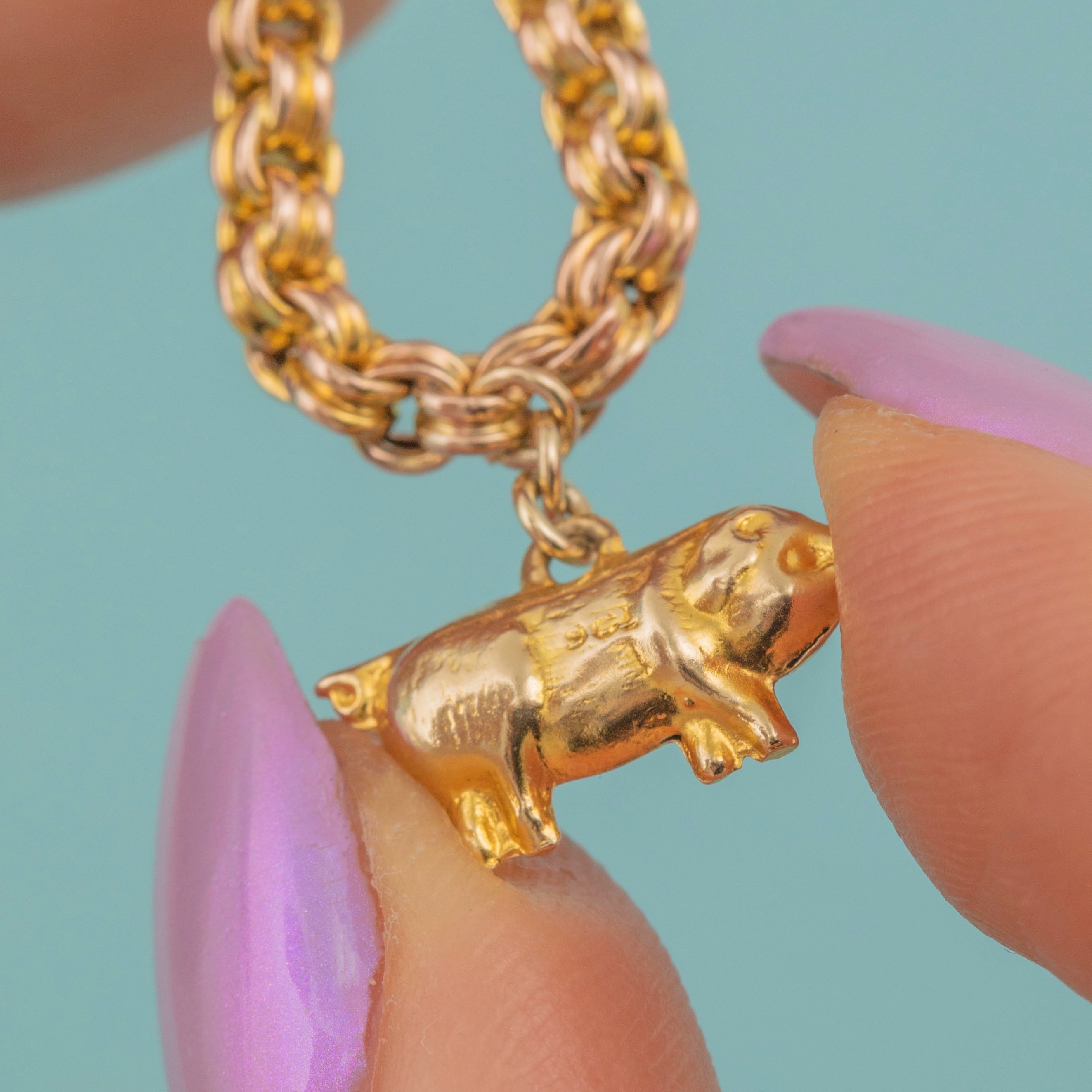 We love this antique 9ct Gold belcher bracelet! Crafted from 9ct Gold, this lovely bracelet would be a fitting gift for a loved one with a penchant for cute piggies! You can clearly see the naturalistic fine detail and effort that went into truly capturing the pig's appearance, from the fine hair to its eyes and snout! This pig's got attitude!