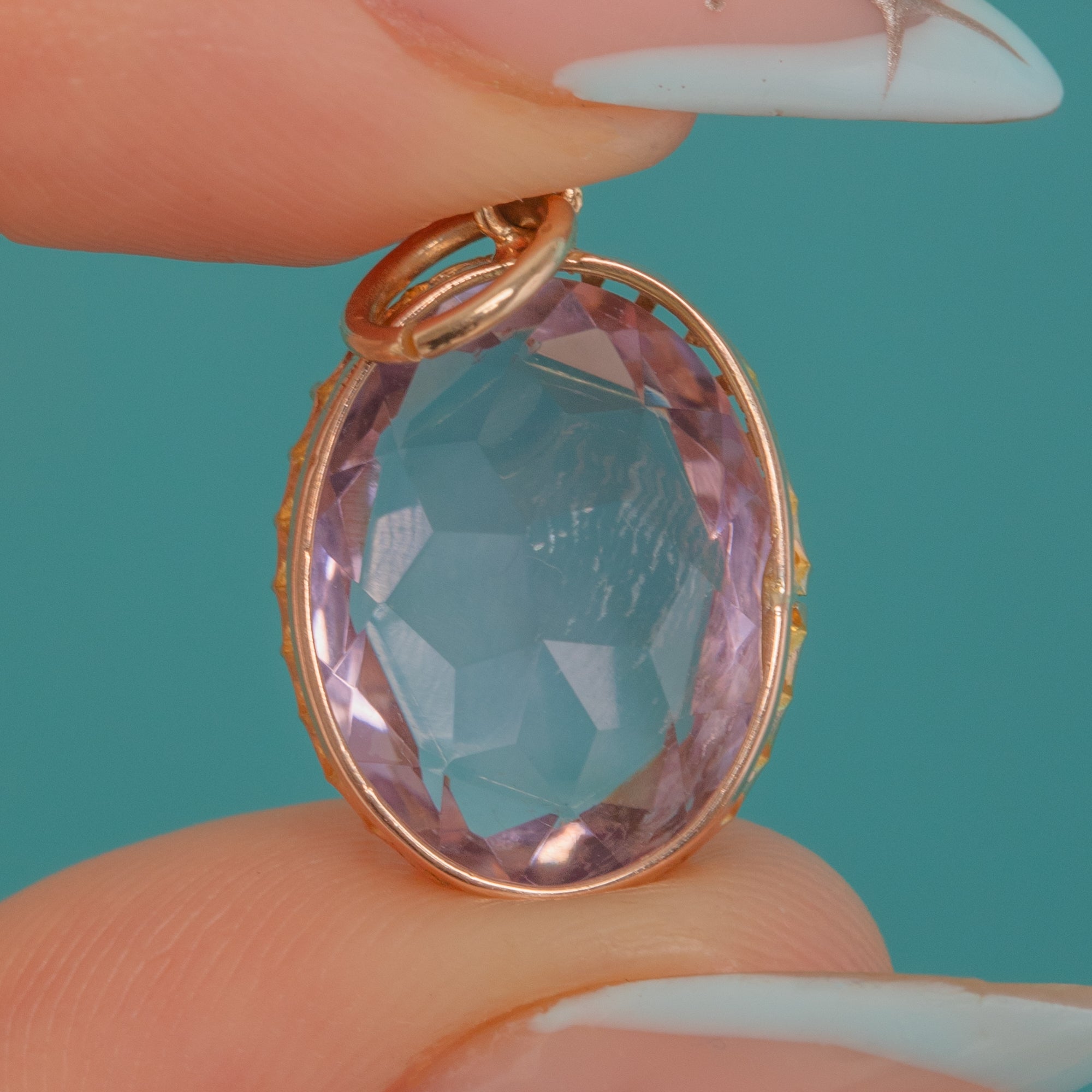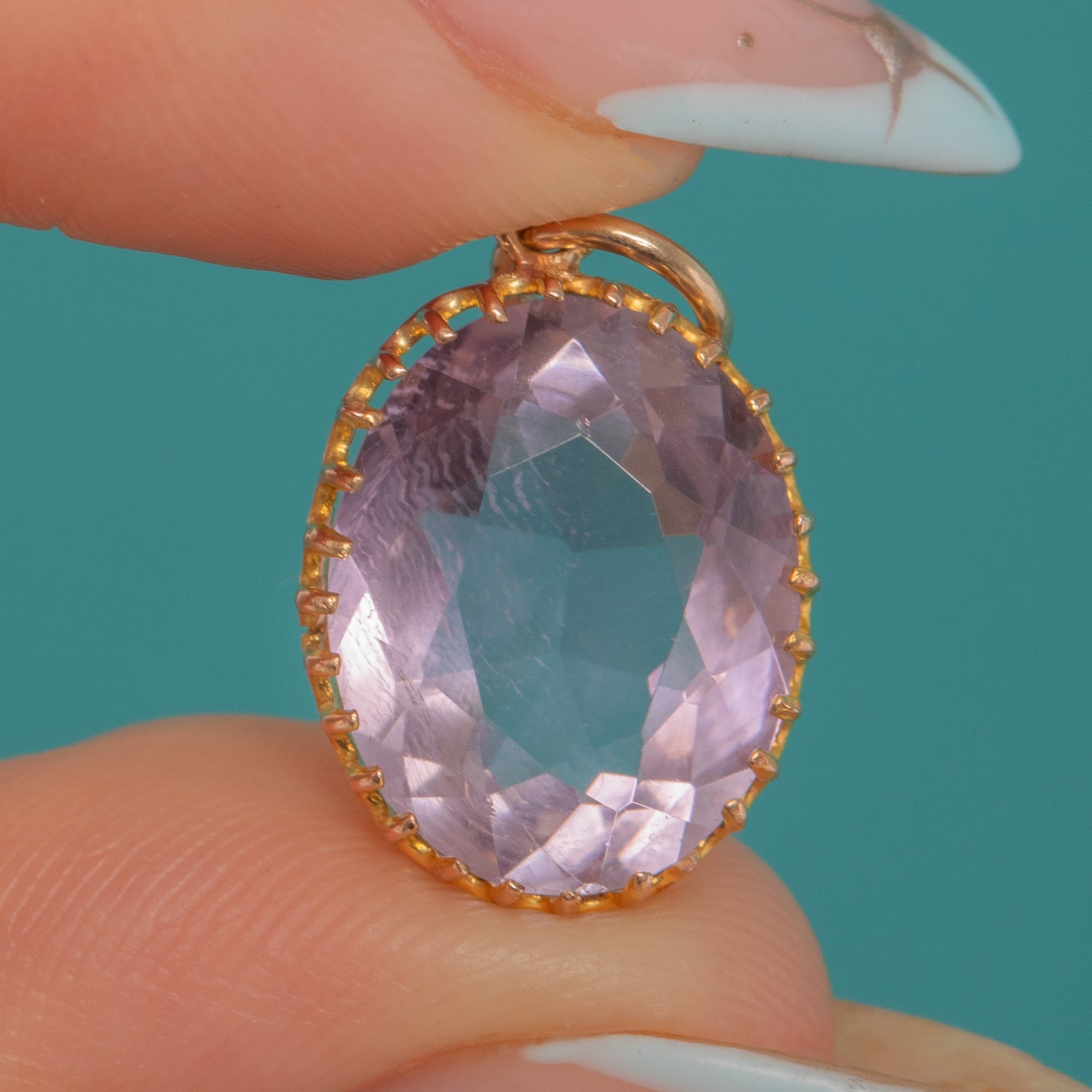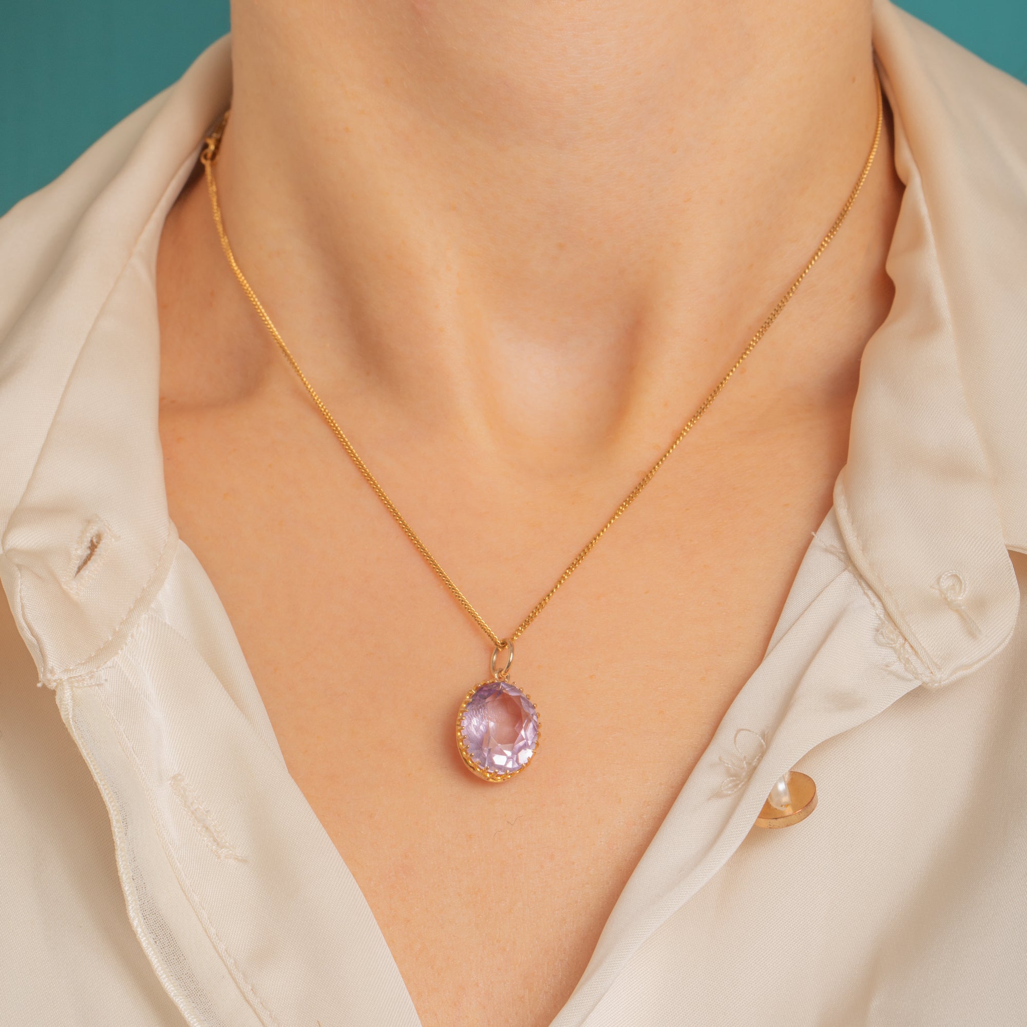 Classic Victorian in feel, the refined open-back setting and neat jump ring bail make this an effortlessly wearable piece, perfect for adding a whisper of colour to any look. With its graceful proportions and finely detailed Goldwork, it’s a timeless jewel you’ll reach for again and again.