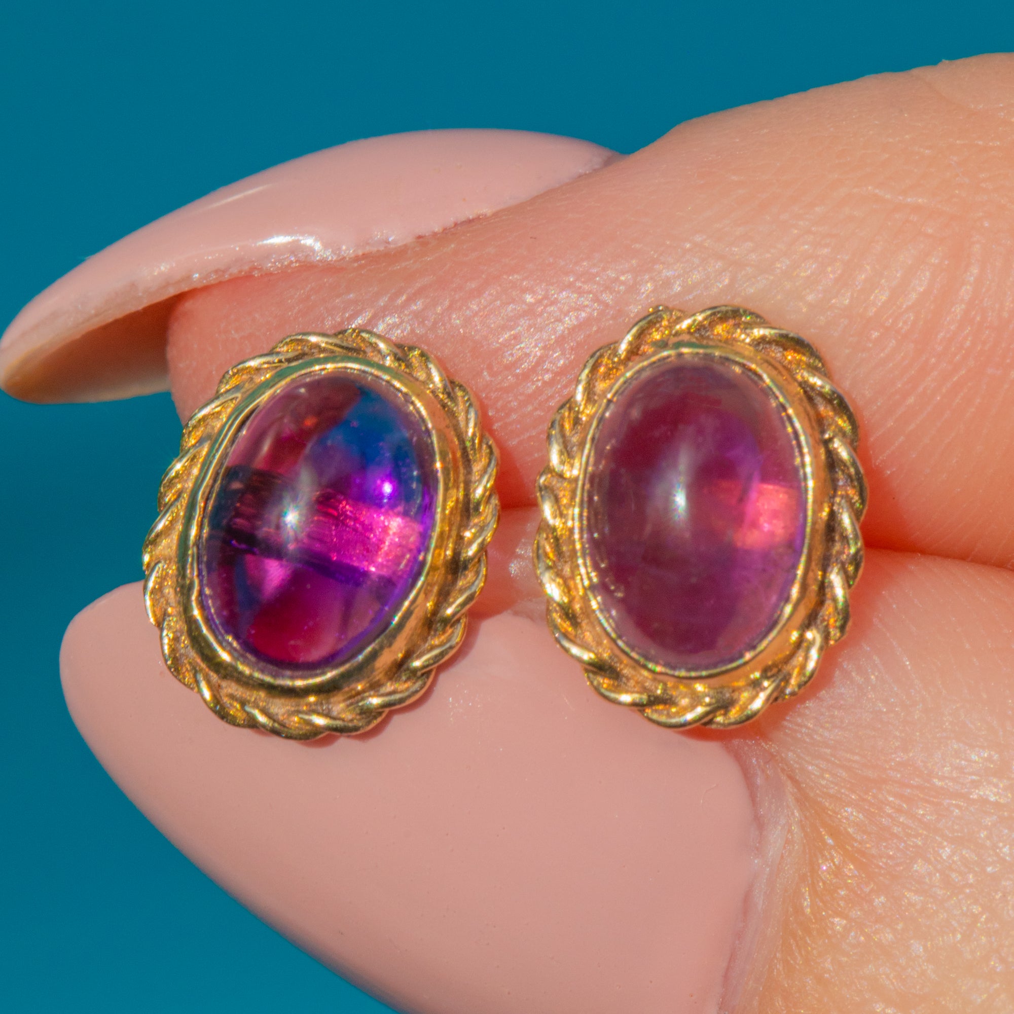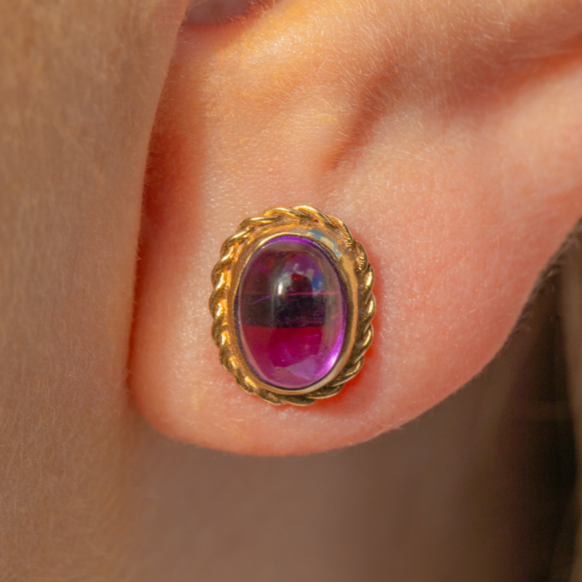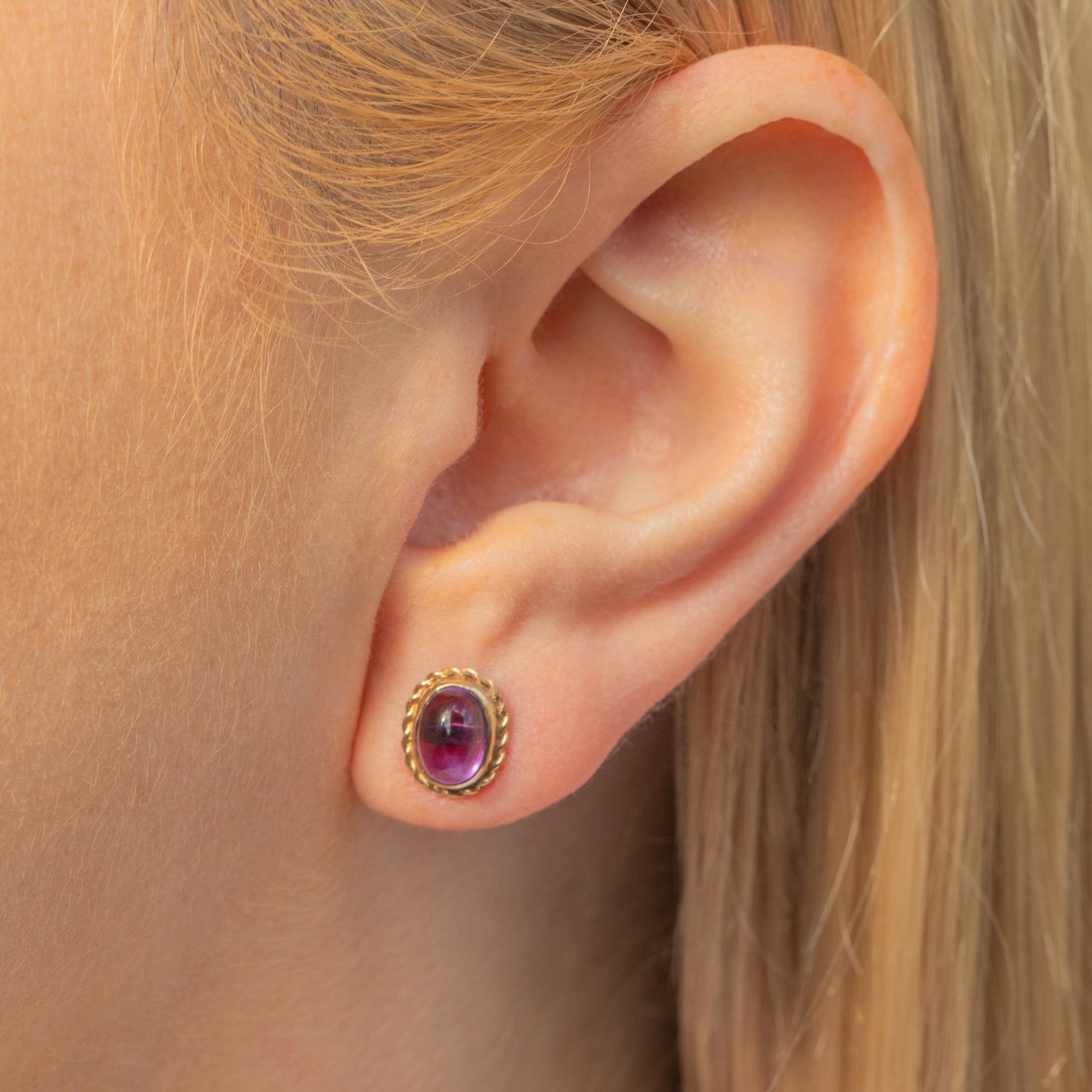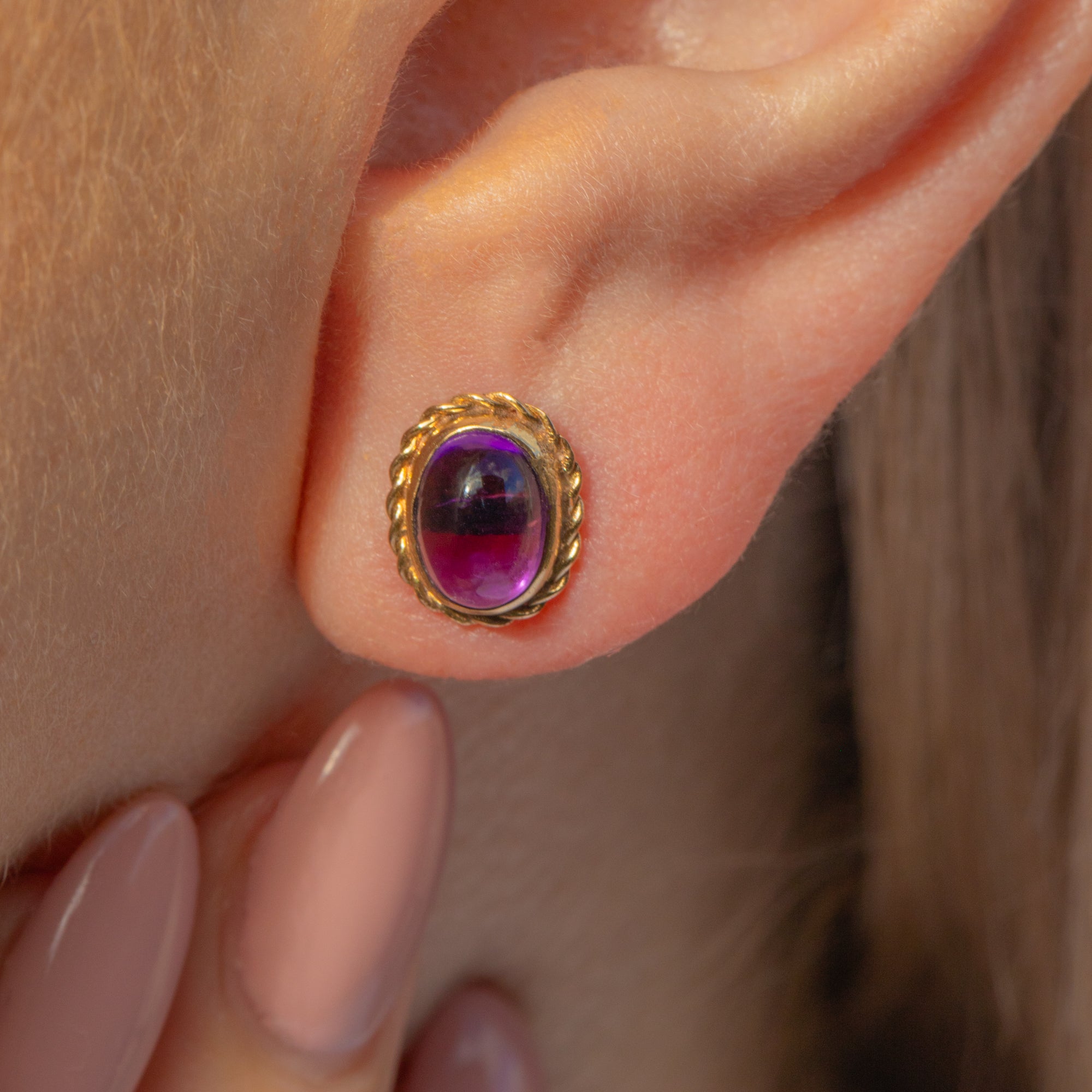 Add a pop of colour to your lobes with these gorgeous 9ct Gold Amethyst cabochon stud earrings! Rich in hues of lavender and lilac, these vintage stud earrings capture the light beautifully, exuding sophistication and charm.