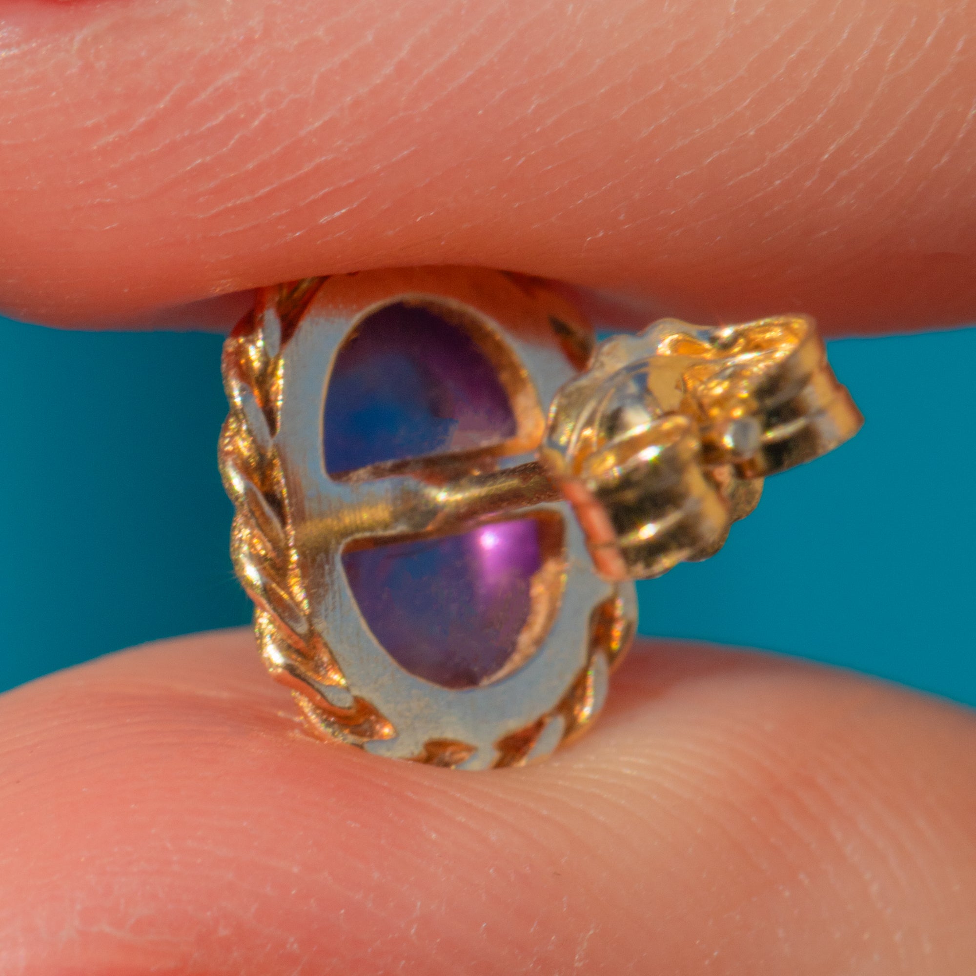 The gorgeous Amethyst cabochons sit gracefully within their intricately detailed 9ct Gold bezels, with the buttery yellow Gold tones effortlessly complimenting the soft purple tones of the Amethyst. These vintage stud earrings are the perfect combination of subtle and colourful, making them the perfect versatile pair for both everyday and occasion wear!
