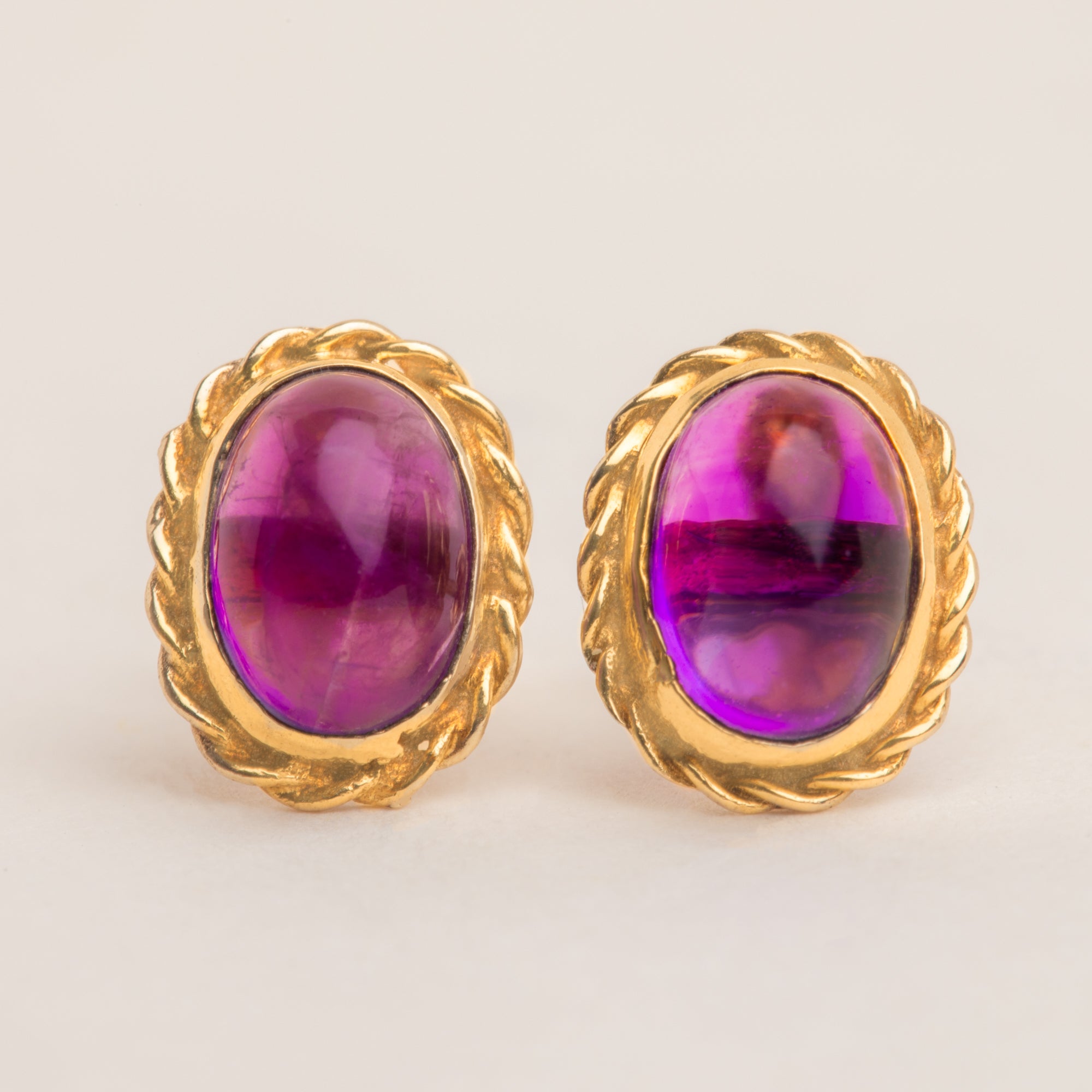 VERY GOOD. These 9ct Gold Amethyst cabochon stud earrings are in great condition. The Amethyst cabochons capture the light wonderfully, sitting securely within their intricate bezel settings, and are free from any scratches or nibbles. There are some minor signs of wear to the Gold bezels, however this is unnoticeable when wearing and does not detract from the beauty of these vintage earrings. These vintage Amethyst earrings are a must-have!