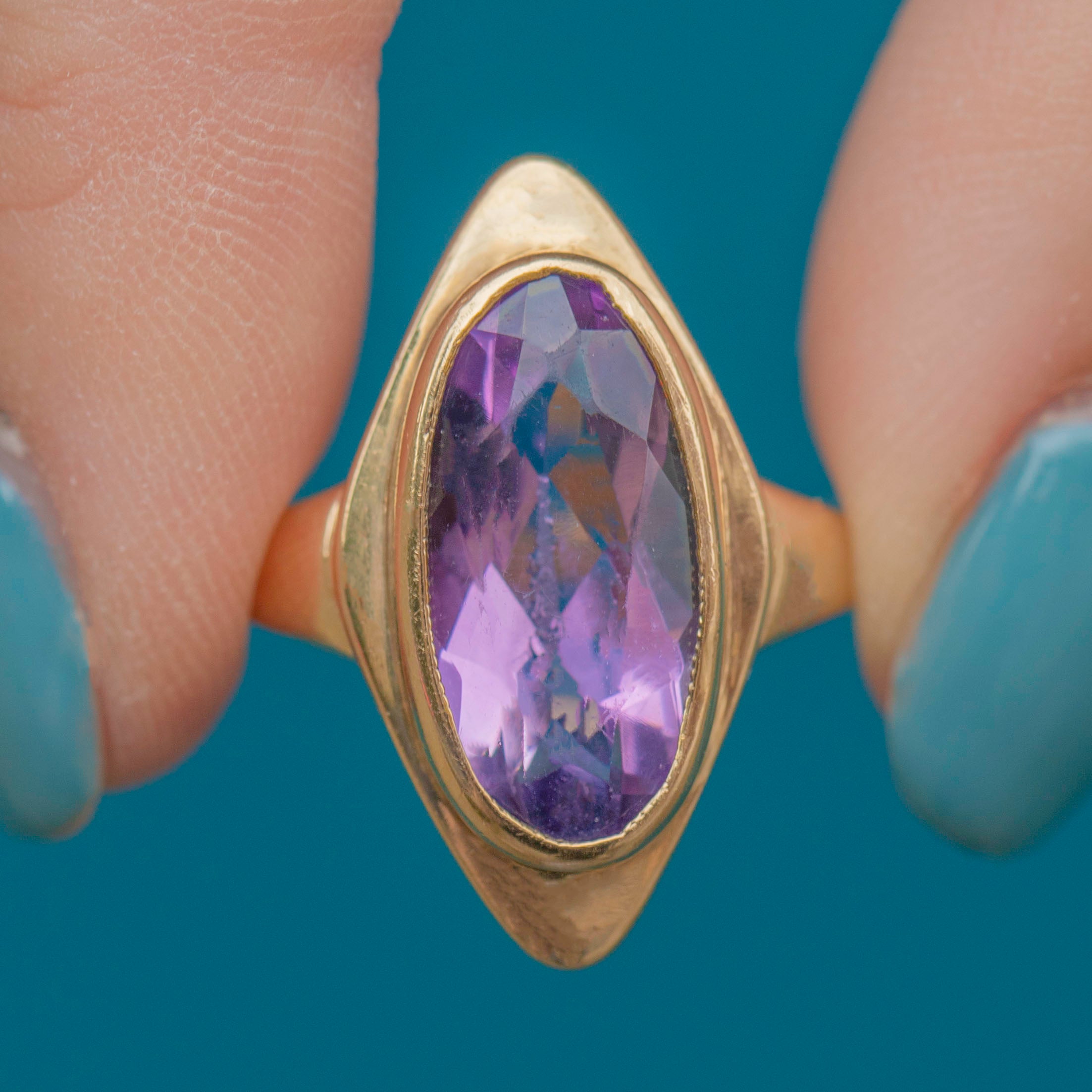 At 3.00ct her plush purple Amethyst enhanced by her buttery 9ct Gold setting, a royal delight! This ring is a perfect example of Mid-Century Vintage style, sure to make a bold and unforgettable statement!