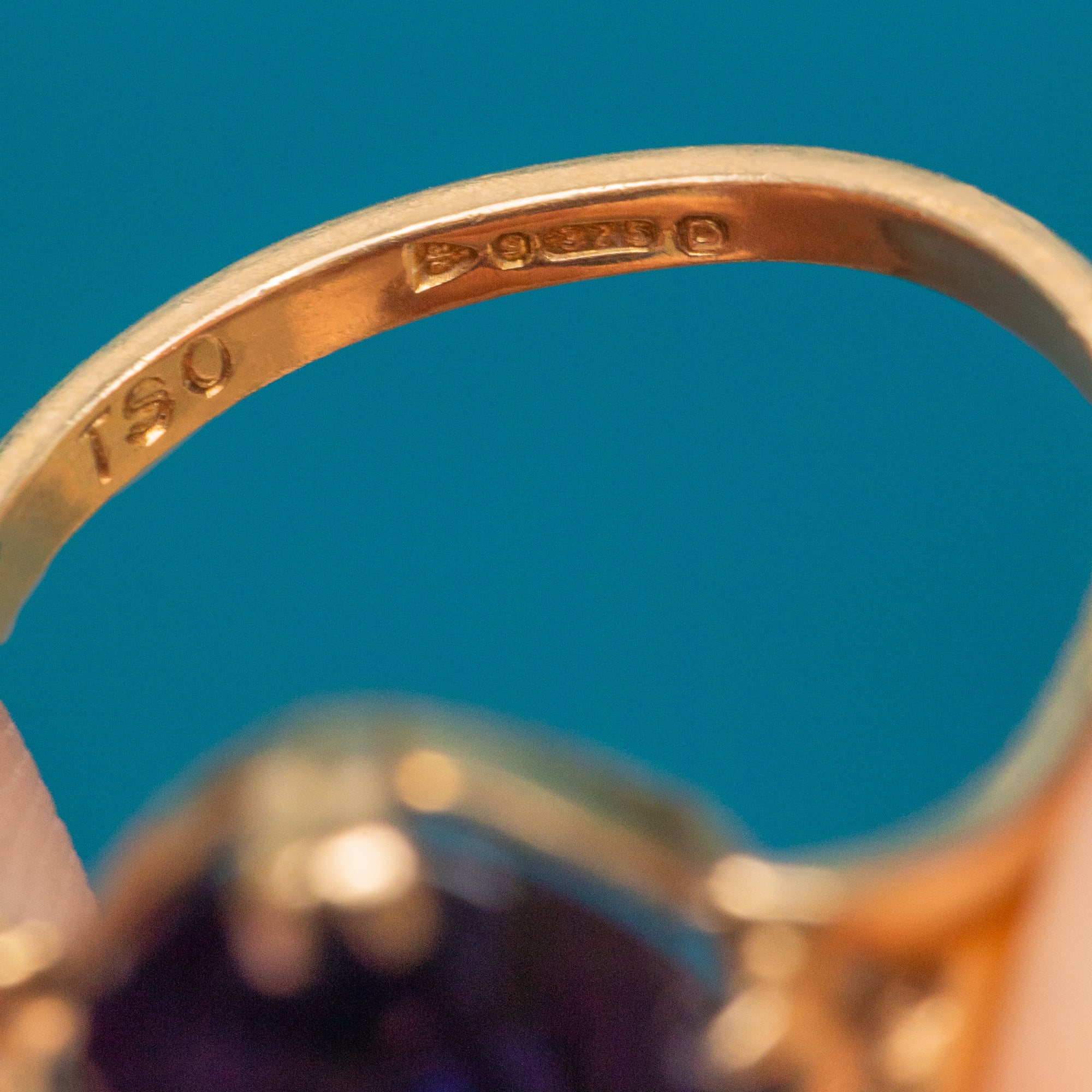 EXCELLENT. This 9ct Gold Amethyst oval ring is in excellent condition. The Amethyst is secure within the tapered settings and boasts a rich hue throughout. The Gold has a strong saturation to match, with no damage to note!