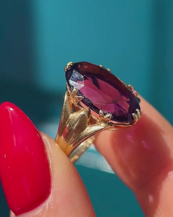 This decadent 9ct Gold Amethyst oval ring is truly spectacular. A gorgeous mid-century find, she boasts a 5.60ct Amethyst with a divine purple complexion. Crafted from sumptuous 9ct Gold, her tapered claws and shoulders beautifully capture the gemstone centrepiece.