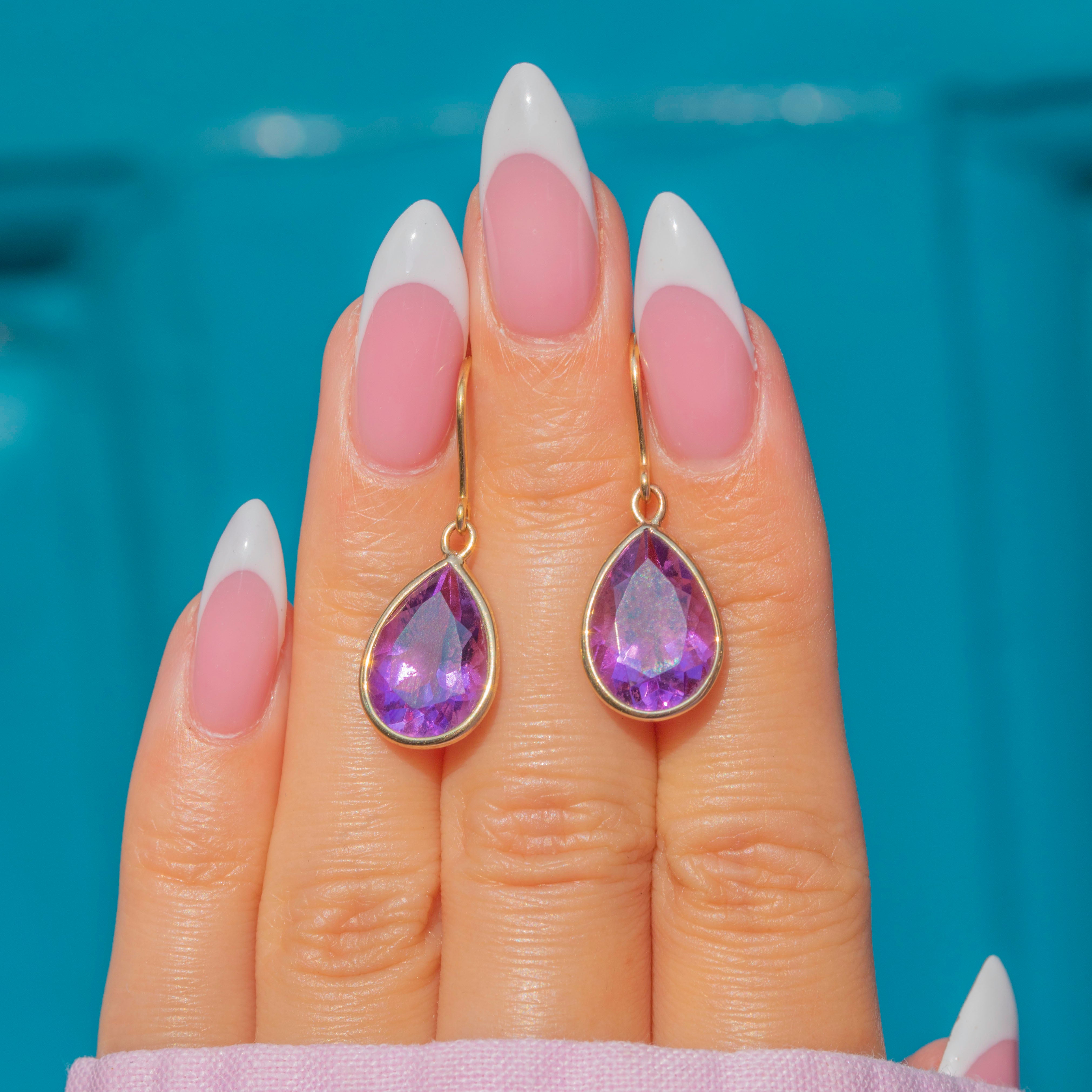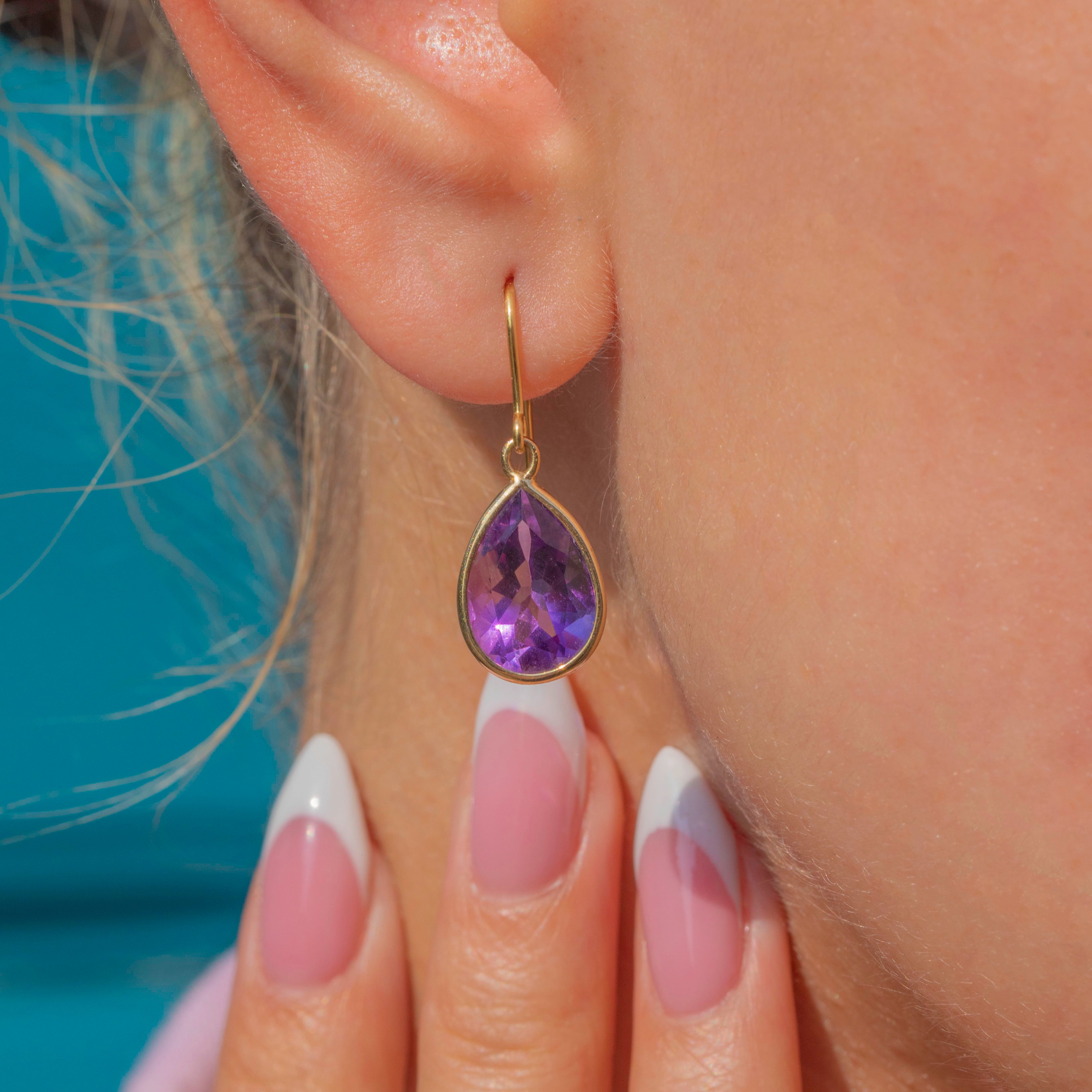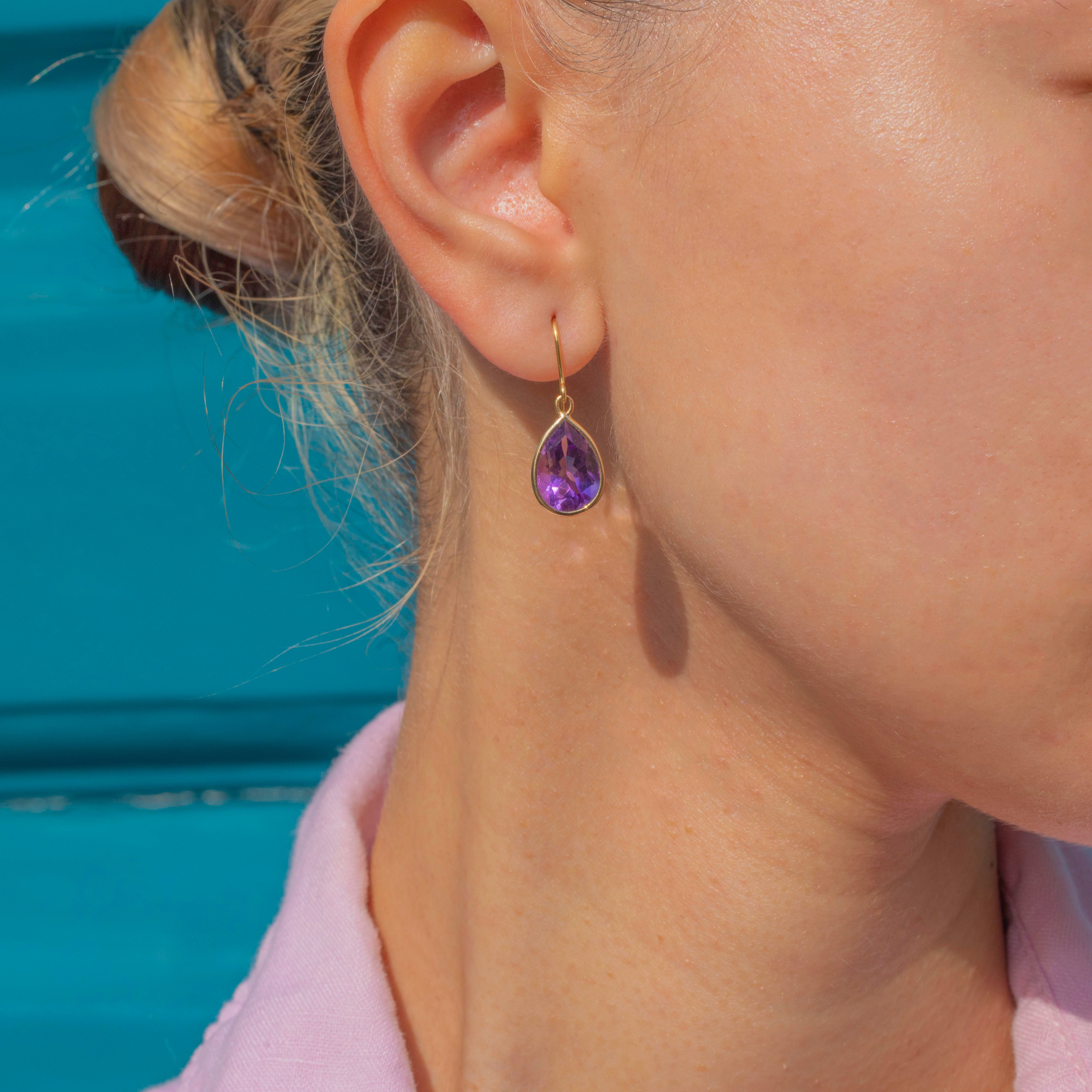 The Amethysts are set in bright and glossy 9ct Gold bezels and are suspended from elongated hooks, dancing with movement and adding ample vintage charm to your attire.