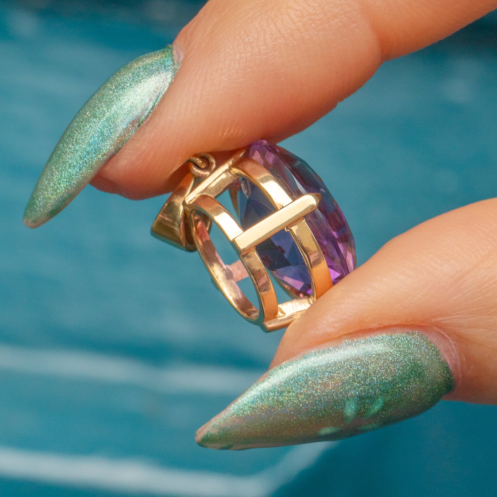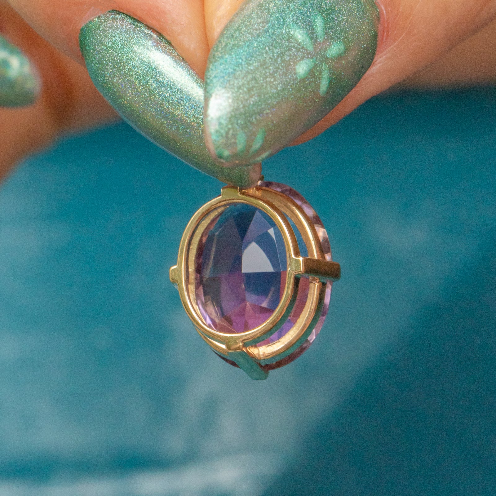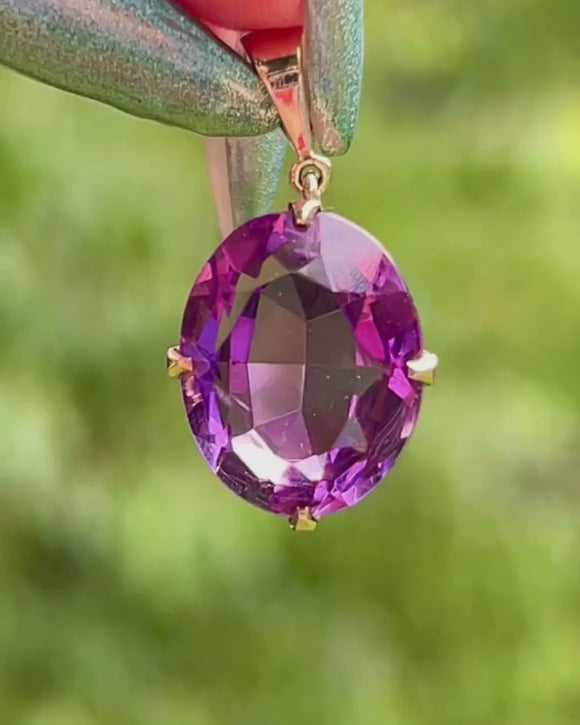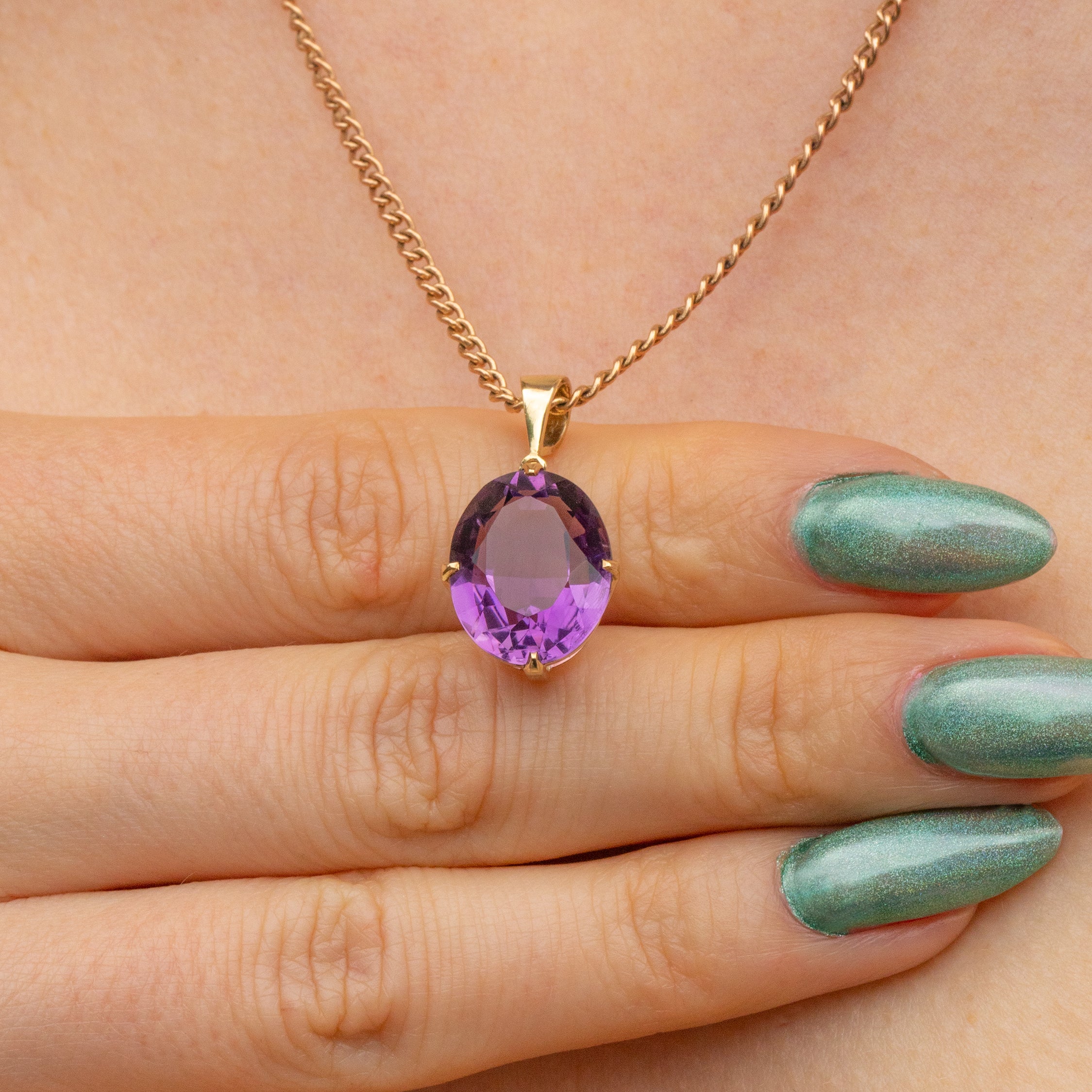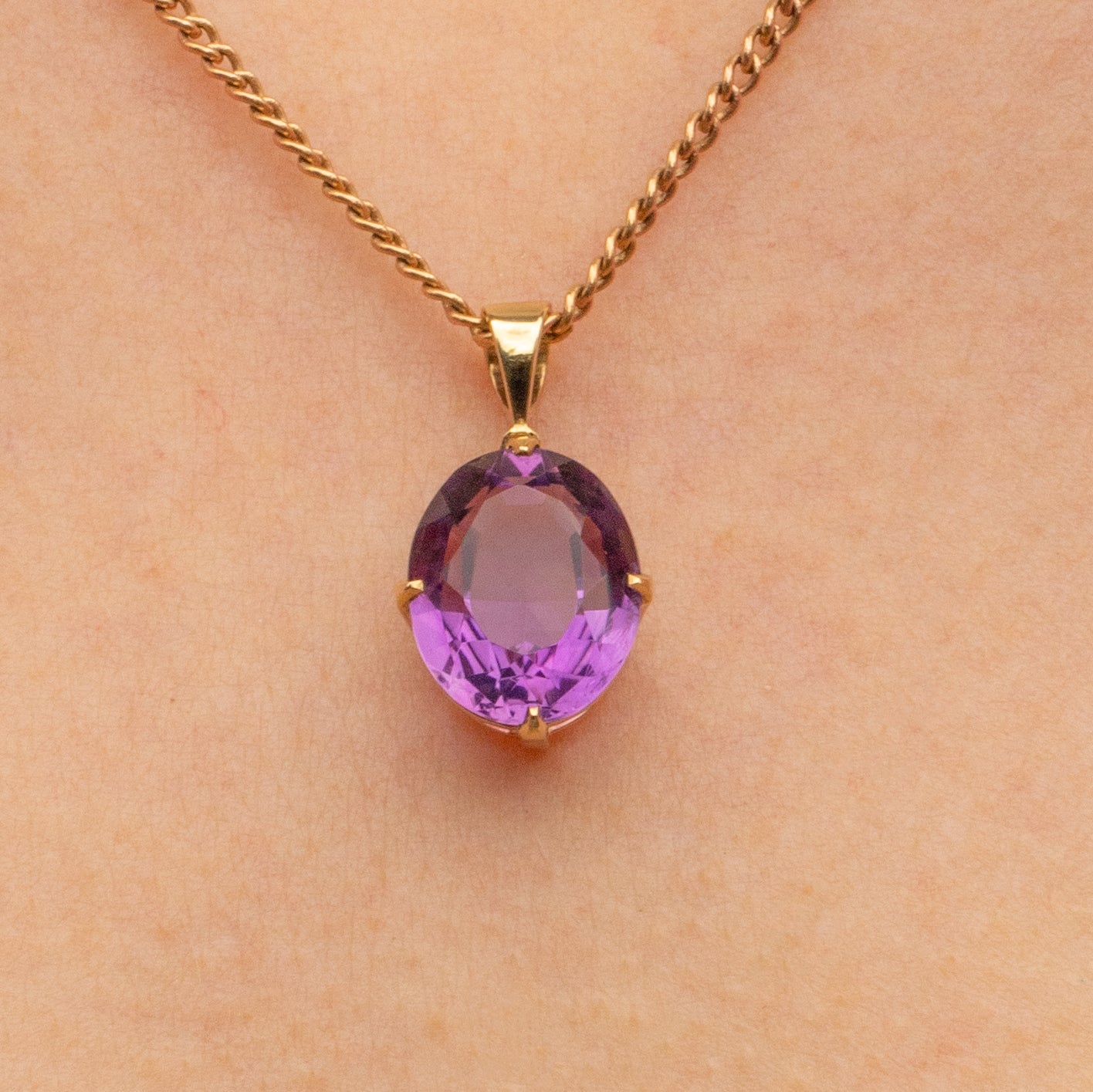 This 9ct Gold Amethyst pendant is a gorgeous treasure from the early 20th century. This antique pendant has a 5.80ct saturated oval Amethyst, clasped within buttery 9ct Gold claws.