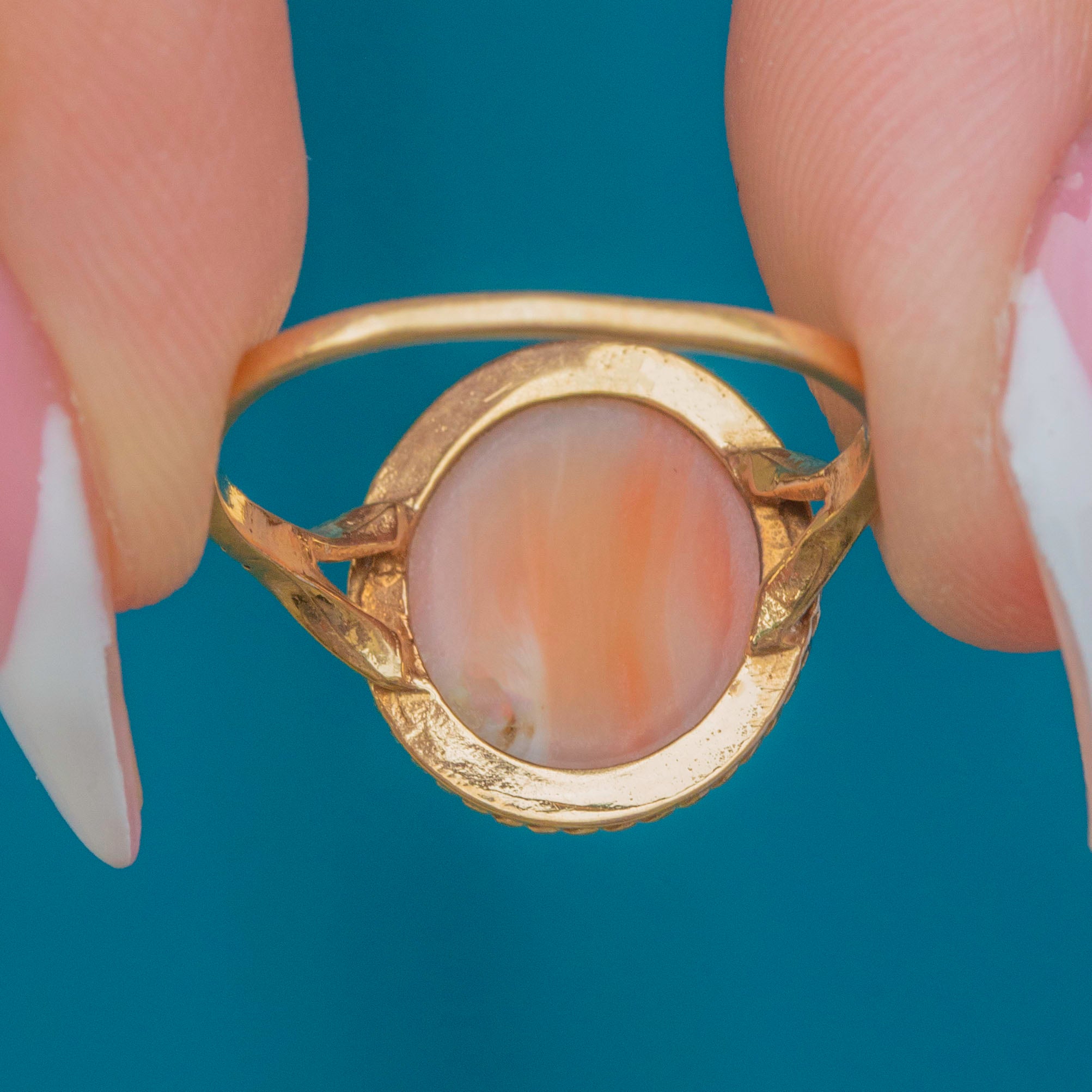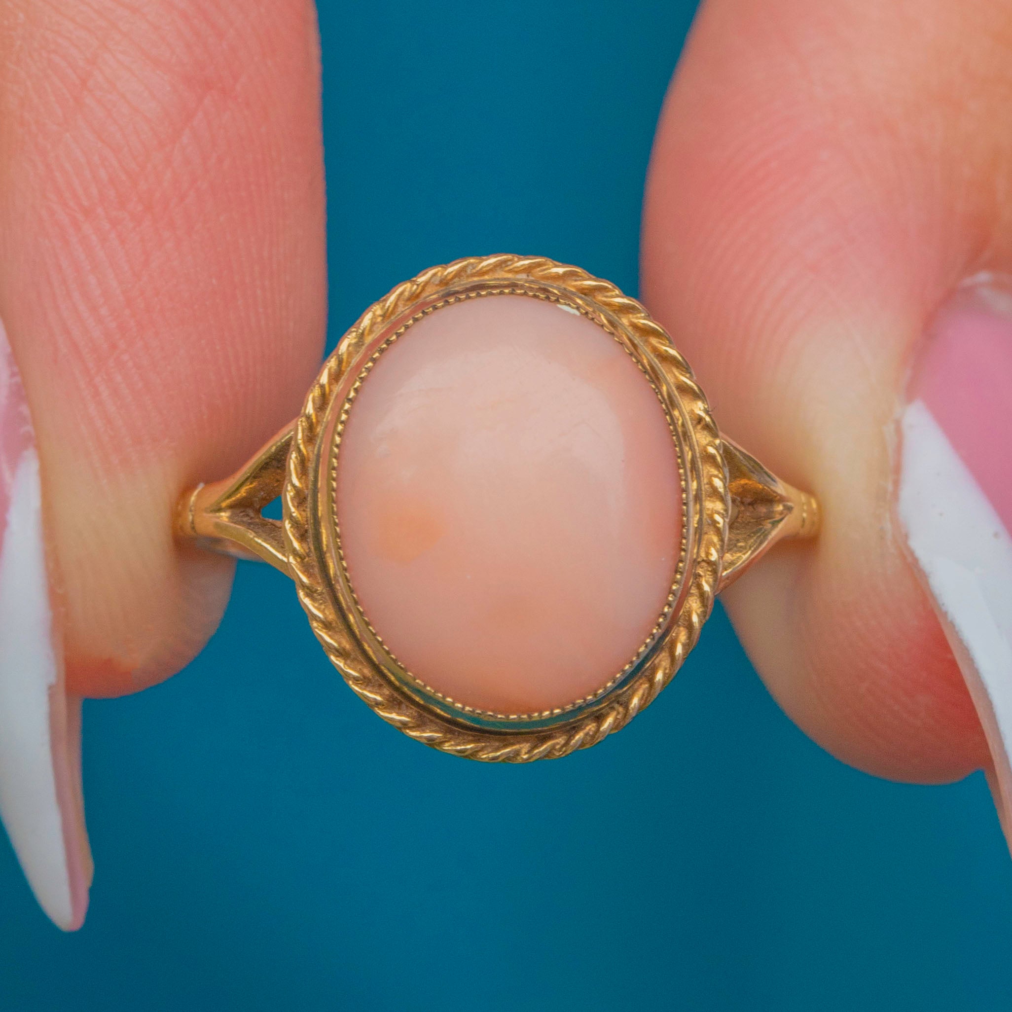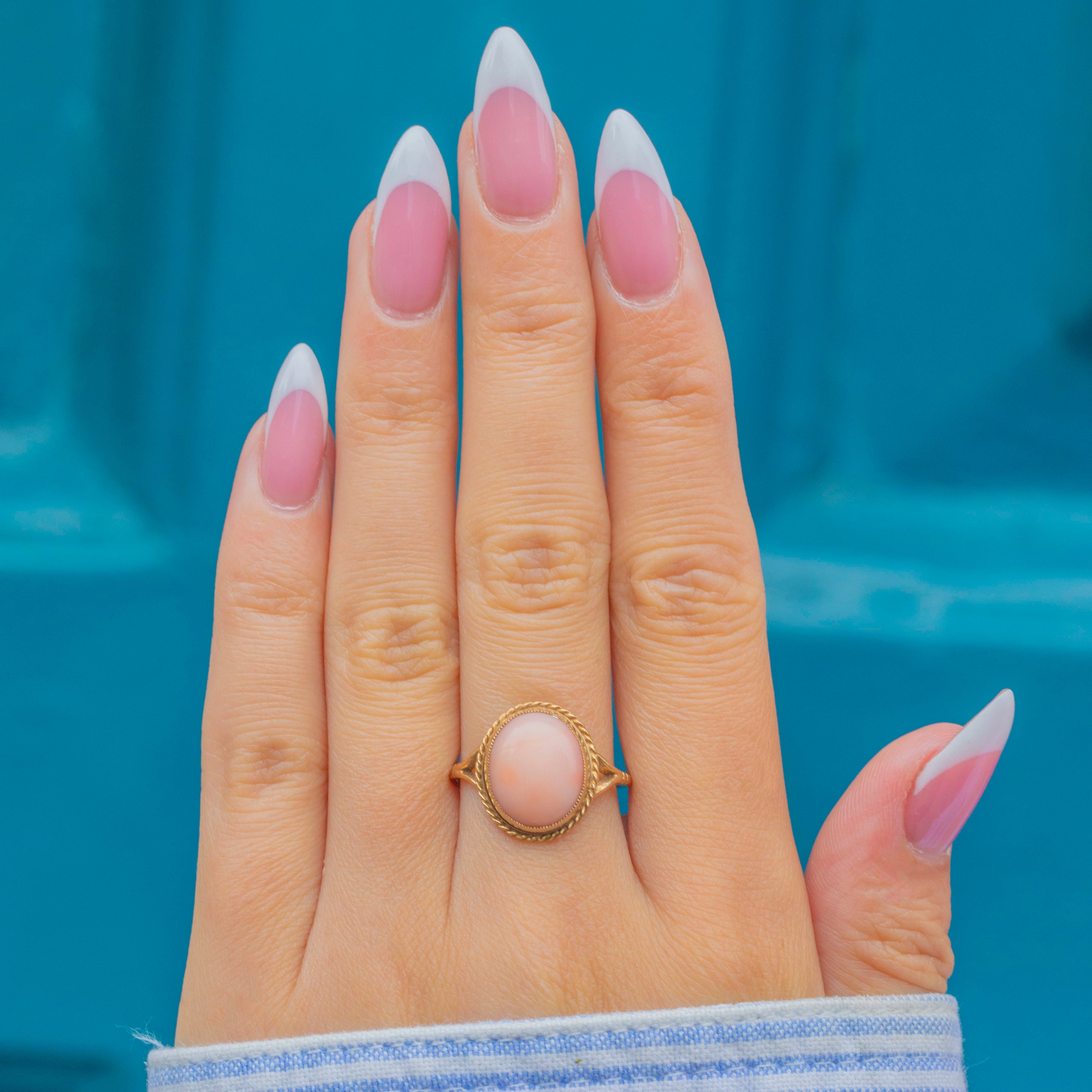 This Vintage 9ct Gold ring showcases a beautiful oval cabochon of Angel Skin Coral, celebrated for its delicate blush-pink hue and smooth, lustrous finish. The Coral is secured in a fine bezel setting with an elegant twisted rope border, adding subtle texture and definition. Tapered shoulders lead to a slender shank, creating a refined silhouette.