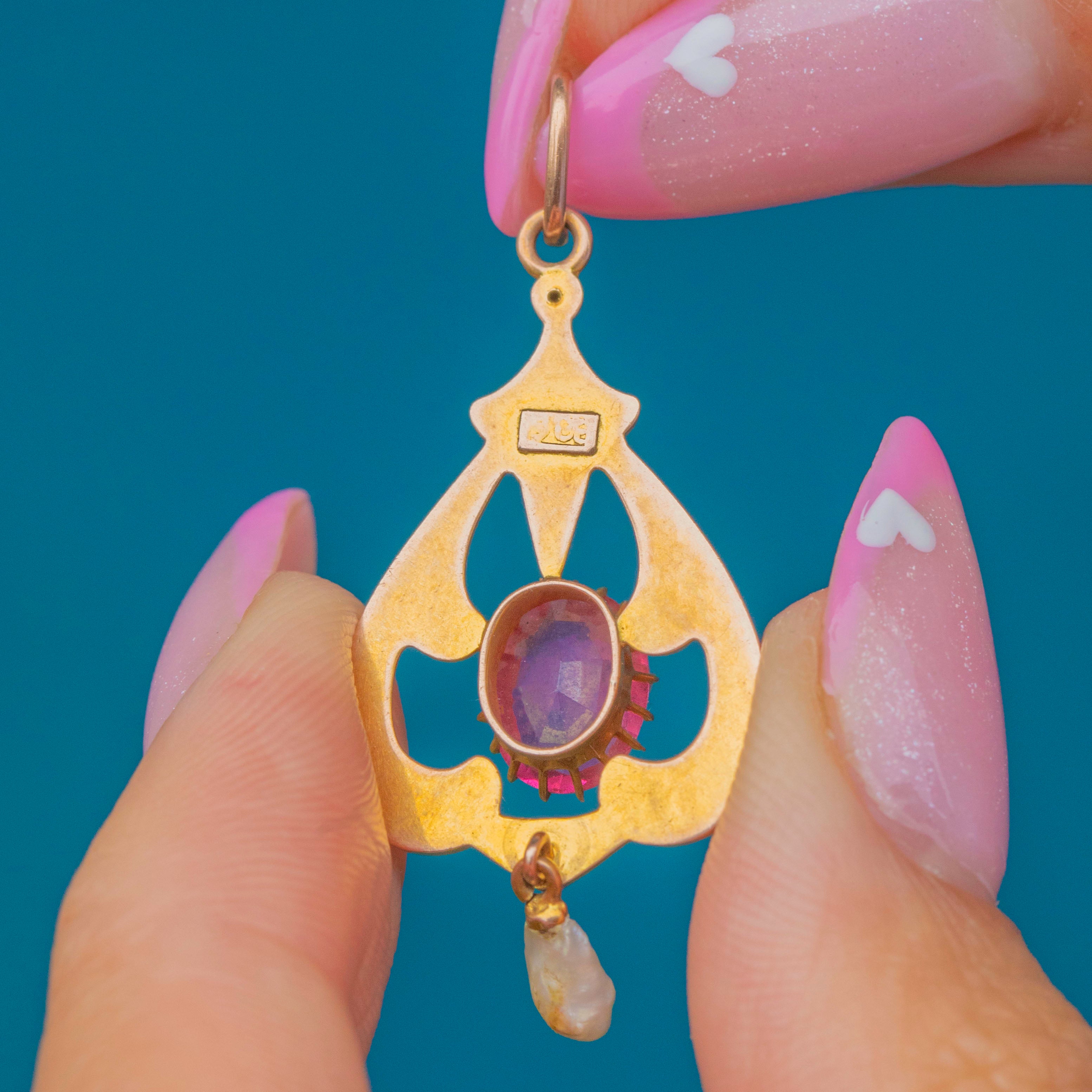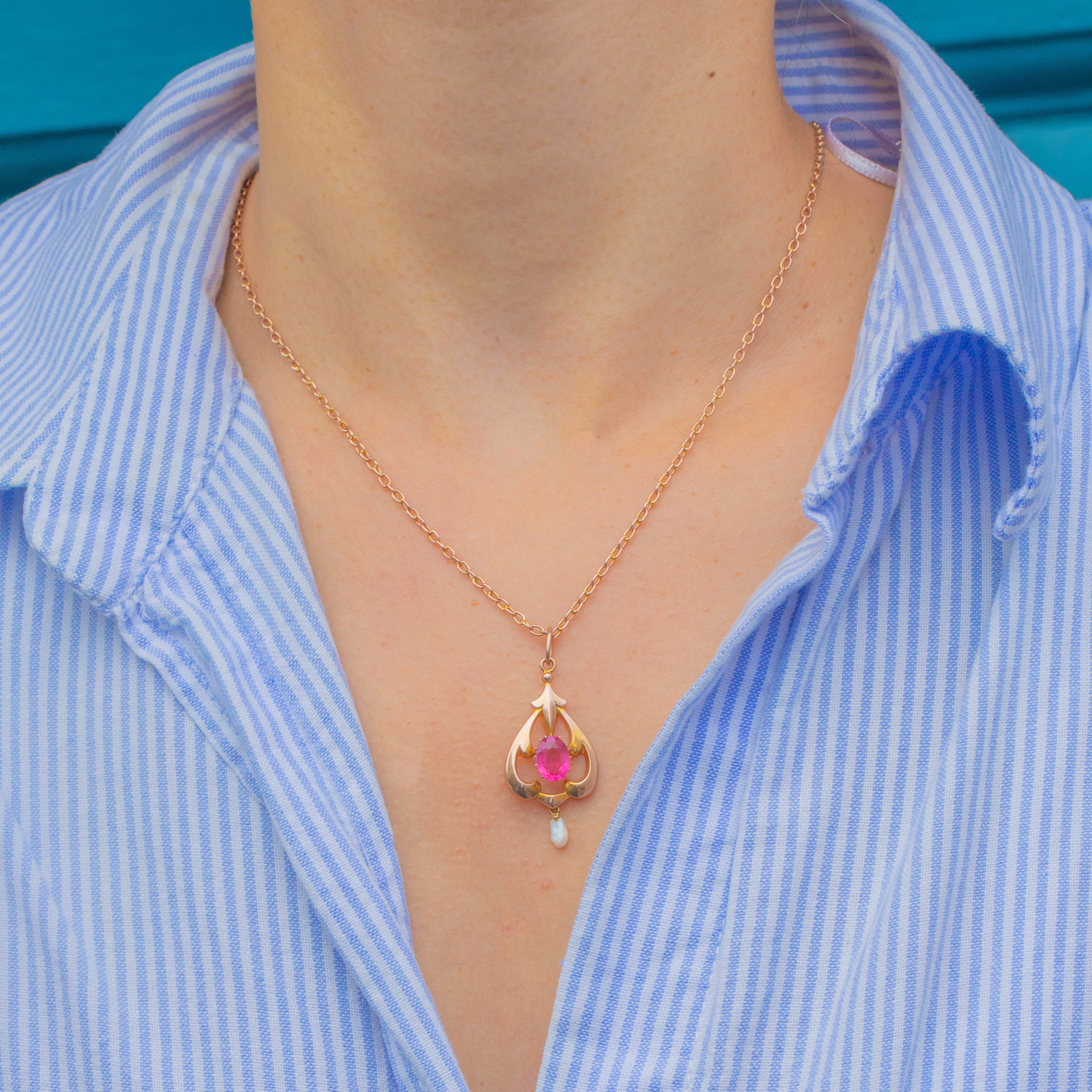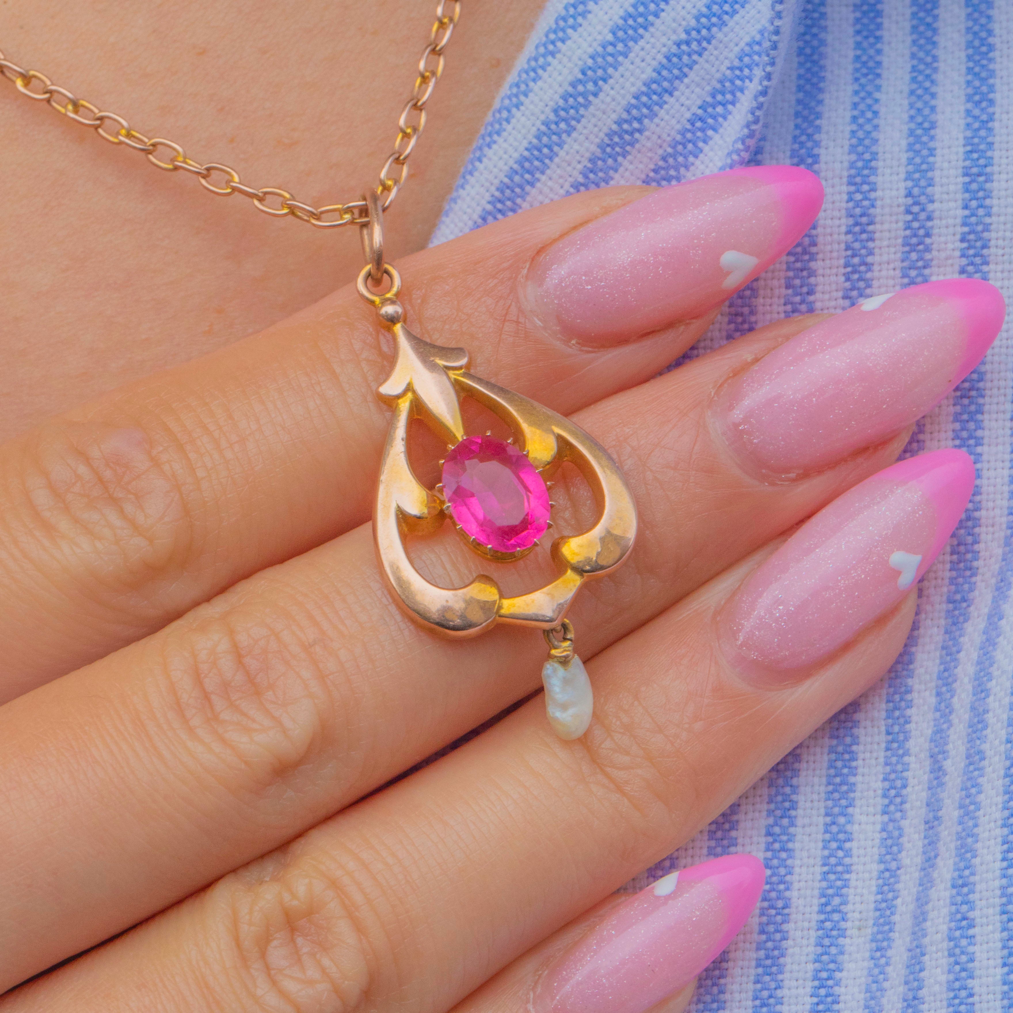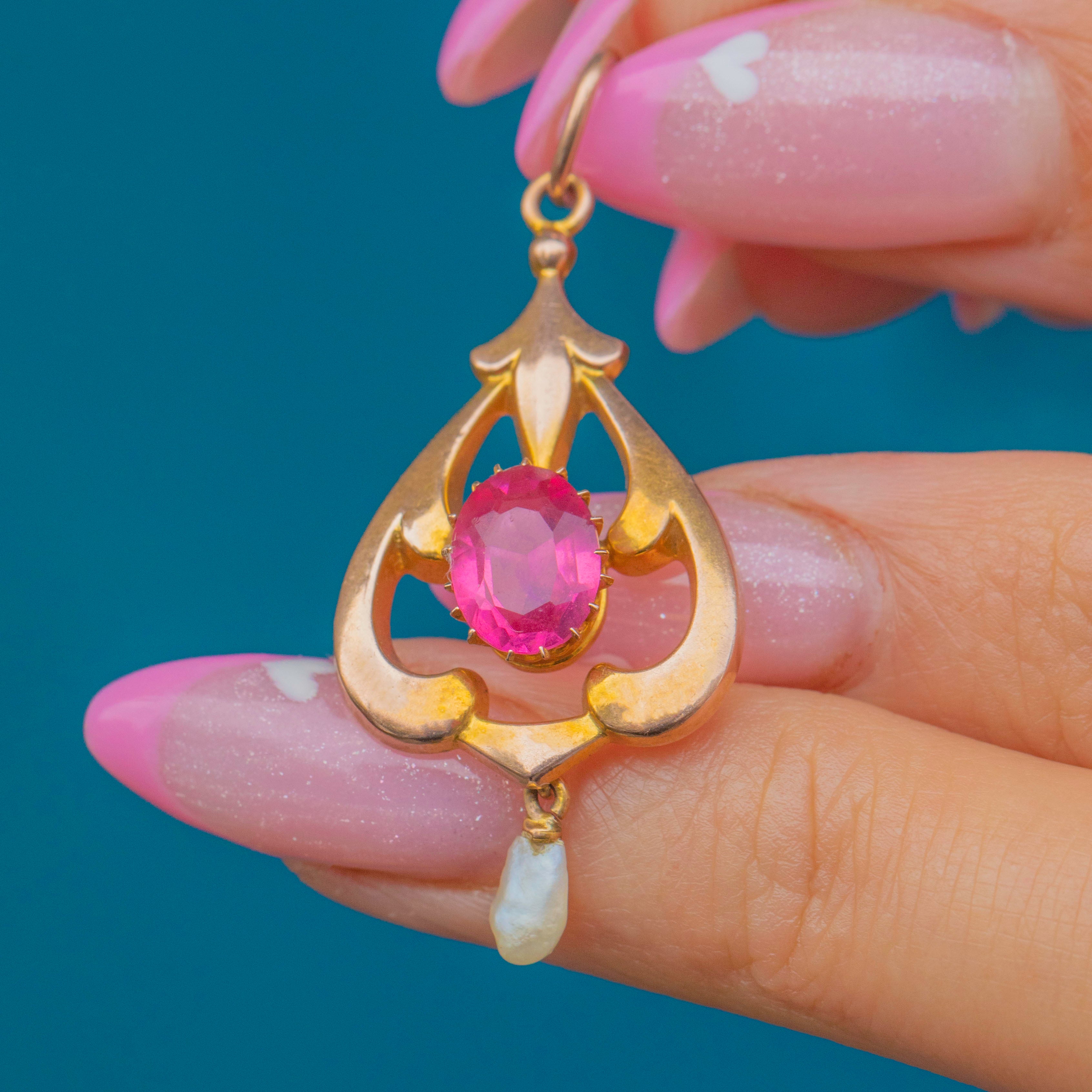 This exquisite Art Nouveau pendant captures the elegance and romanticism of the early 20th century. Crafted in 9ct Gold, it showcases a glowing pink Paste centre stone framed by graceful openwork scrolls, and finished with a natural Rice Pearl drop that moves delicately with the wearer.