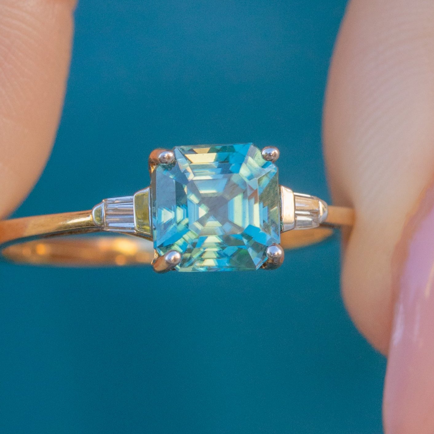 Add some glitz to your jewellery box with this 9ct Gold Asscher-cut Zircon ring! Her signature blue colour can be described as nothing less than the perfect Cinderella blue, and sits majestically between two baguette-cut Diamonds with a twinkle that dances in the light.