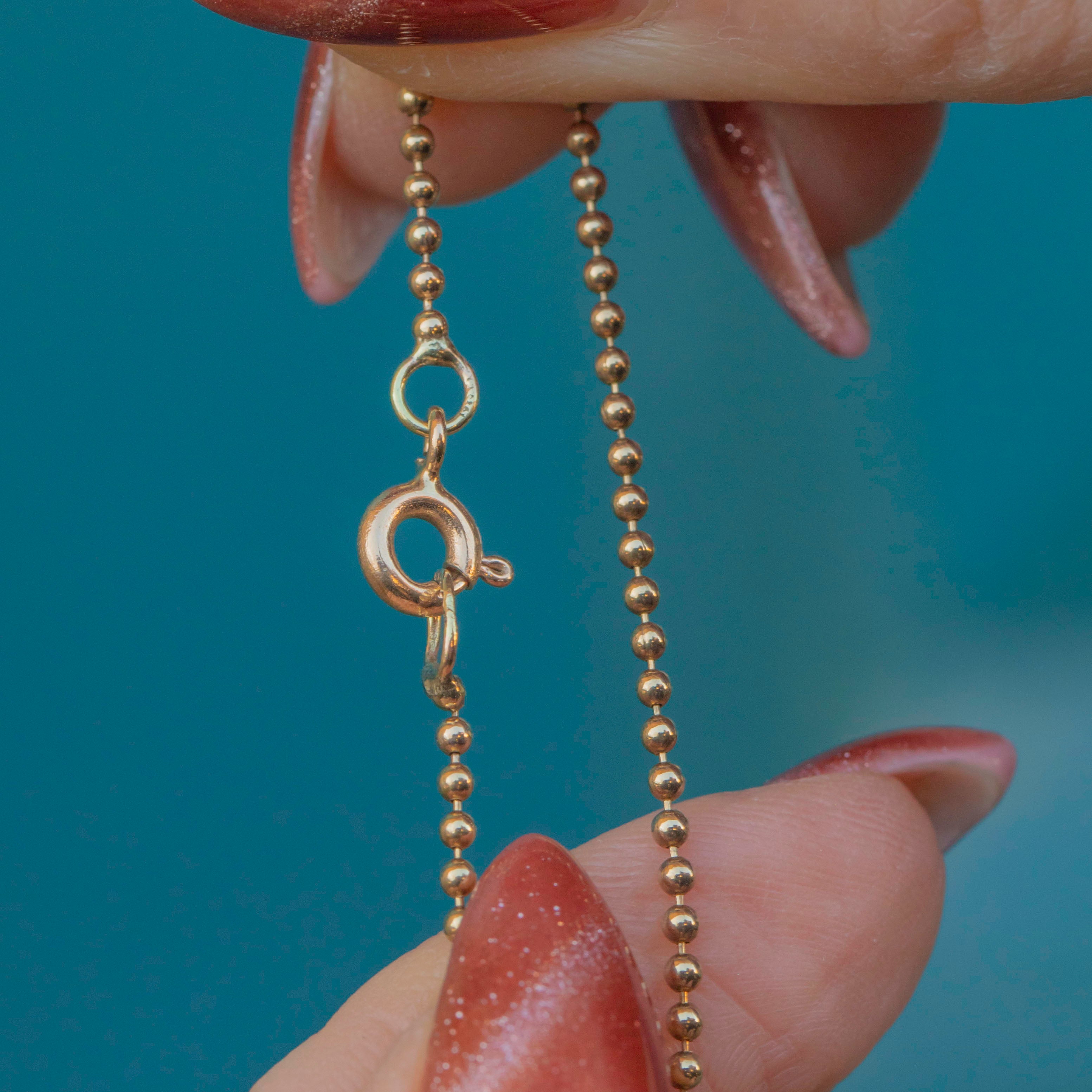 This 9ct Gold ball bead chain will bring a unique edge to your repertoire! The 16" length is crafted entirely from bright 9ct Gold and is made up of dainty ball details that will add texture to your neck stack.