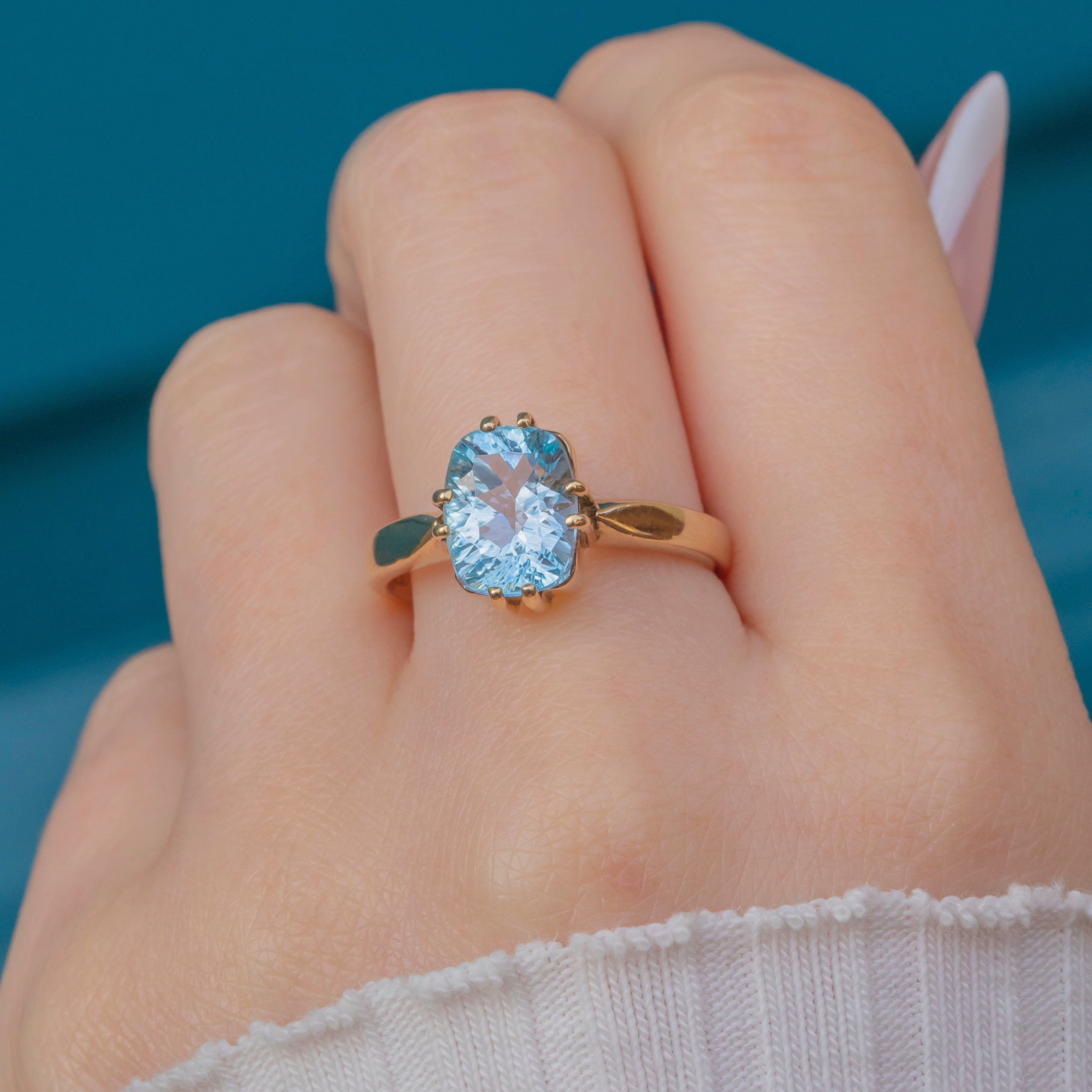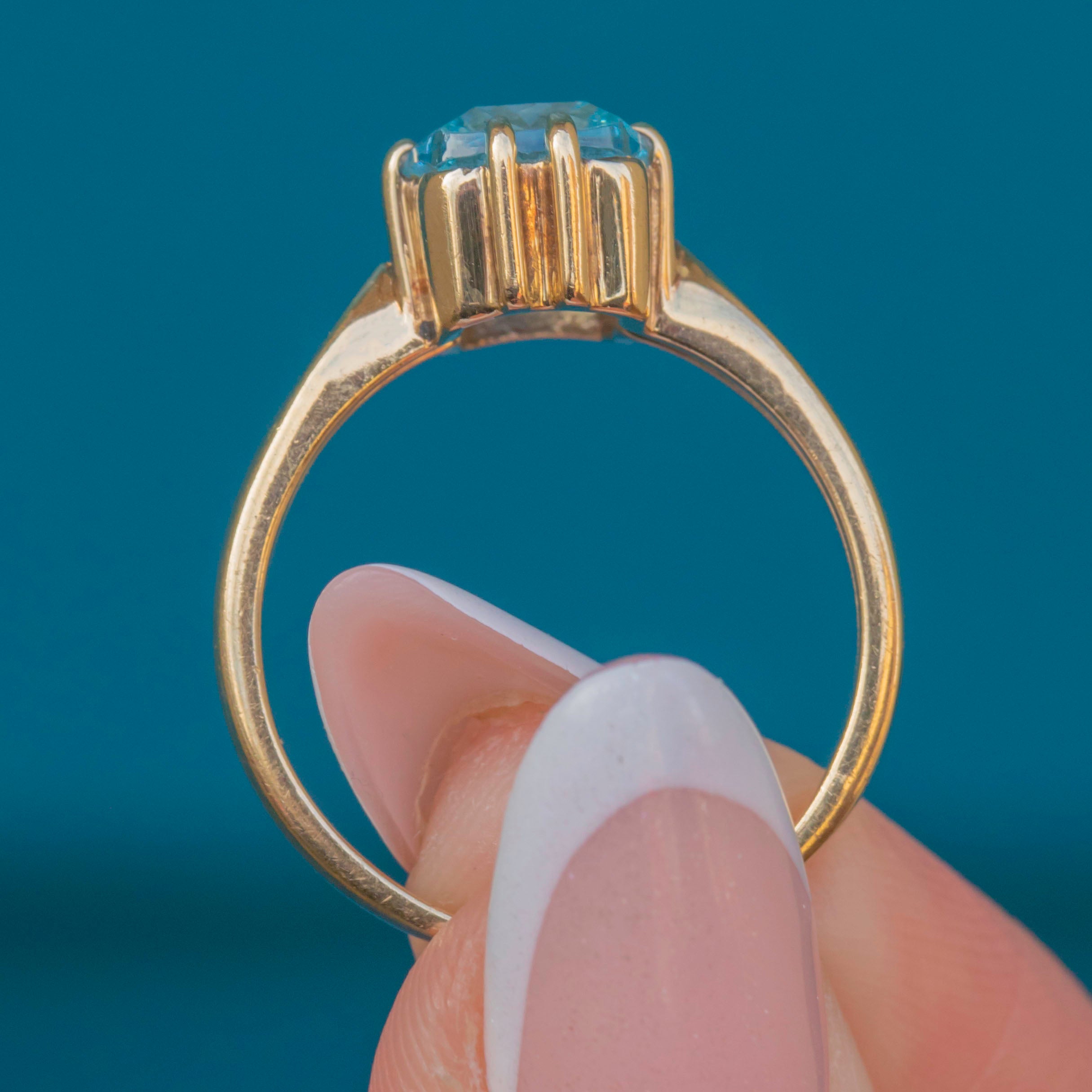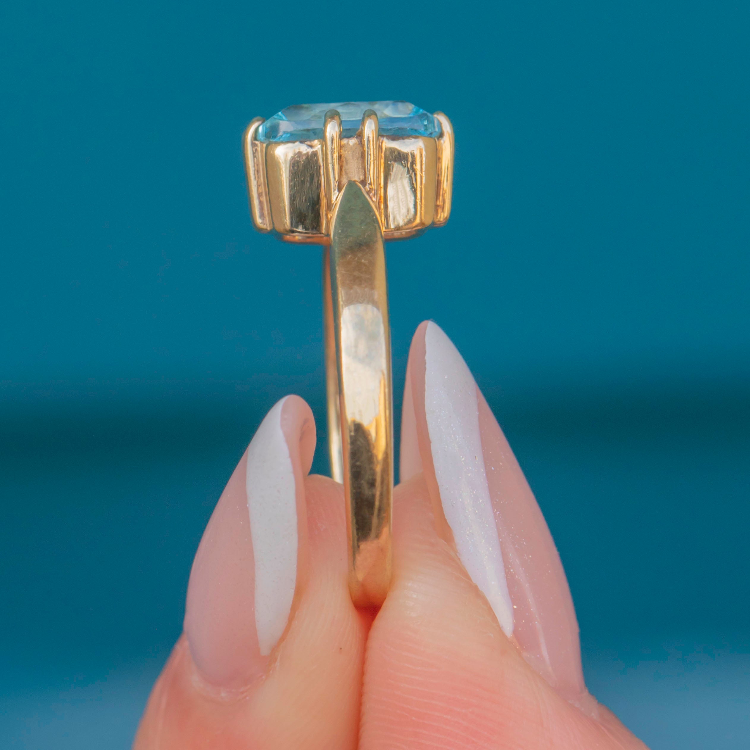 EXCELLENT: This 9ct Gold blue Topaz solitaire ring is in fabulous condition. The Topaz is radiant, free from any scuffs or scratches, and set securely within claw settings. The Gold is glossy and lustrous, with only very minor signs of wear which are difficult to spot without a loupe. In excellent condition, she's a must-have piece!