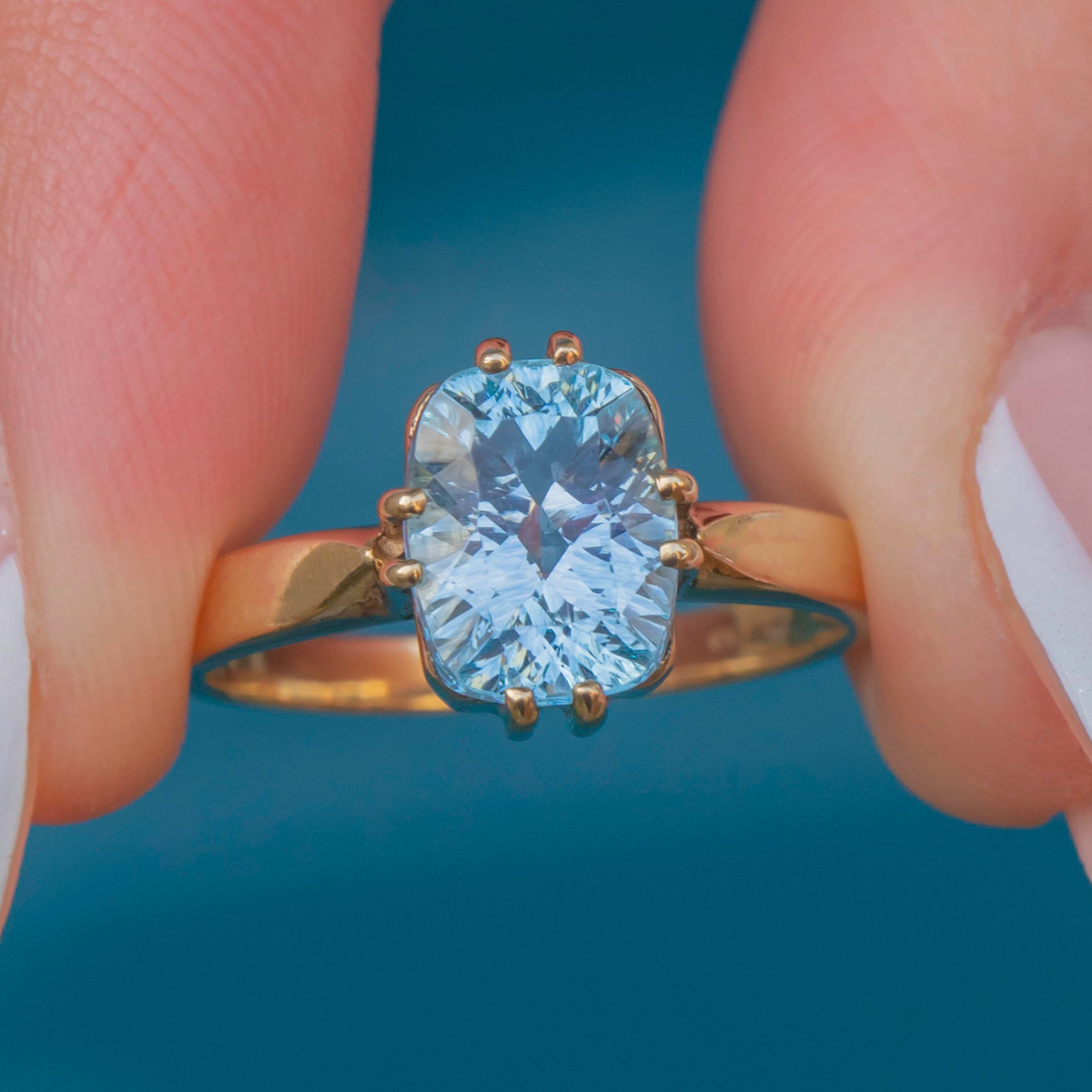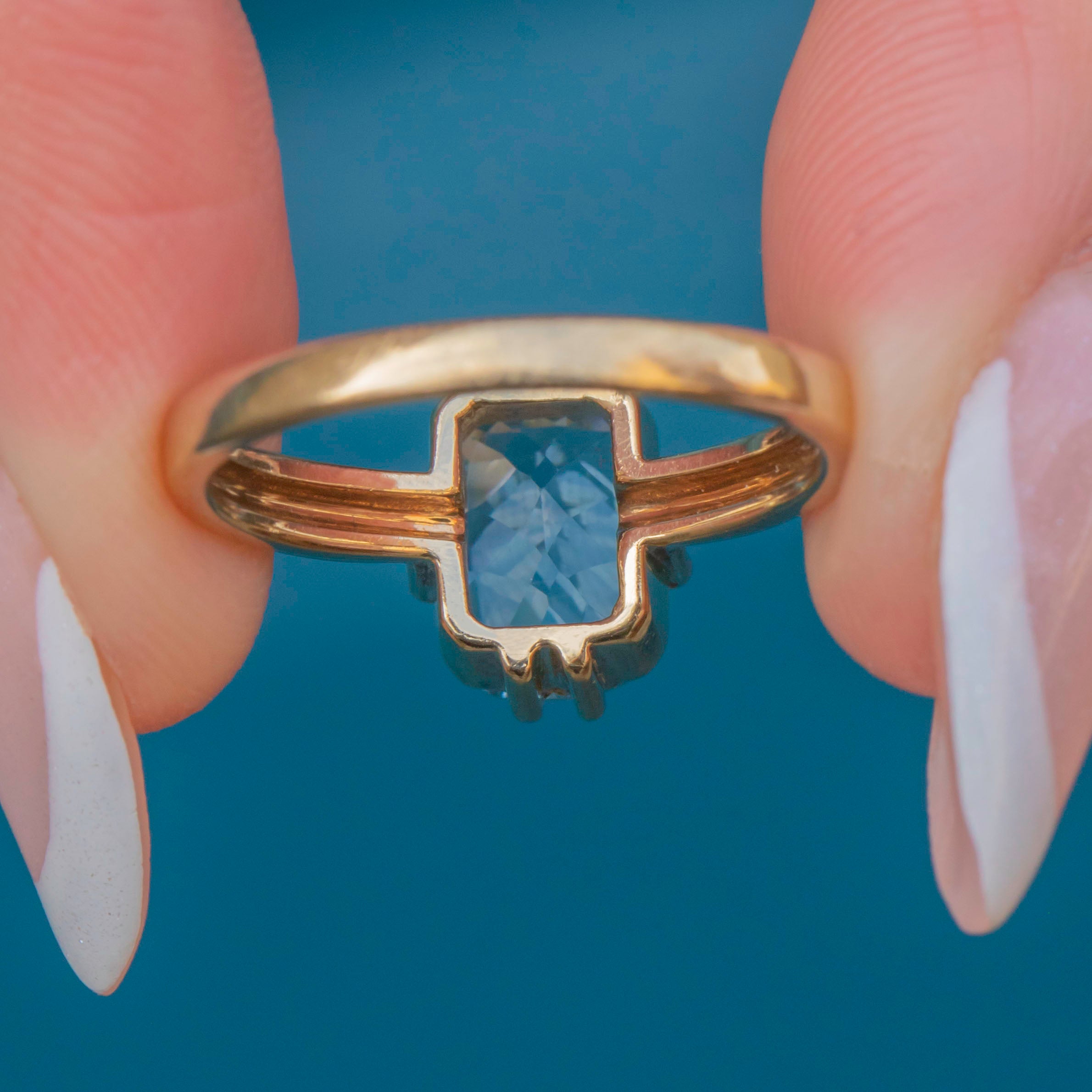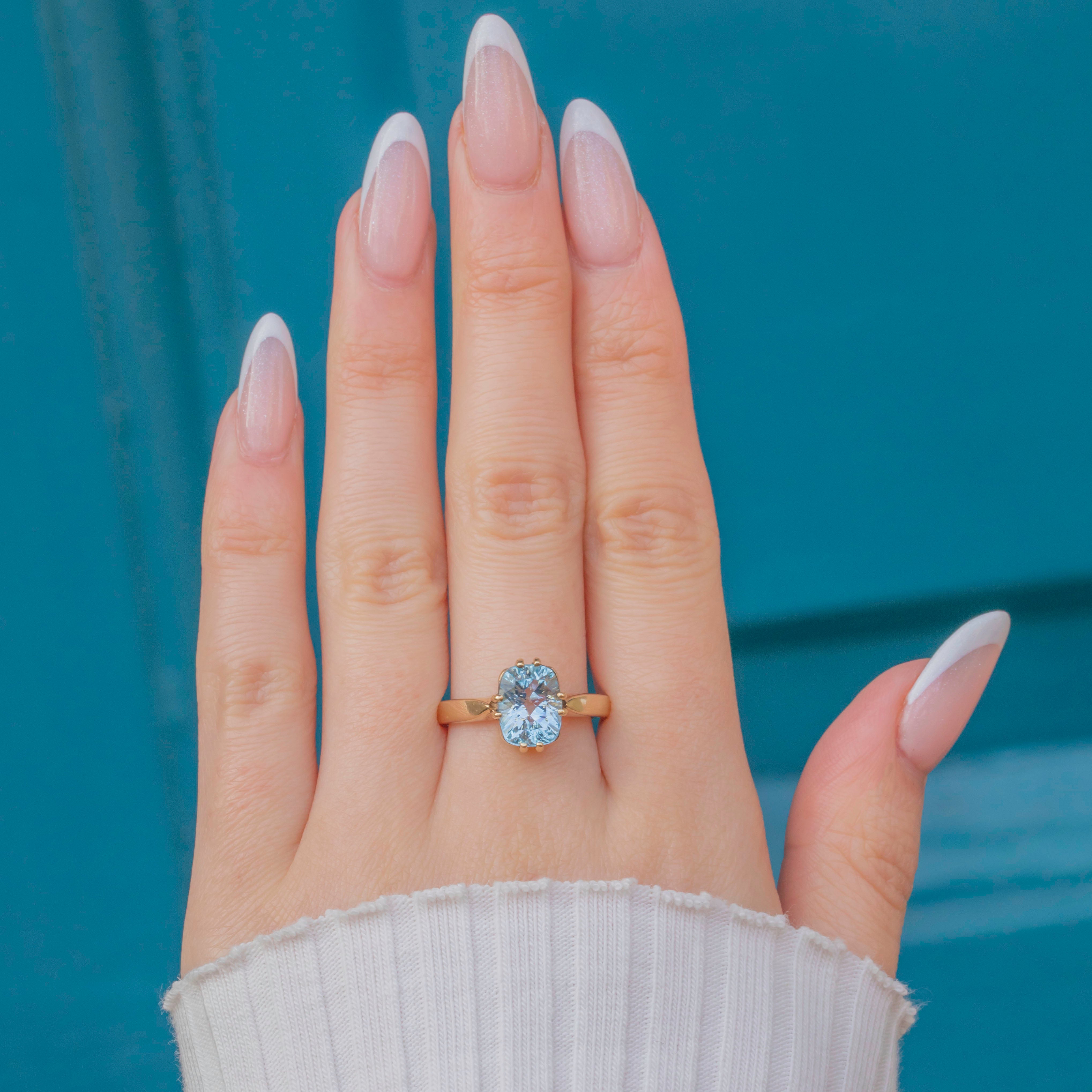 EXCELLENT: This 9ct Gold blue Topaz solitaire ring is in fabulous condition. The Topaz is radiant, free from any scuffs or scratches, and set securely within claw settings. The Gold is glossy and lustrous, with only very minor signs of wear which are difficult to spot without a loupe. In excellent condition, she's a must-have piece!