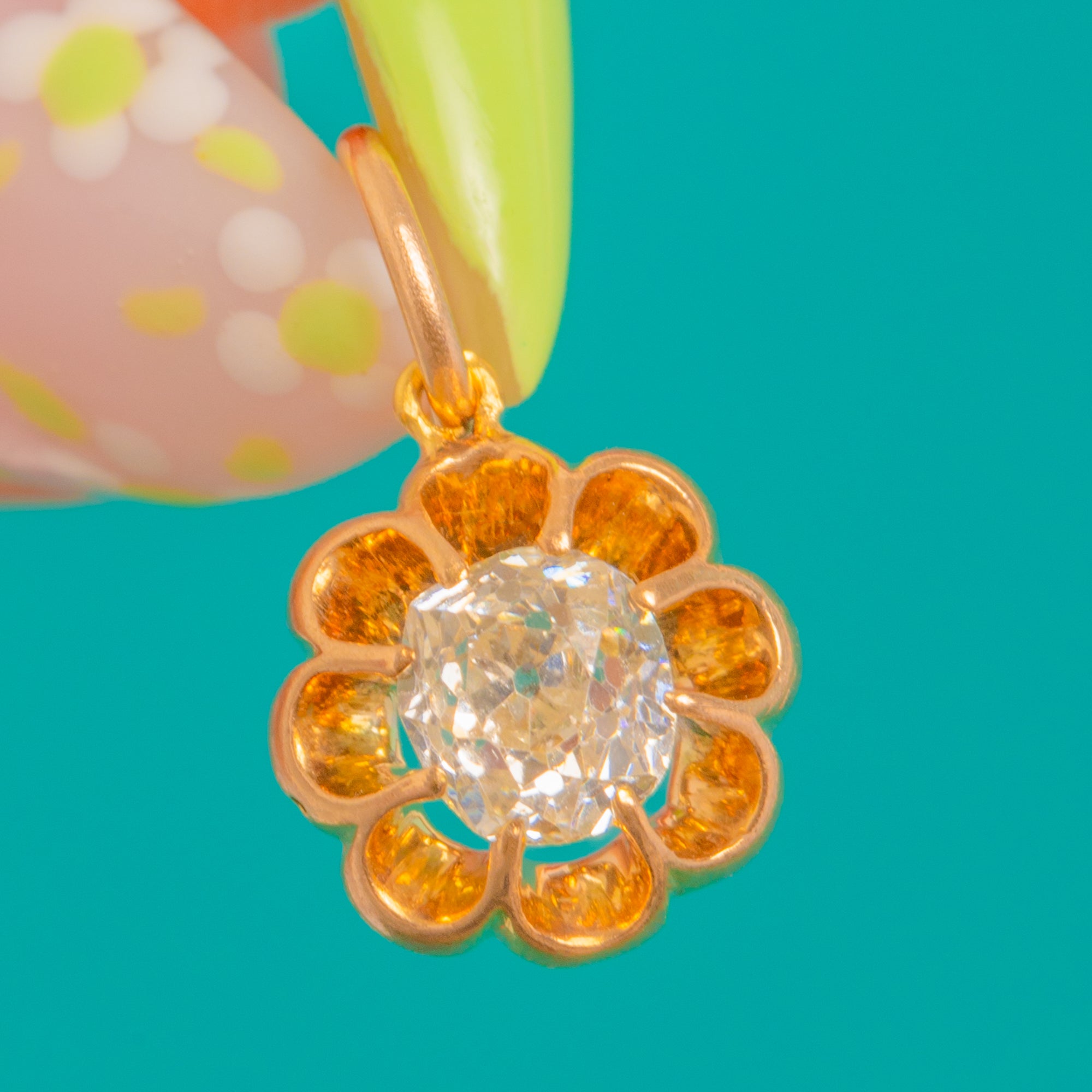 EXCELLENT: The Old Mine Cut Diamond is bright with natural inclusions visible under magnification and only minimal facet wear commensurate with age. The 9ct Gold buttercup setting is secure and well-preserved with light surface wear; the hasp and jump ring are sound with a small solder mark visible. Overall beautifully cared for and ready to wear.