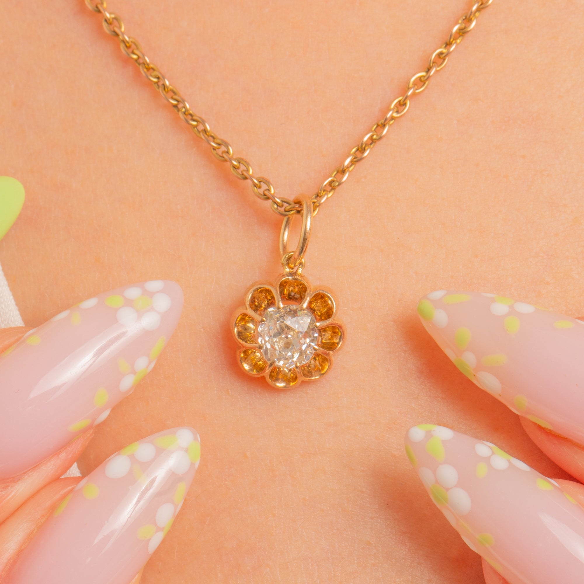 A sweet Victorian buttercup charm crafted in 9ct Yellow Gold, centred with a lively Natural Old Mine Cut Diamond of approximately 0.40ct. The Diamond nestles within a classic scalloped eight-petal cup, its cushioned outline and antique faceting catching the light with a romantic, candlelit twinkle. Petite yet radiant, it brings a warm golden glow and timeless floral elegance to any curation.