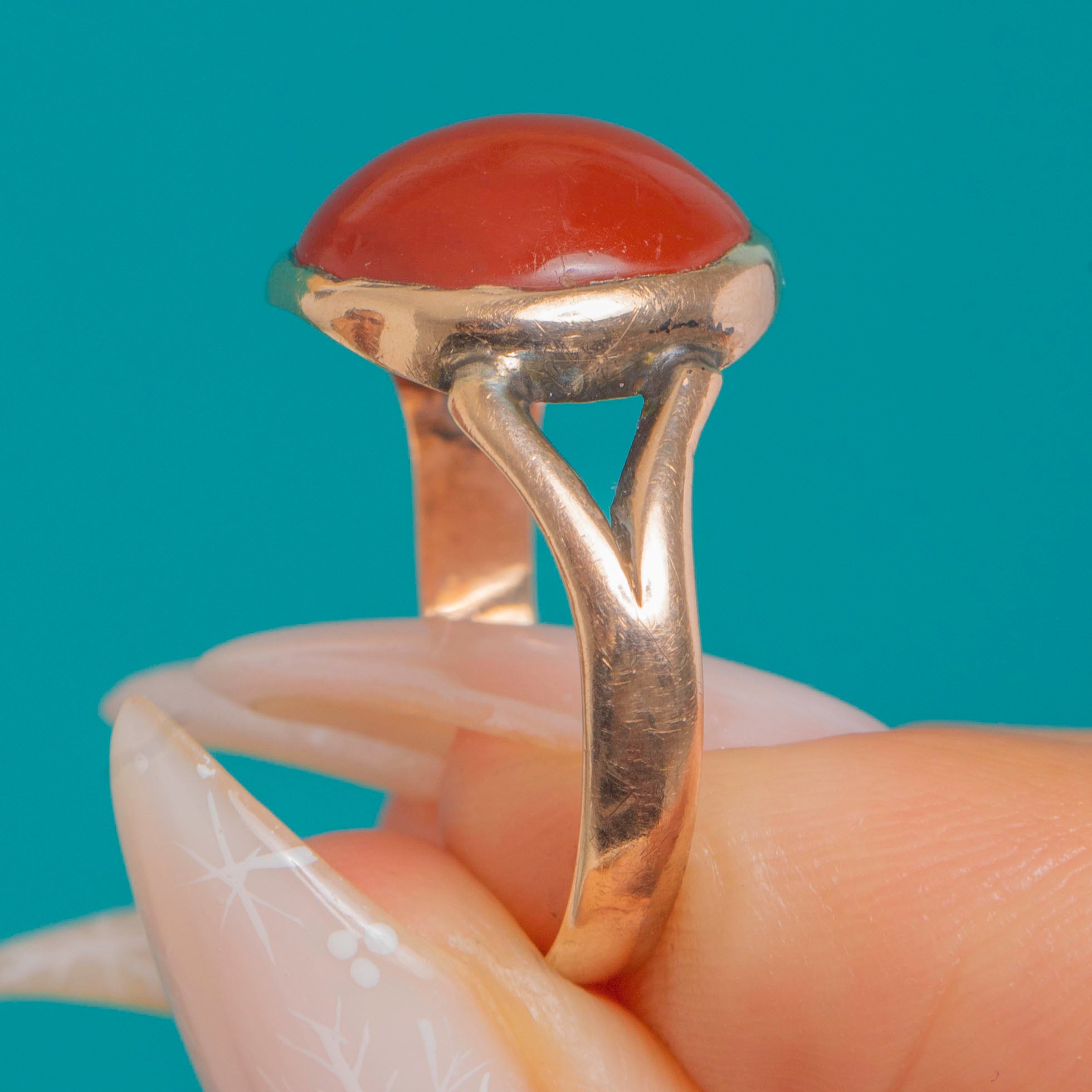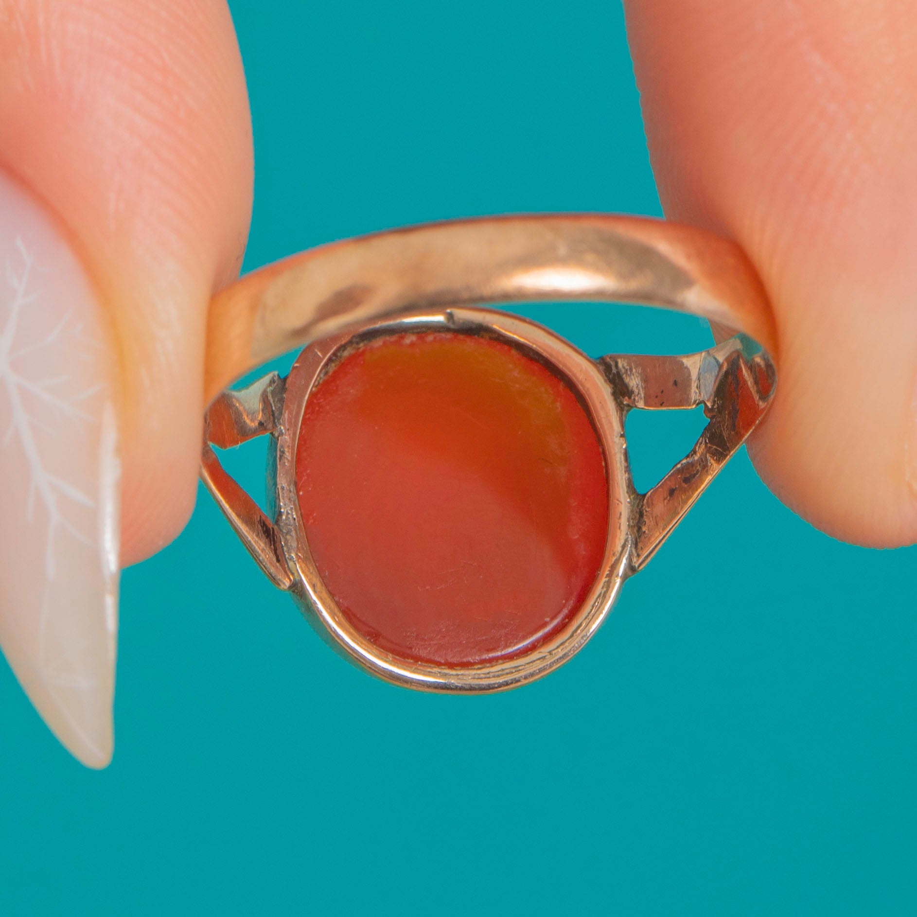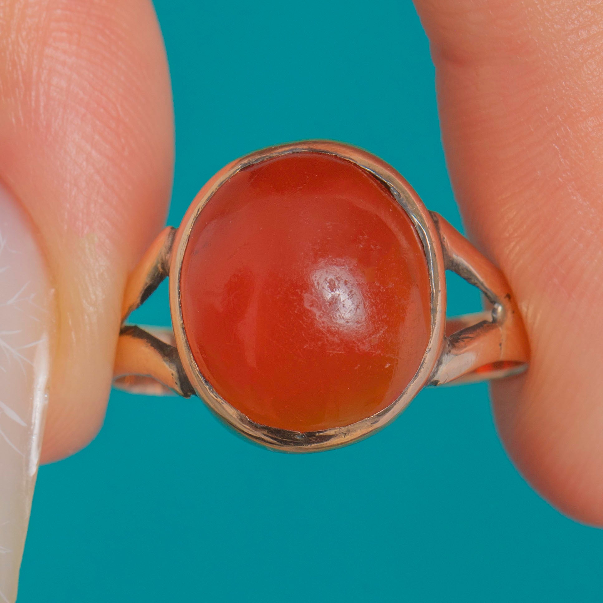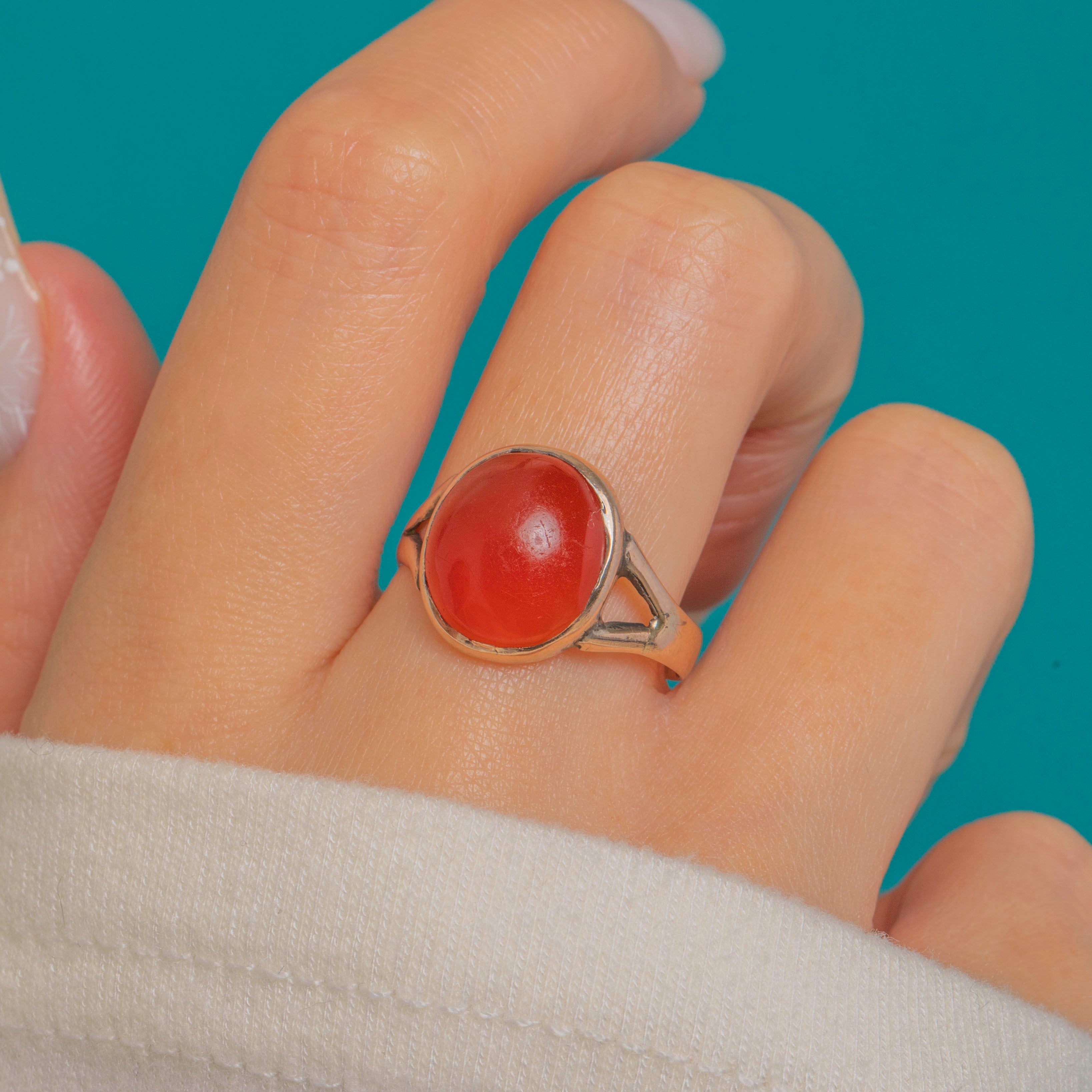 A timeless Victorian ring in warm 9ct Gold, set with a glowing oval Carnelian cabochon. The gem’s rich red-orange translucence is showcased in a smooth rub-over bezel with an open back to invite the light, lending an elegant, even glow across the dome.